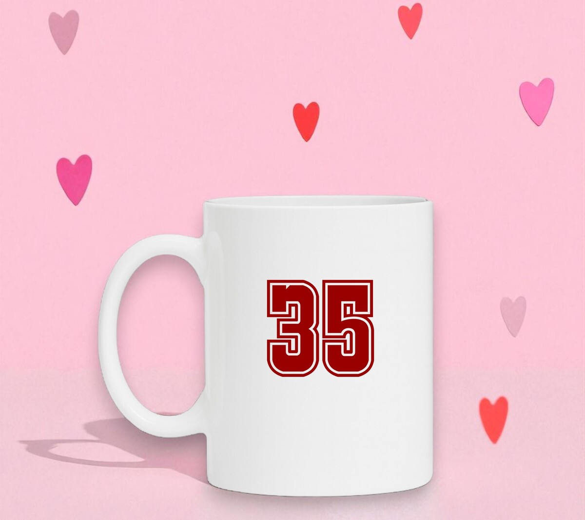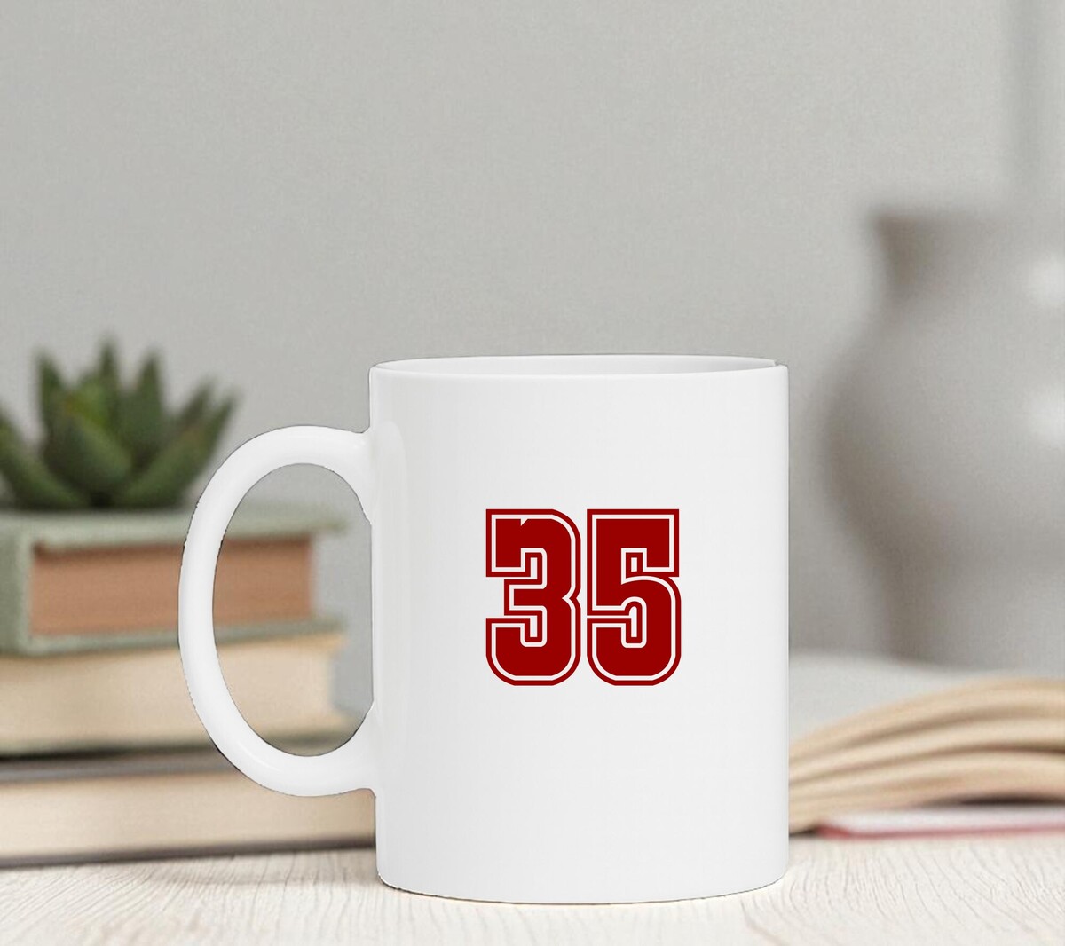 Een witte mok van 9cm hoog met het cijfer 35 als opdruk.
