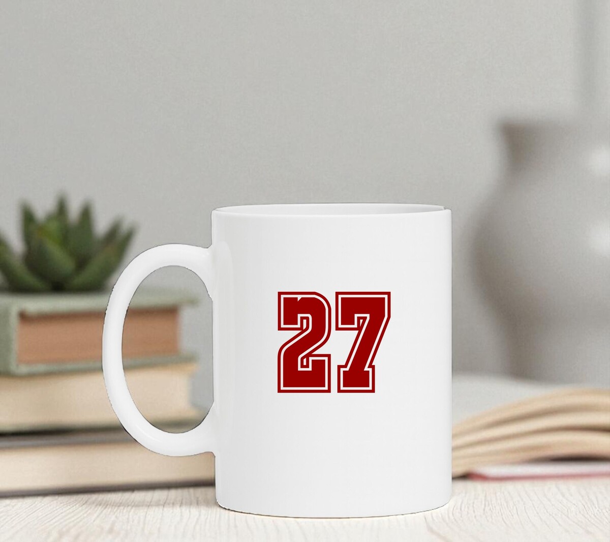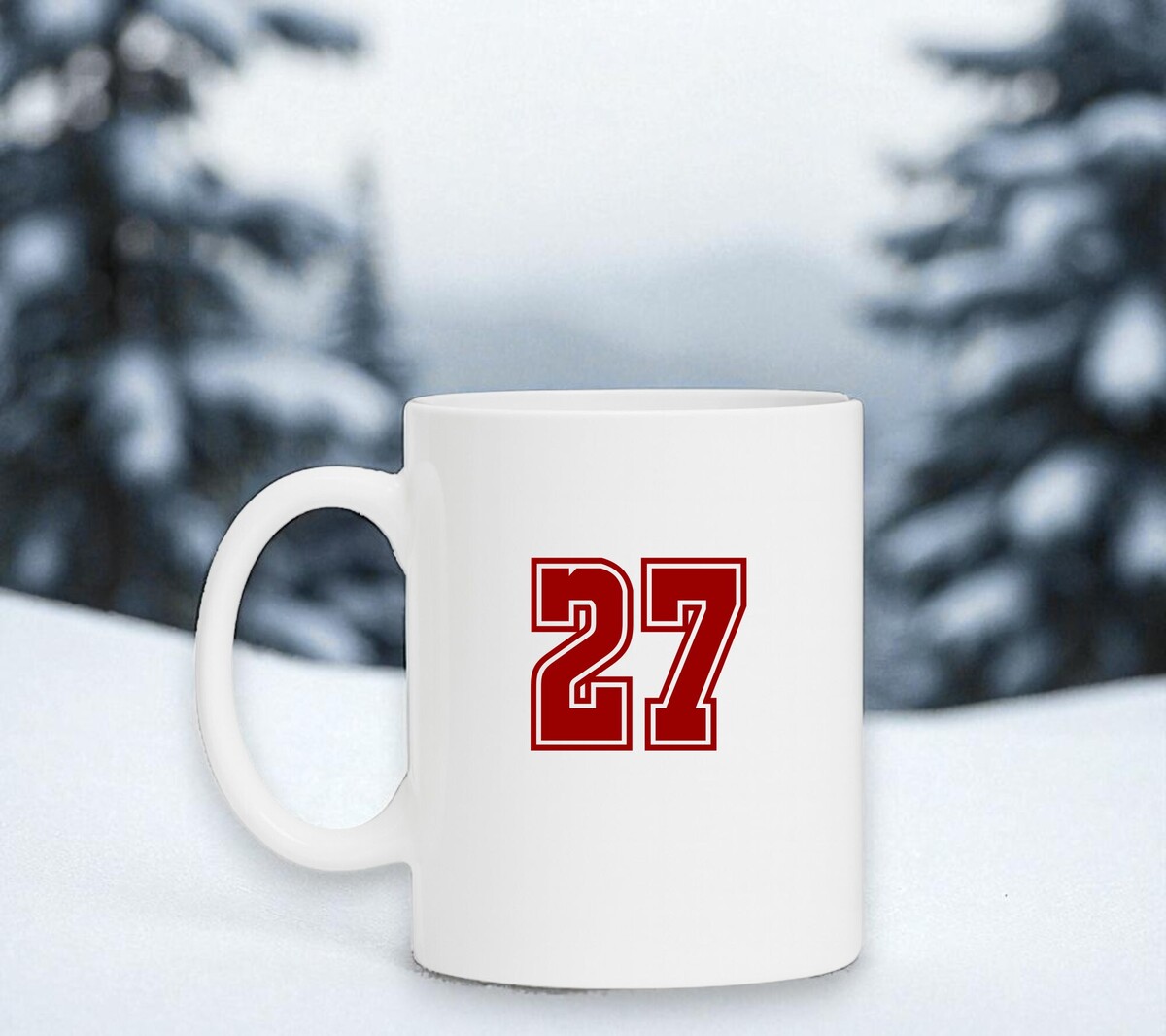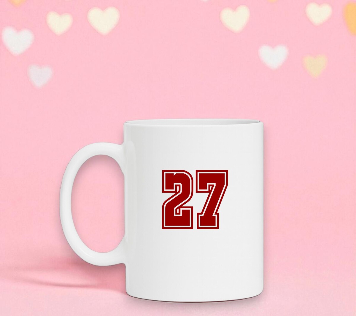 Mokje wit met het getal 27 als opdruk in de kleur robijnrood.