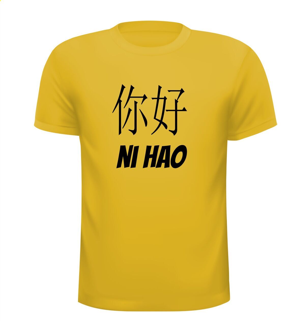 Ni hao betekend in het Chinees ‘Hallo’ Op dit shirt is dit ook in het chinees geschreven. Dit maakt het shirt erg leuk om te dragen als je op vakantie gaat naar China!