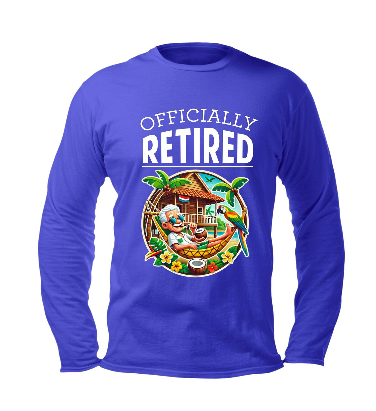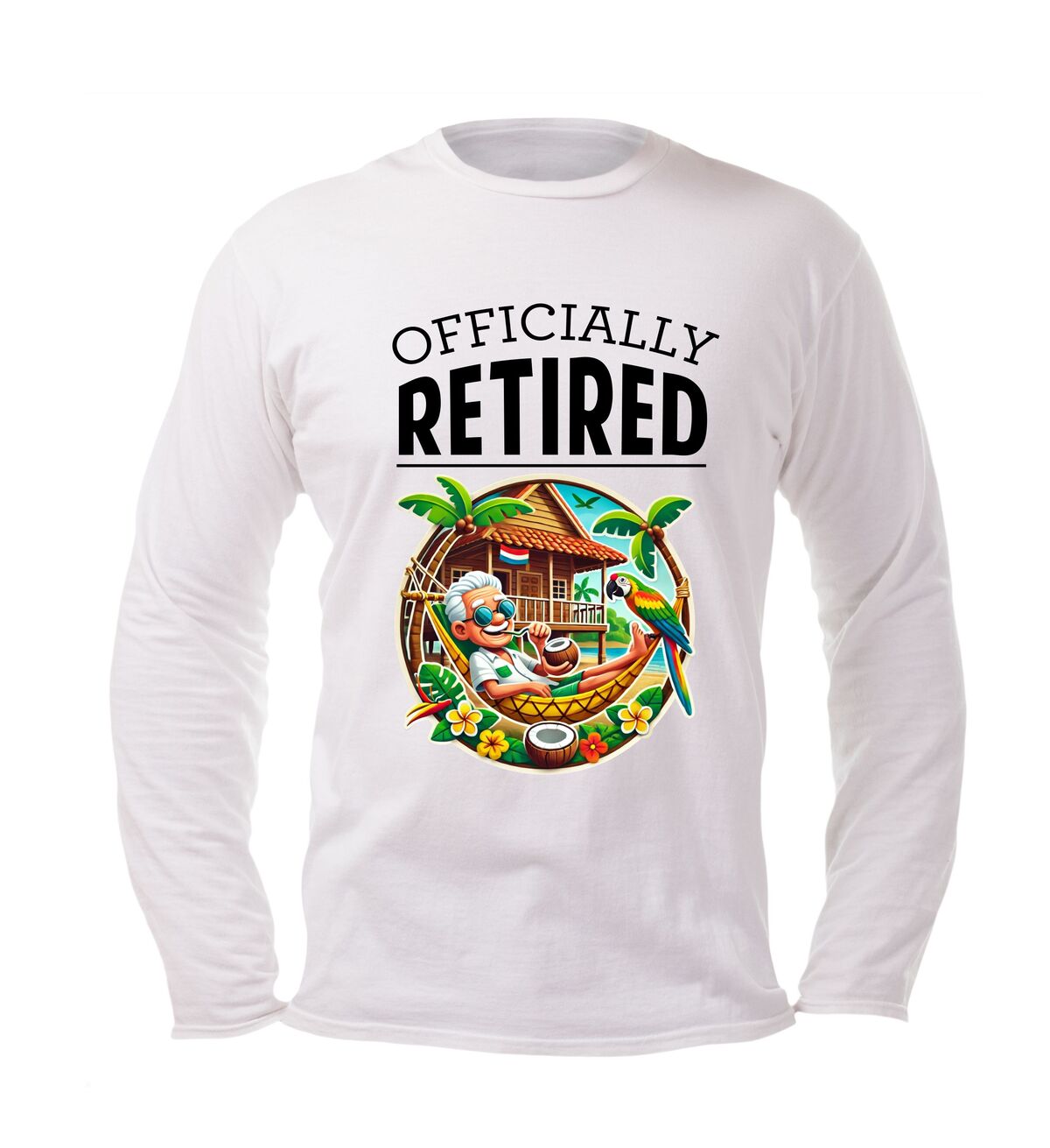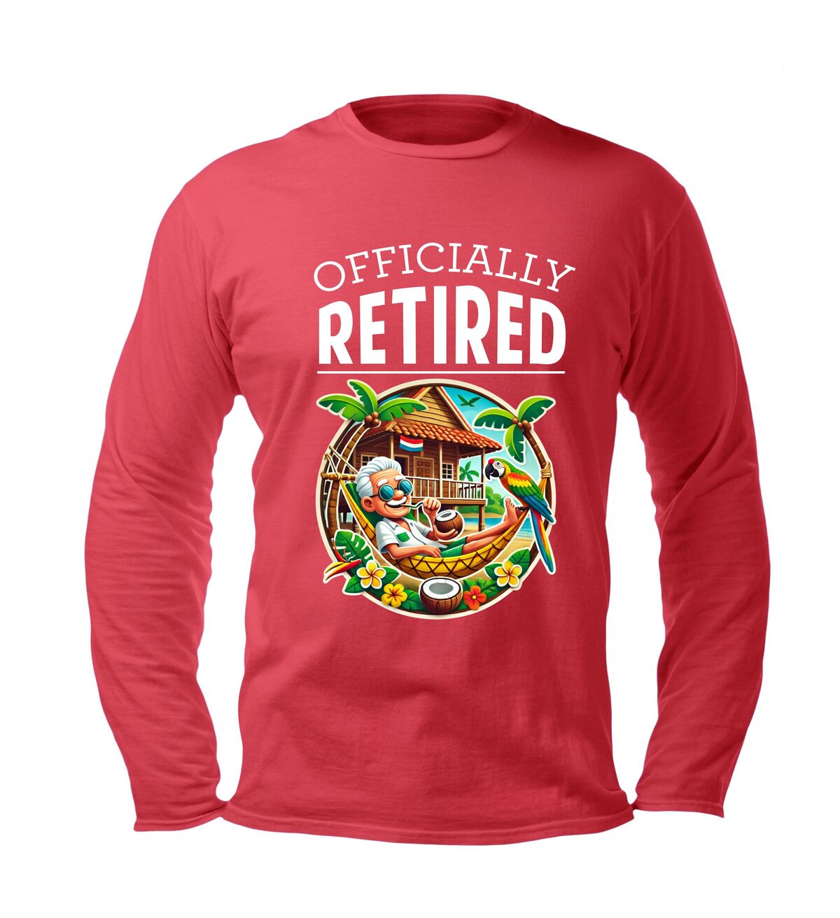 Grappige en comfortabele heren longsleeve met de tekst ‘Officially Retired’ en een leuke print van een man die heerlijk ligt te luieren in een hangmat – hét ultieme pensioen cadeau voor vaders, opa’s, collega’s of vrienden die eindelijk hun wekker kunnen uitzetten, nooit meer hoeven te stressen om deadlines, nu officieel fulltime mogen relaxen, vissen, mopperen op de kleinkinderen of eindeloos dutjes doen, en die dit shirt met trots kunnen dragen om aan de hele wereld te laten zien dat ze klaar zijn met werken en begonnen zijn aan hun nieuwe droombaan als professioneel hangmat-expert en middagdutjes-kampioen