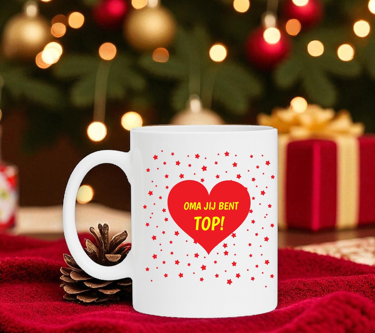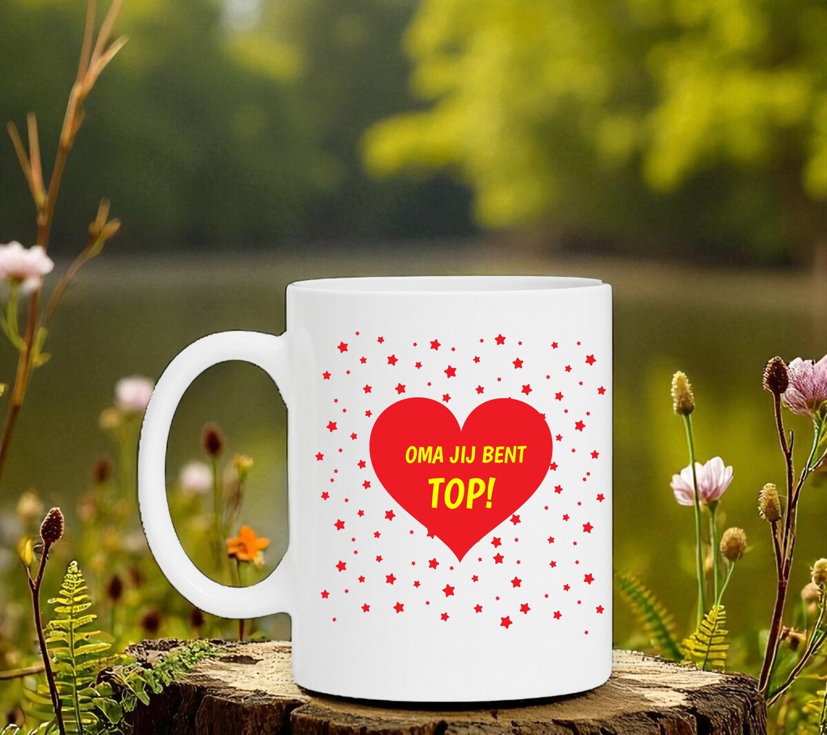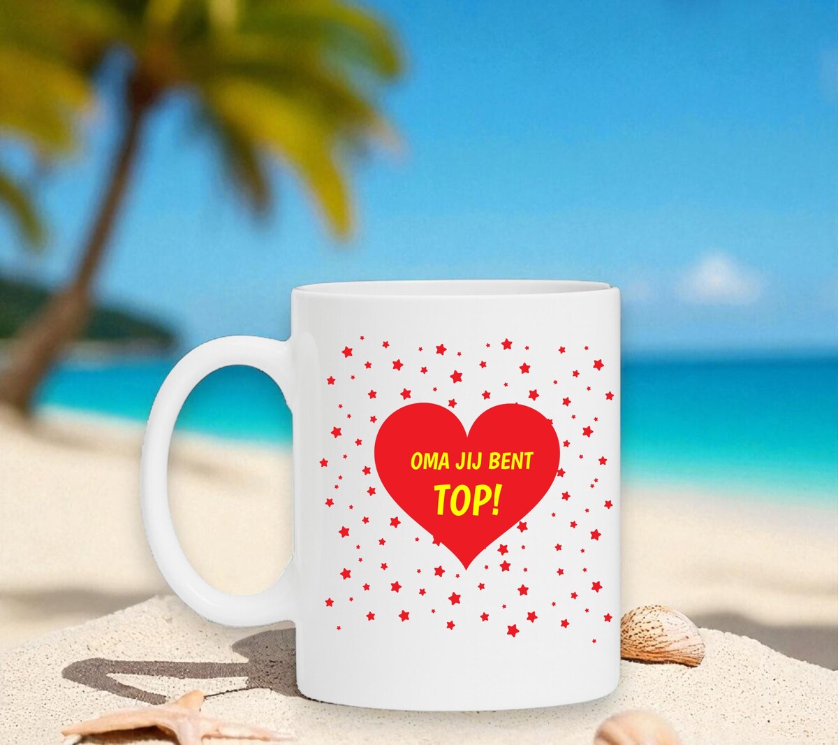Een lieve koffiemok voor een lieve oma jouw oma! Op de koffiemok staat in gele letters in een rood hart de tekst 'Oma jij bent top!' geschreven.