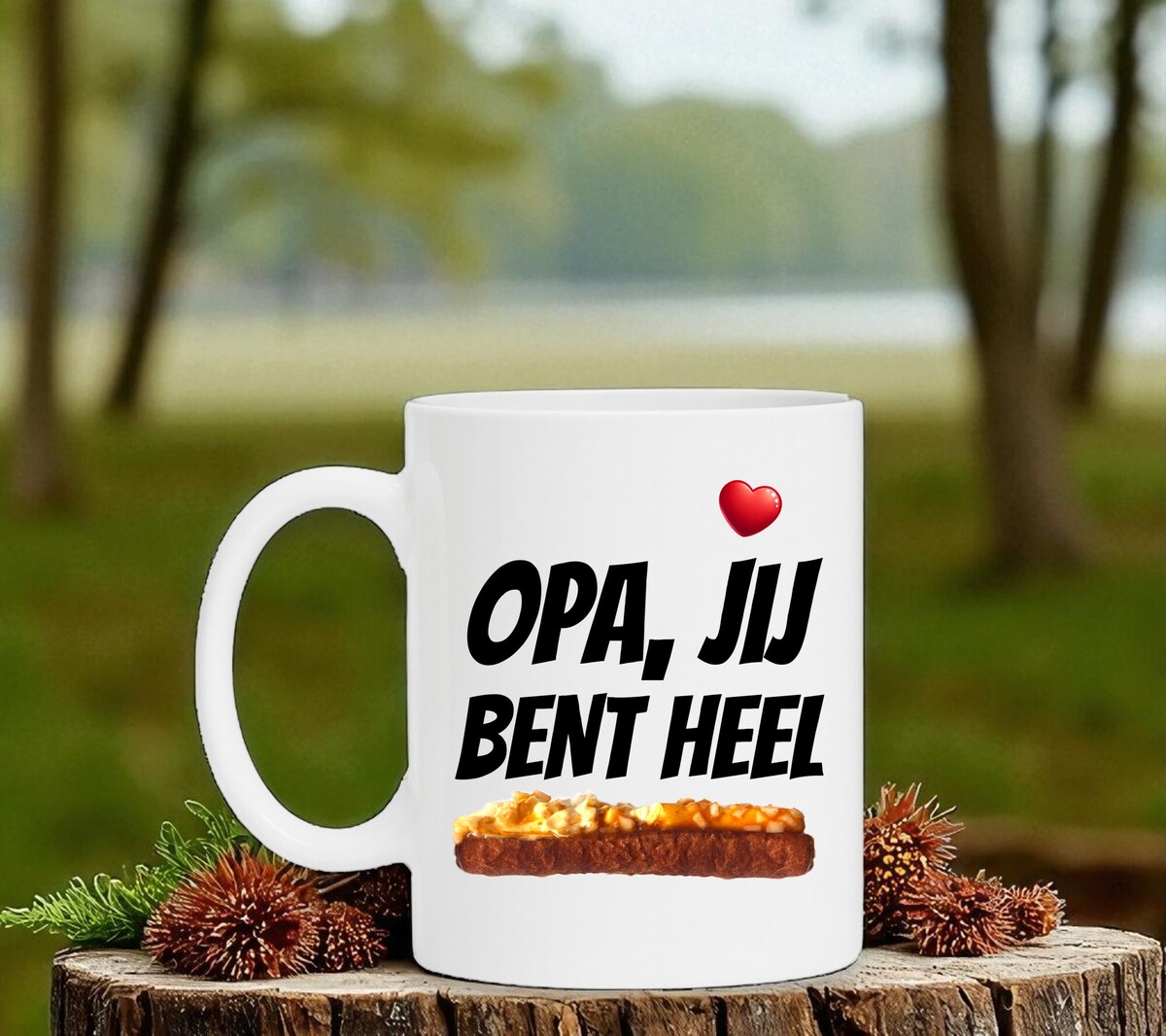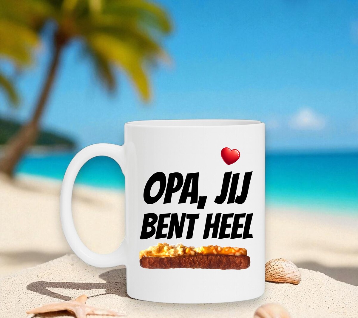 Een prachtige koffiemok om je opa mee te verrassen. Op de koffiemok staat de tekst ‘Opa, jij bent heel … ‘ Speciaal is uitgevoerd als een frikandel speciaal.