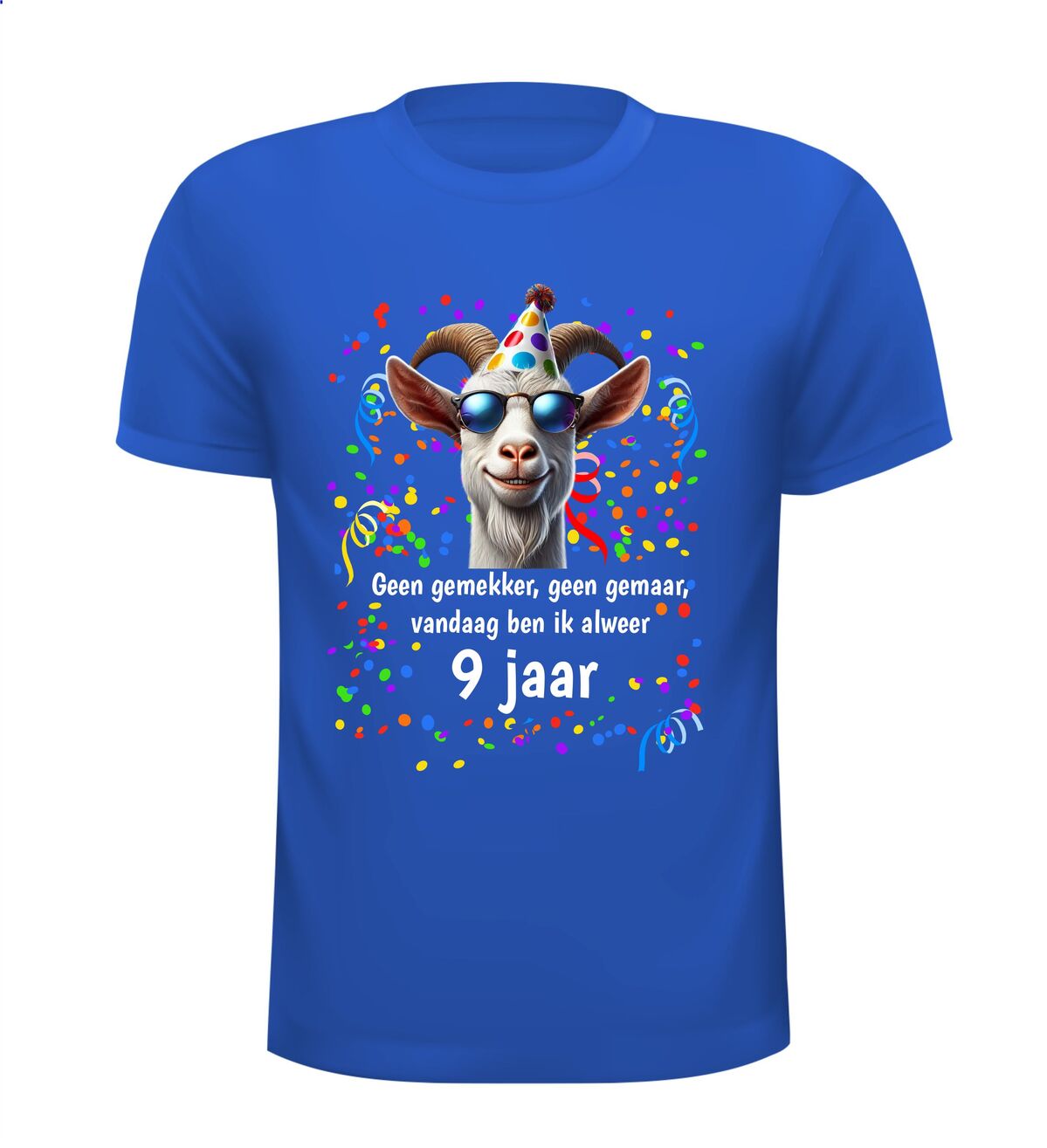 Leuk en grappig verjaardag shirt voor een jongen of meisje die de leeftijd van 9 jaar bereikt. Dit gezellige en kleurrijke full colour shirt is eigenlijk in bijna elke leeftijd te verkrijgen dus zoek je een andere leeftijd? kijk gerust eens verder op onze online fun en feestwinkel.