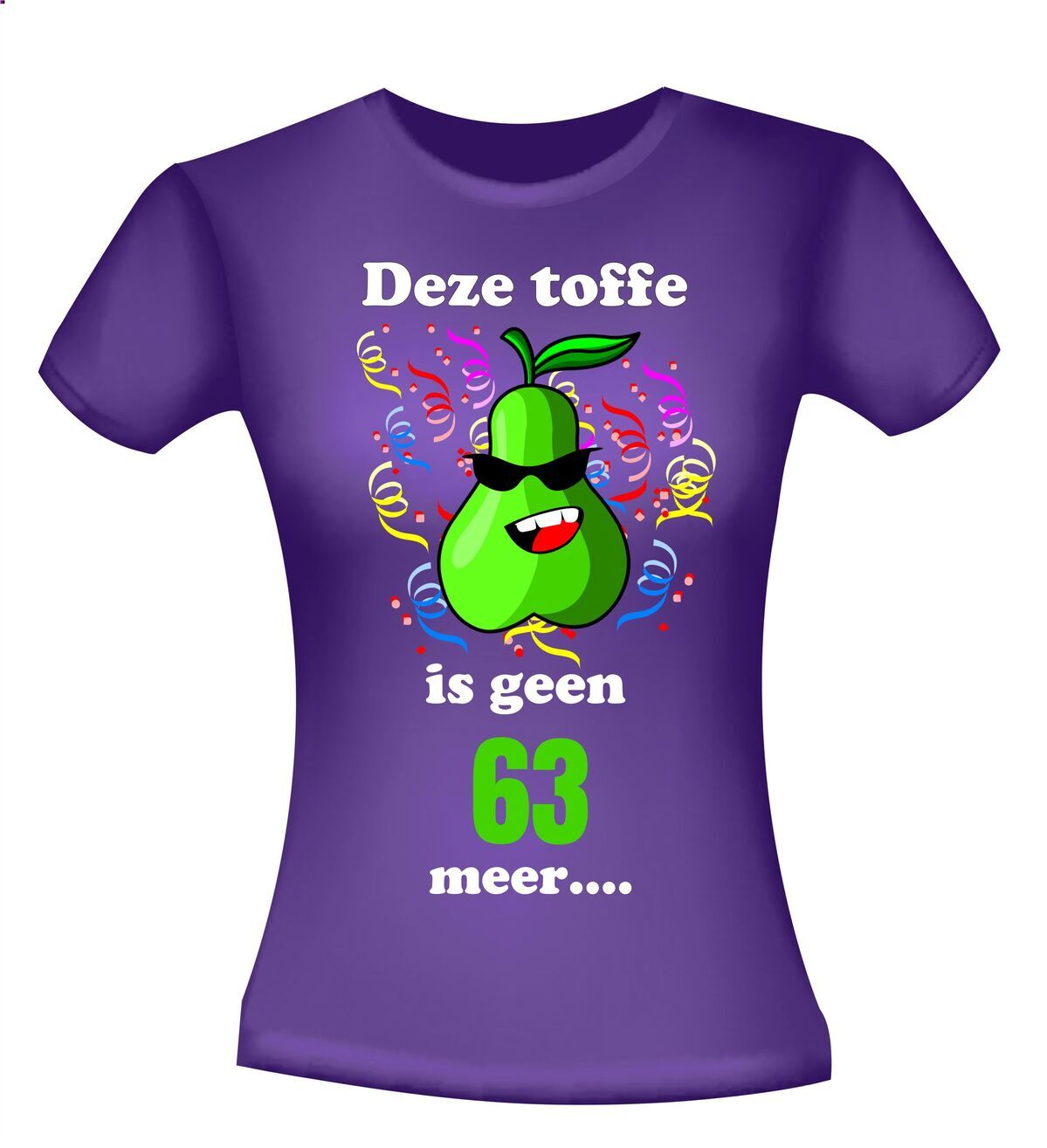 Op zoek na een verjaardag fun shirt voor iemand die 64 jaar wordt. Dit leuke en grappige full colour shirt met de tekst: deze toffe peer is geen 63 meer is erg leuk om cadeau te doen tijdens een 64e verjaardag. Dit shirt is zowel in dames als heren maten verkrijgbaar.