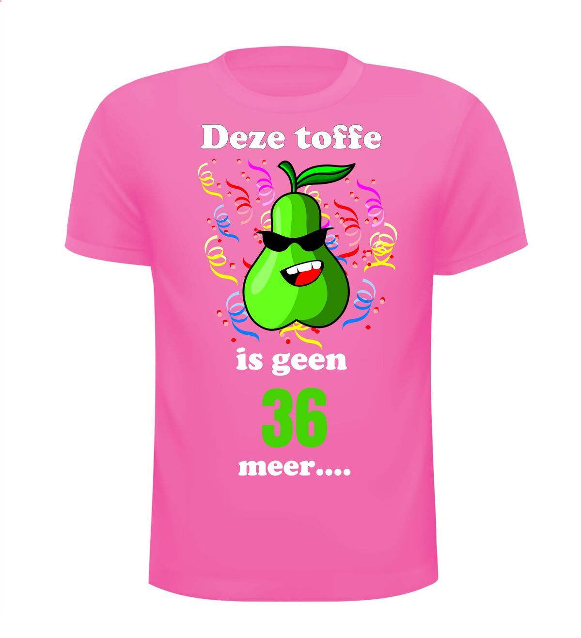 Leuk en orgineel full colour shirt om cadeau te doen wanneer iemand 37 jaar oud wordt. Dit leeftijd shirt met de tekst: Deze toffe peer is geen 36 meer is bijna in elke leeftijd te verkrijgen in onze online feestwinkel. Zowel in dames als heren maten verkrijgbaar.