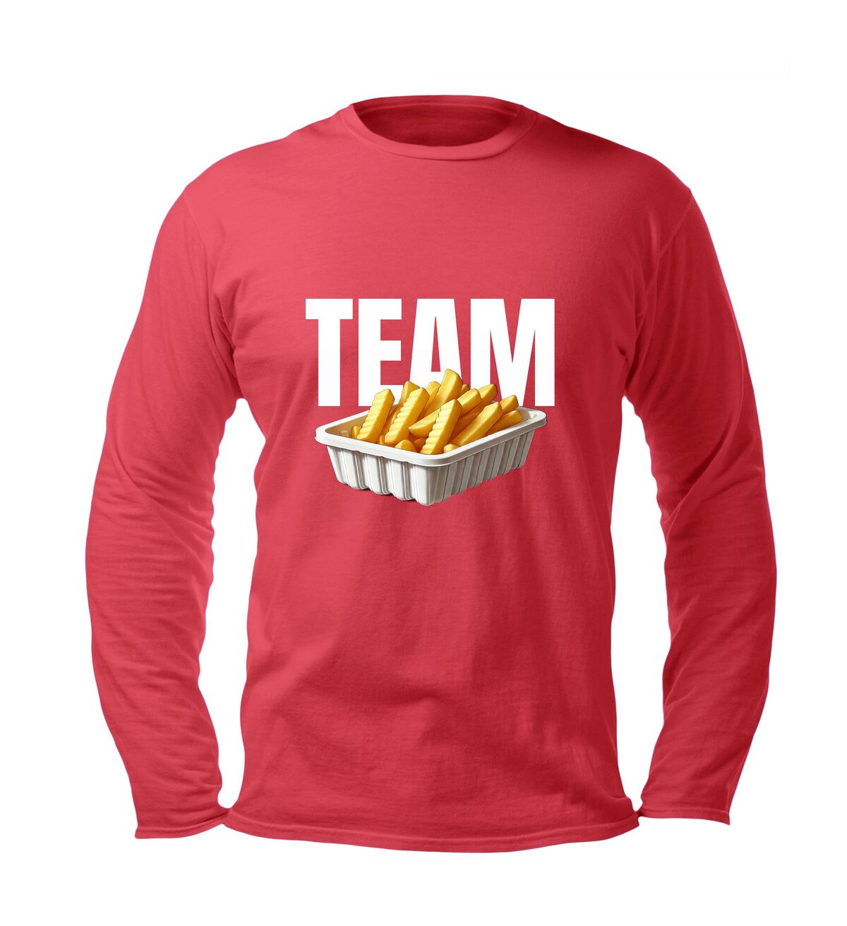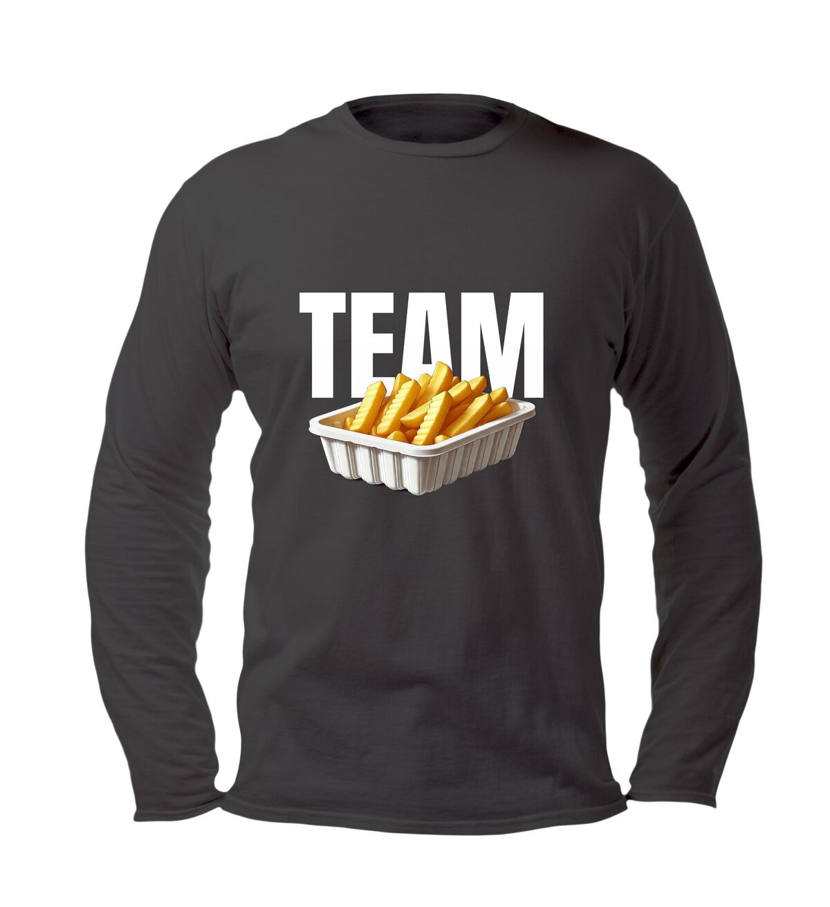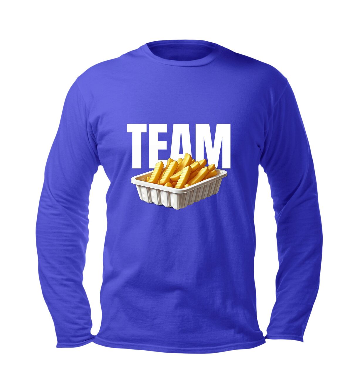 Of je nu de eeuwige discussie “patat of friet” wil aanwakkeren, je lidmaatschap van het snackteam wil tonen, of gewoon een originele en comfortabele longsleeve zoekt — dit shirt is een echte must-have voor iedereen met een friethart.