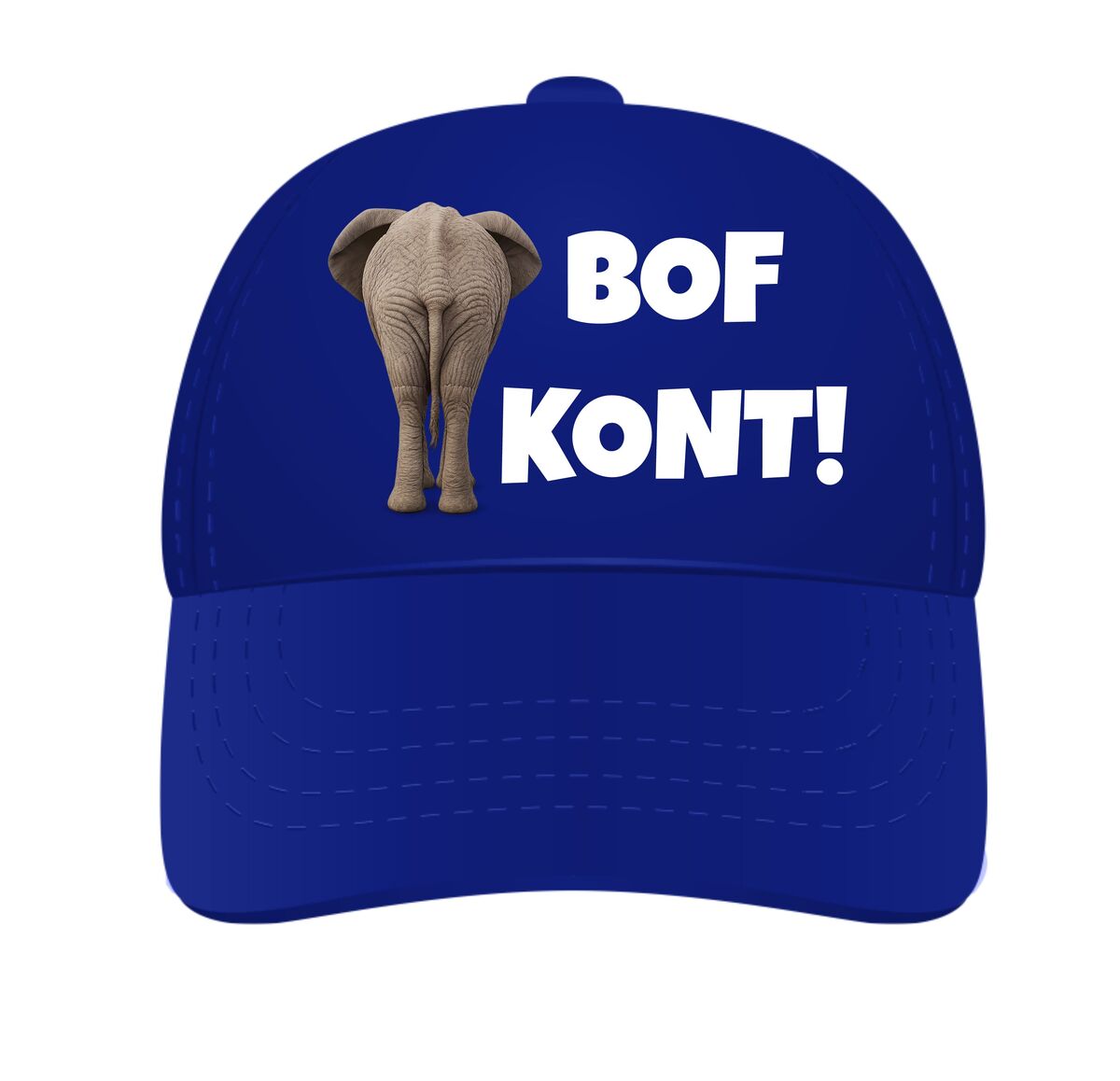 Een Pet voor de vrijgezel die gaat trouwen. Op de pet staat de opdruk van een olifantenkont met daaronder de tekst bofkont.