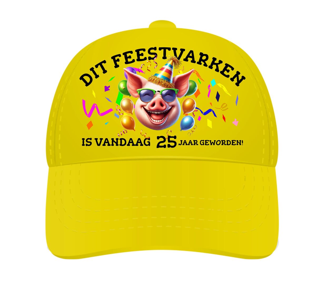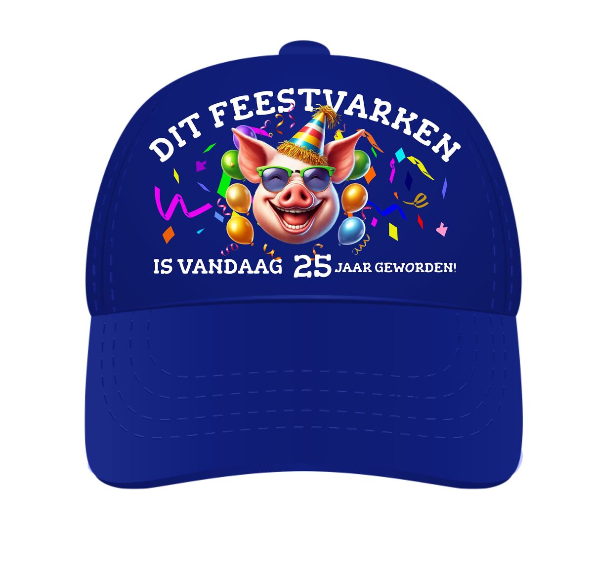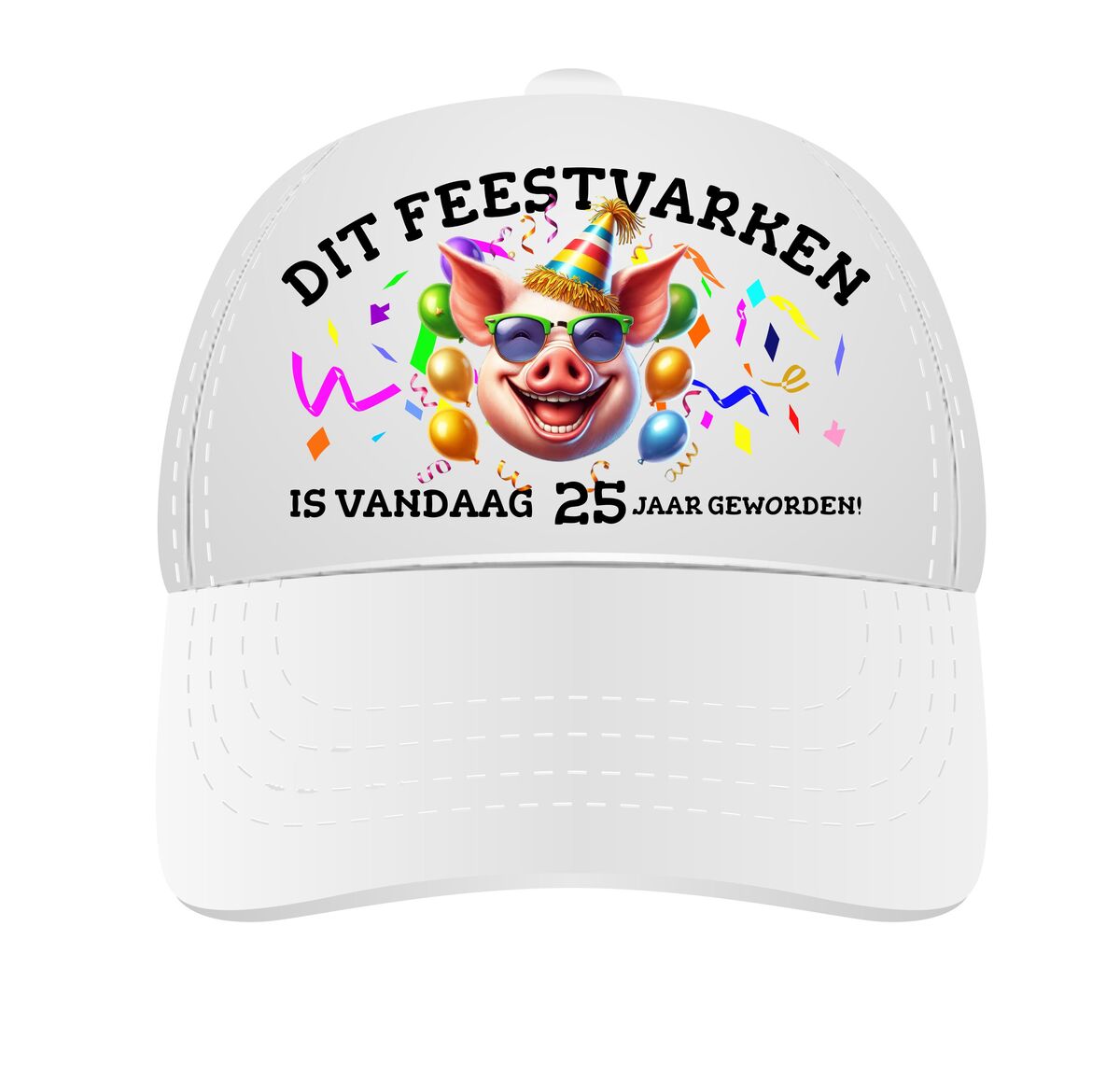 Leuke cadeau pet voor een jarige van 25 jaar. Op deze pet staat de tekst: dit feestvarken is vandaag 25 jaar geworden.