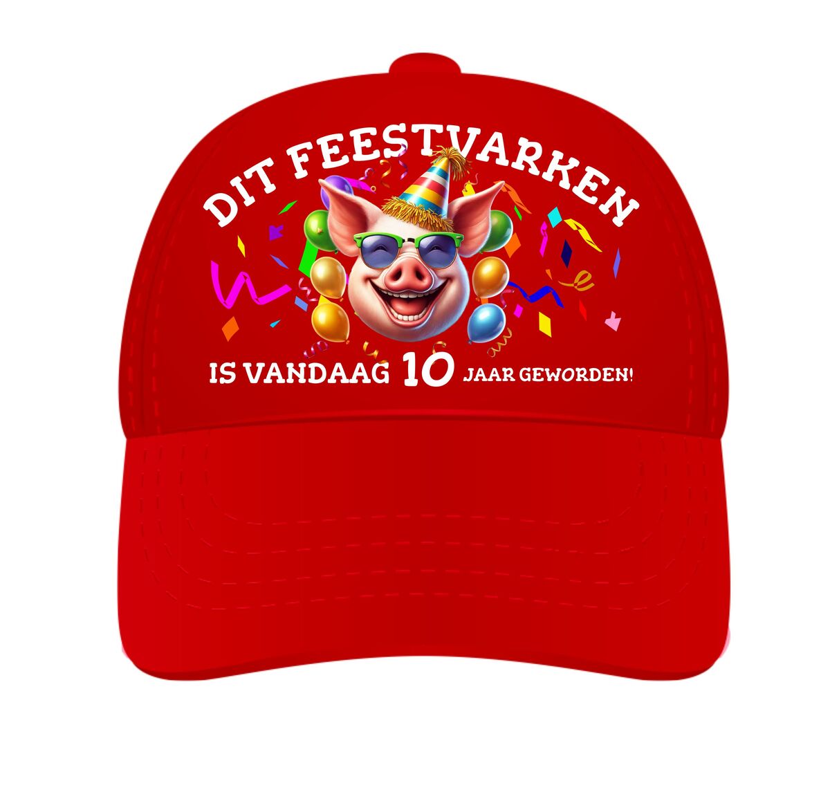 Pet met full colour print en tekst. Deze pet is een leuk cadeau voor iemand die tien jaar wordt. Op deze pet staat de tekst: Dit feestvarken is vandaag 10 jaar geworden.