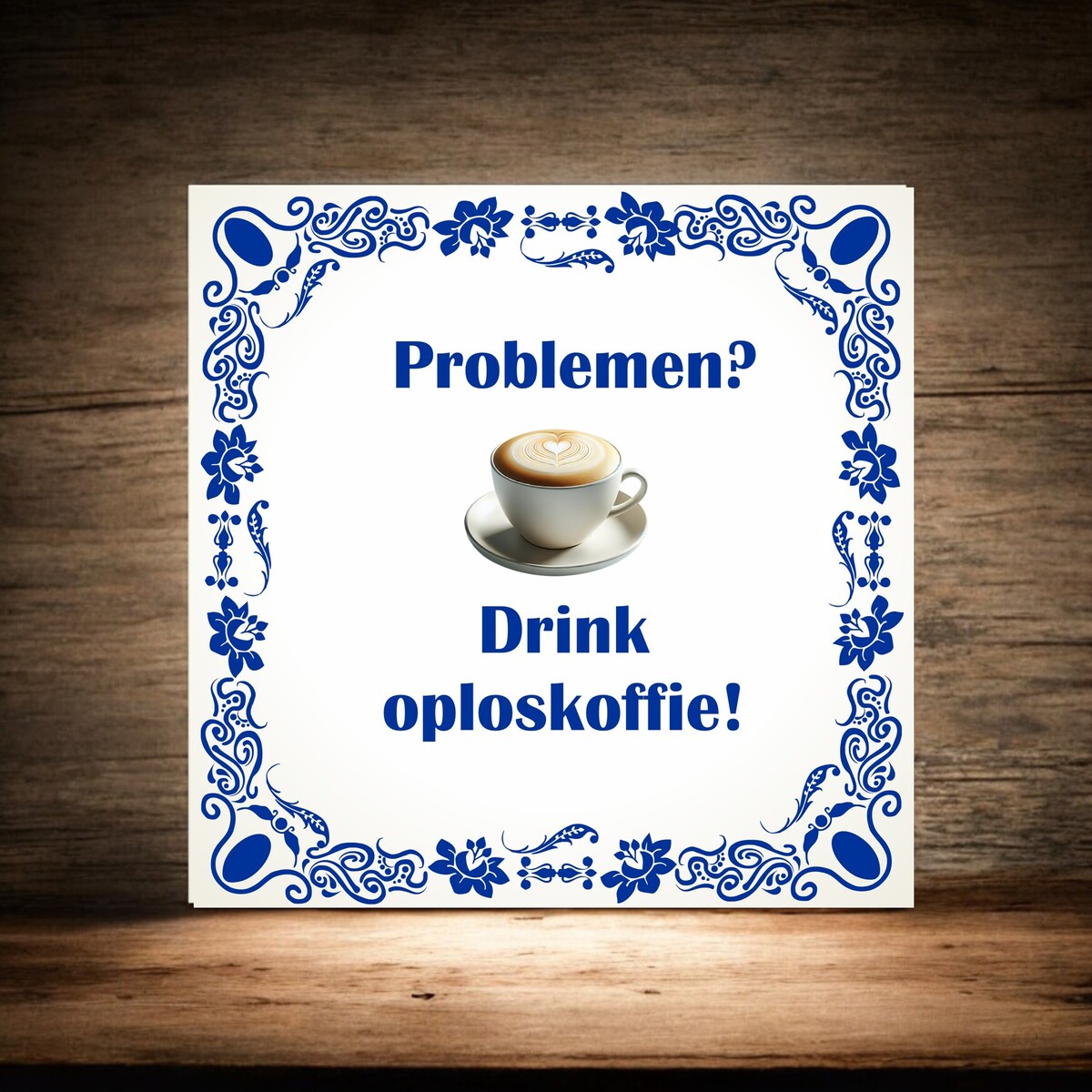 Een leuk spreukentegeltje voor op het werk. Dit tegeltje heeft een afmeting van 15cm x 15cm en is naast de leuk spreuk ook voorzien van een opdruk van een kopje oploskoffie om de spreuk extra kracht bij te zetten!