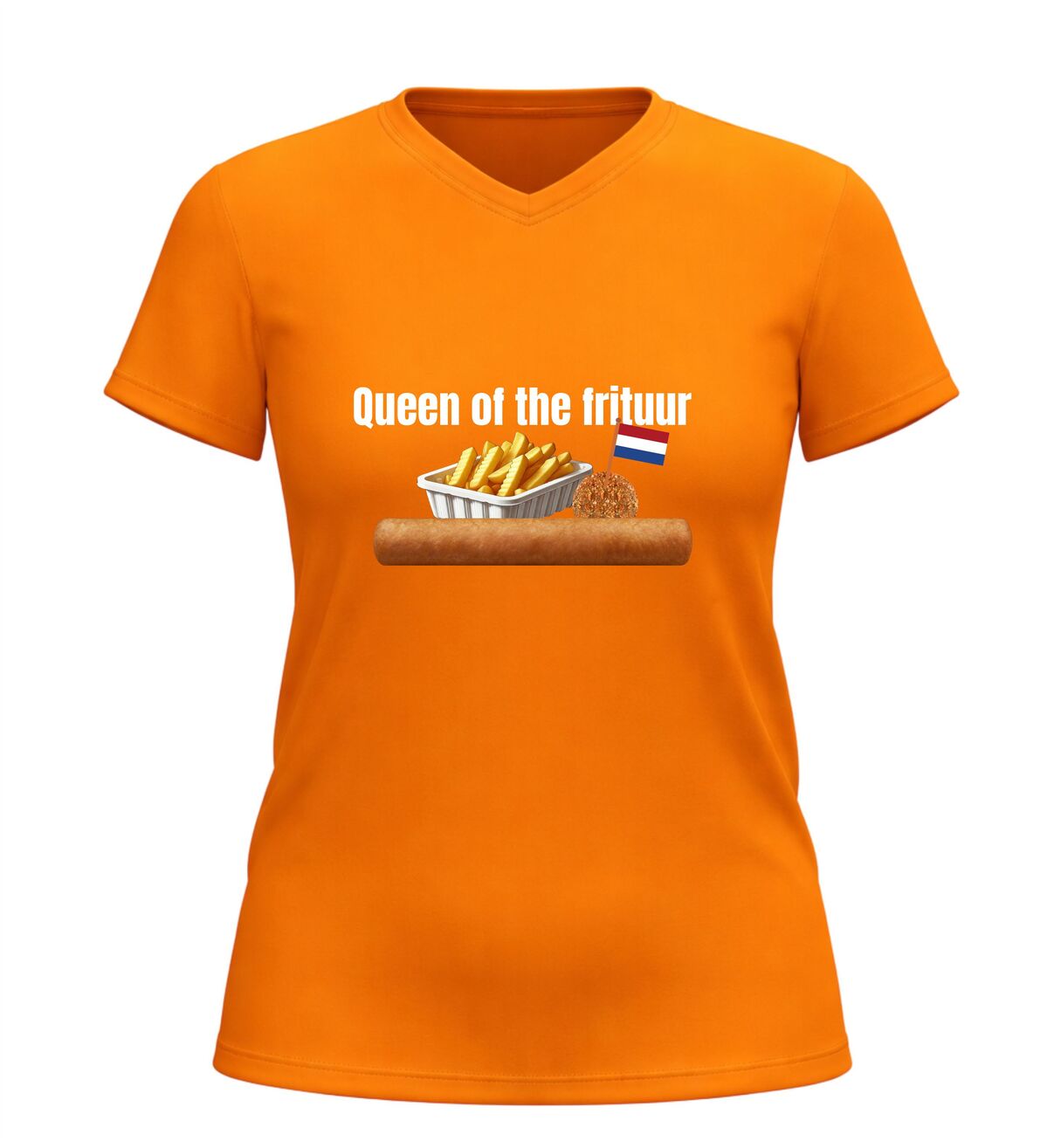 Dit queen of the frituur v-hals t-shirt is hét grappige shirt voor iedereen die dol is op snacks en humor. De opvallende tekst queen of the frituur in combinatie met een vrolijke afbeelding van een bakje patat met frikandel en bitterbal maakt dit V-hals shirt met frituur print een echte blikvanger. Perfect voor liefhebbers van funny T-shirts, food shirts en originele casual kleding.