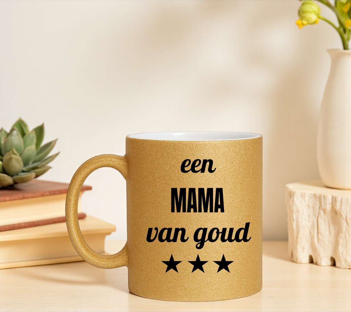 Laat je moeder stralen als nooit tevoren met onze betoverende gouden glittermok, speciaal ontworpen voor de onvervangbare "Mama van Goud" in je leven! Deze prachtige mok is niet zomaar een drinkgerei; het is een schitterend eerbetoon aan de onvoorwaardelijke liefde, steun en toewijding die jouw moeder elke dag aan jou en je gezin geeft. Met zijn sprankelende gouden glitters brengt deze mok een vleugje glamour in haar ochtendroutine en herinnert haar eraan hoe bijzonder ze echt is. Of het nu gaat om haar dagelijkse kopje koffie of thee, deze mok voegt een vleugje luxe toe aan elk moment en laat haar weten dat ze echt wordt gewaardeerd. De stevige constructie zorgt ervoor dat ze keer op keer van haar favoriete drankje kan genieten, terwijl de gouden glitters haar dag opvrolijken met een stralende glans. Of het nu voor Moederdag, haar verjaardag of gewoon zomaar is, deze "Mama van Goud" glittermok is het perfecte geschenk om haar te laten zien hoeveel ze voor jou betekent. Bestel vandaag nog en geef haar een cadeau dat net zo schitterend is als zijzelf!