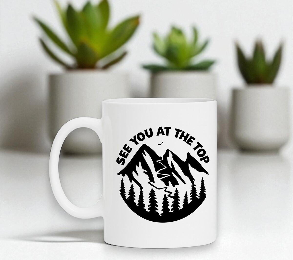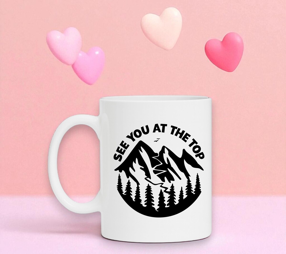 Een prachtige witte koffie of thee mok met de opdruk 'see you at the top'. De mok is vaatwasserbestendig en magnetronbestendig en heeft een hoogte van 96mm en een diameter van 80mm.