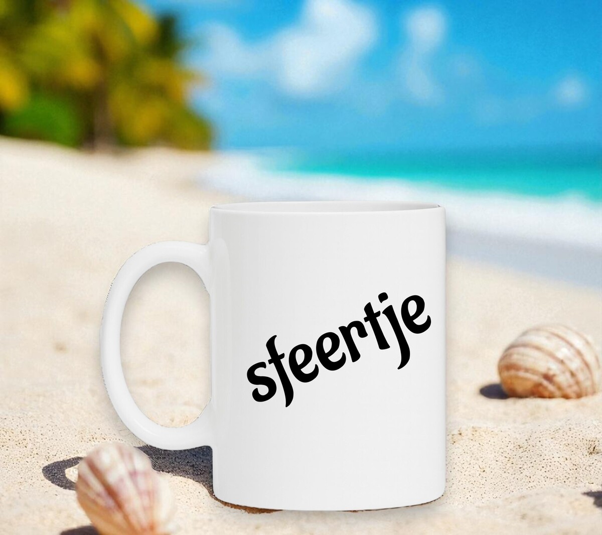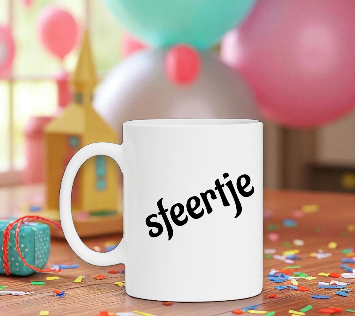 Een leuke koffiemok voor als even pauze heb. Op de koffiemok staat schuin in het robijnrood het woord sfeertje gescherven.