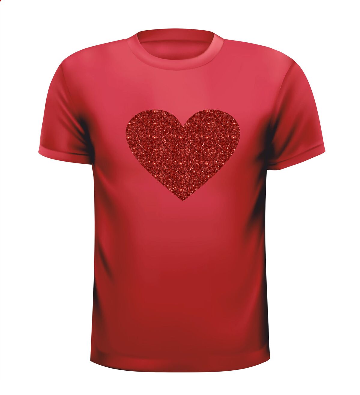 Laat je look direct opvallen met het unisex glitter rood hart t-Shirt – hét trending item dat door zowel dames als heren wordt gedragen. Het rode glitterhart is een echte showstopper en geeft elke outfit een luxe, sprankelende uitstraling. Perfect voor wie graag gezien wil worden, voor koppels die willen matchen of gewoon voor iedereen die houdt van een krachtige, stijlvolle statement-print.