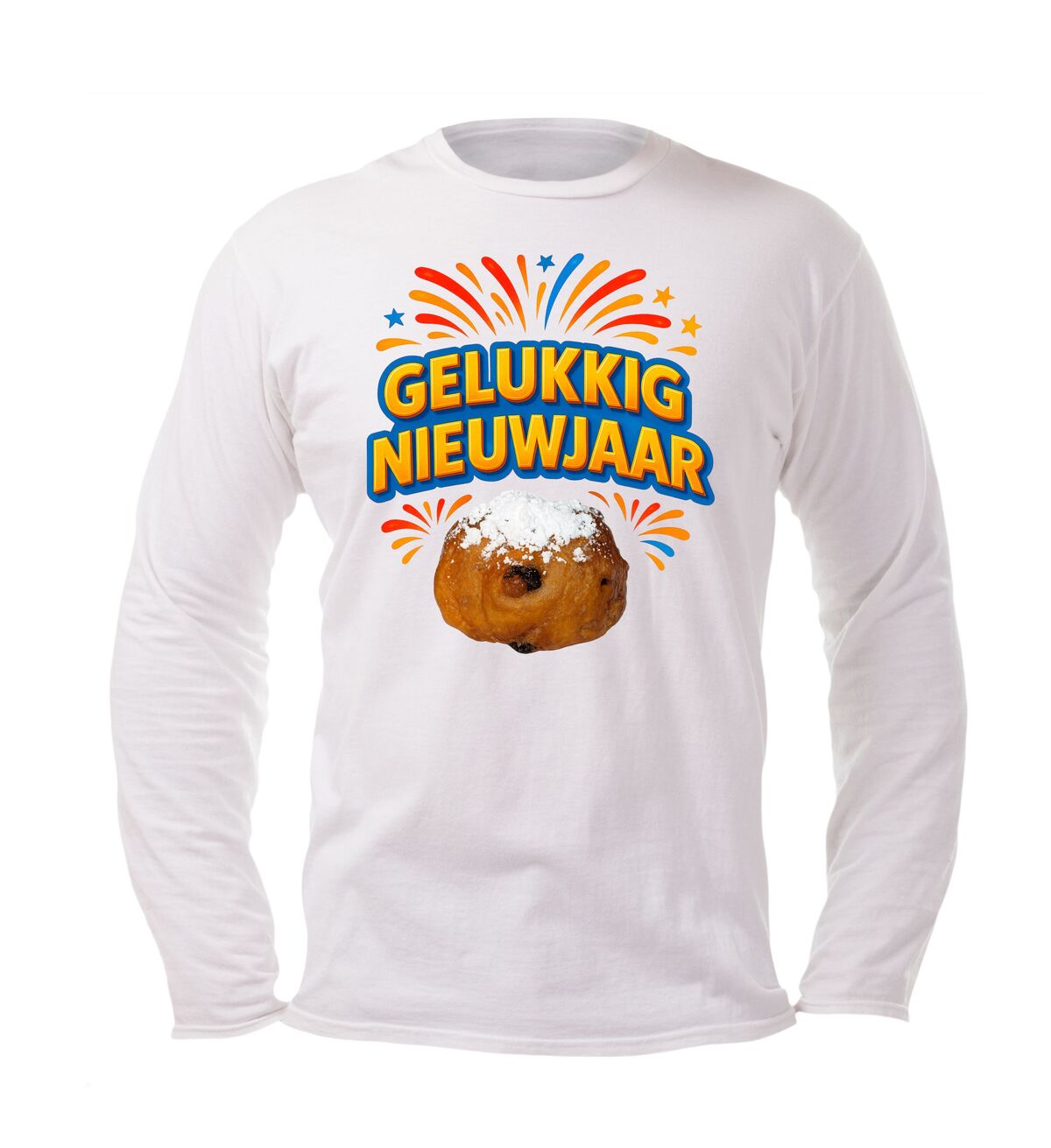 Begin het nieuwe jaar warm en met een glimlach. Deze longsleeve met de feestelijke tekst “Gelukkig Nieuwjaar” en de onweerstaanbare oliebol is perfect voor koude dagen vol gezelligheid. Zacht, comfortabel en met een knipoog naar Hollandse traditie — ideaal voor wie het jaar wil starten met humor, warmte en een beetje poedersuikerstijl.