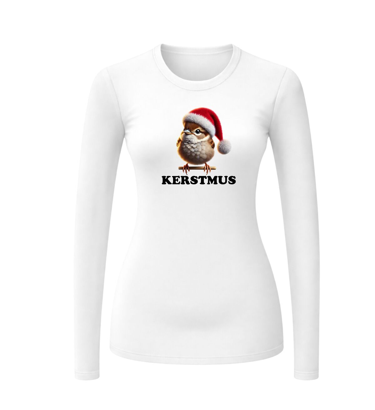 Een grappig kerst T-shirt lange mouw! Met de opdruk van een mus die een kerstmuts op heeft!
