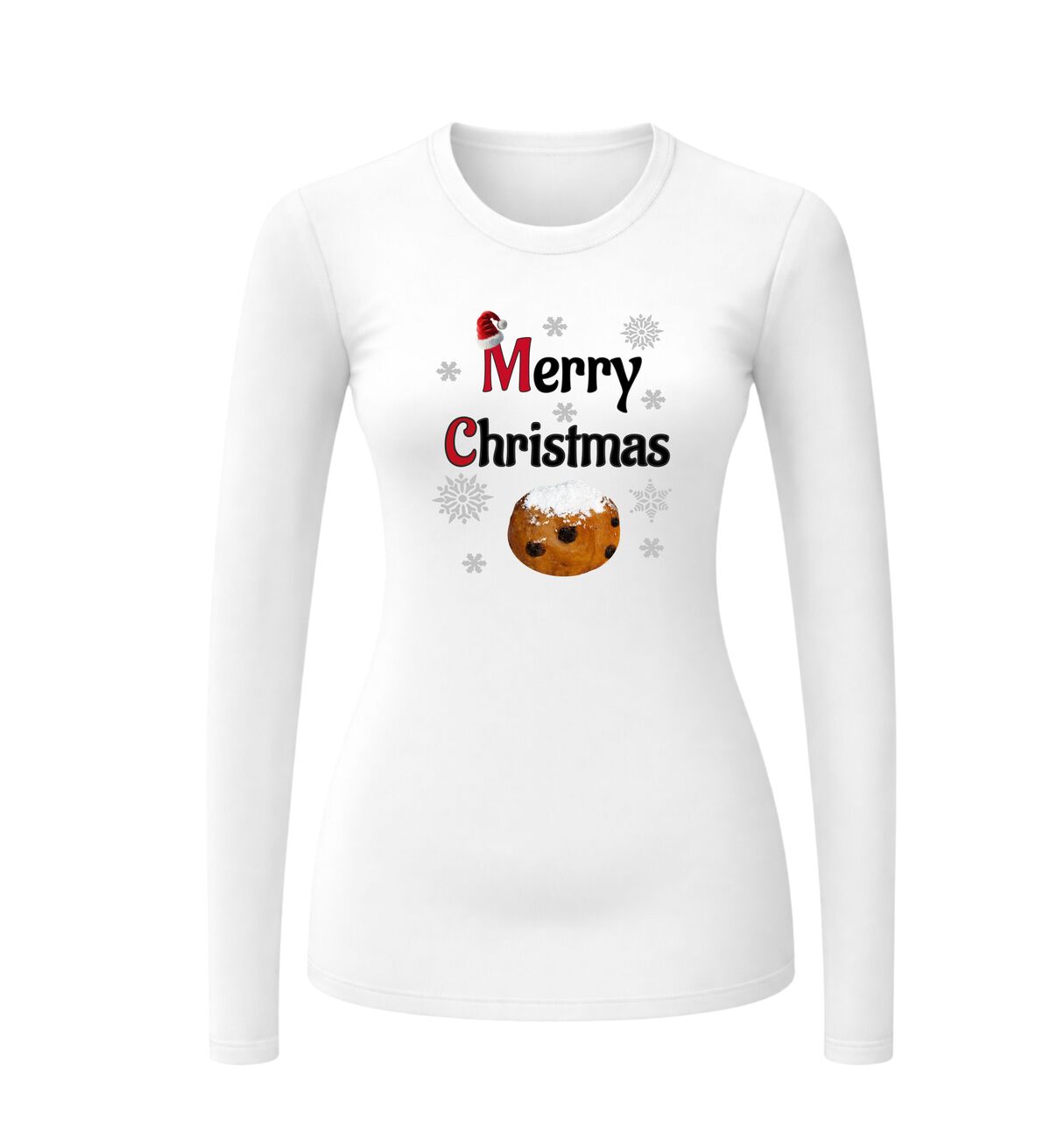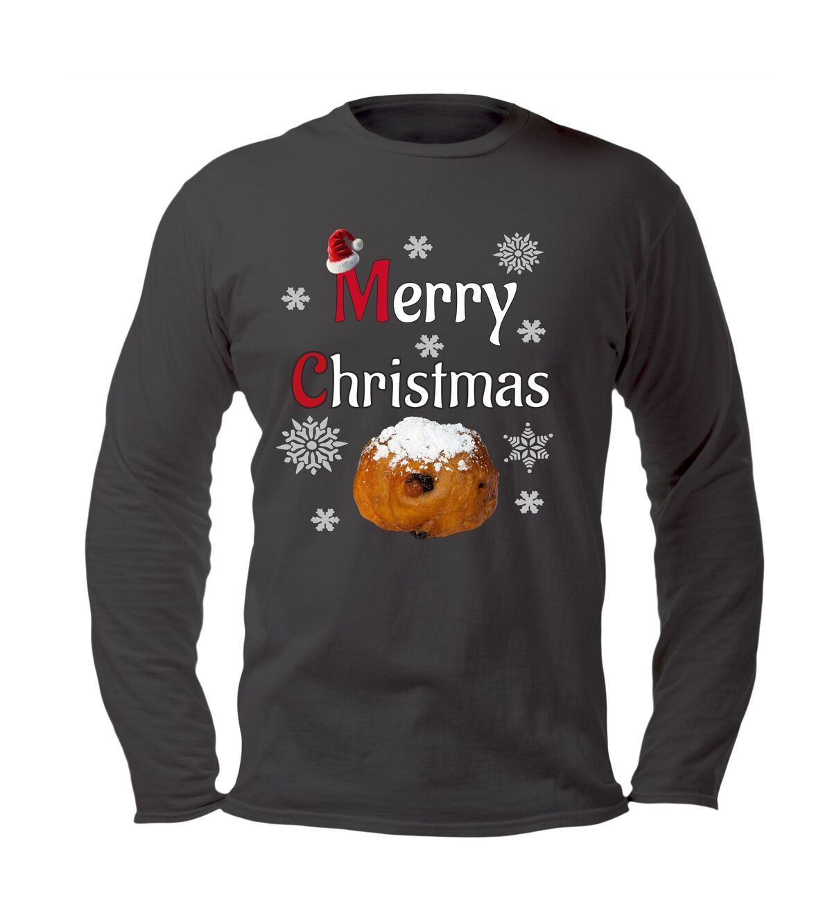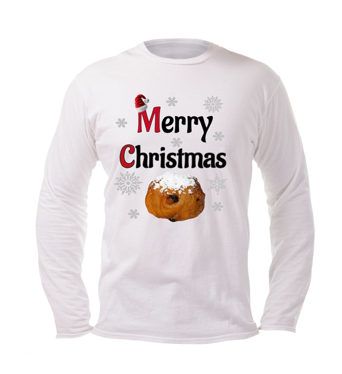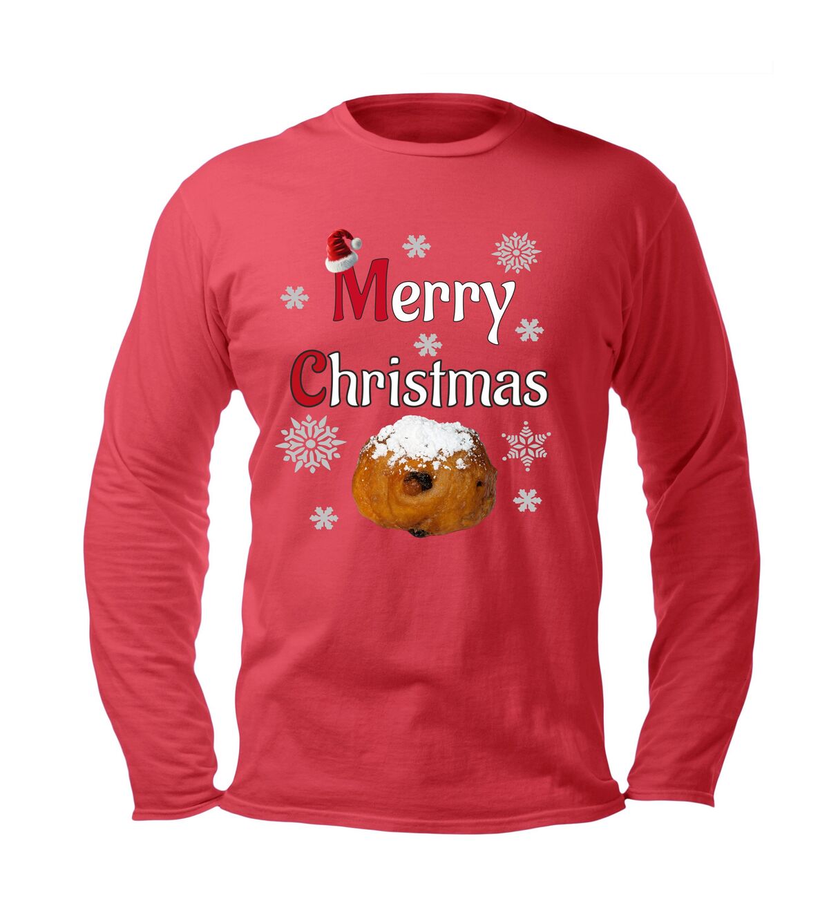 Super mooi en super fout Kerst T-shirt! Voorzien van een lekker oliebol en de tekst Merry Christmas. Leuk voor bij de kerstborrel.