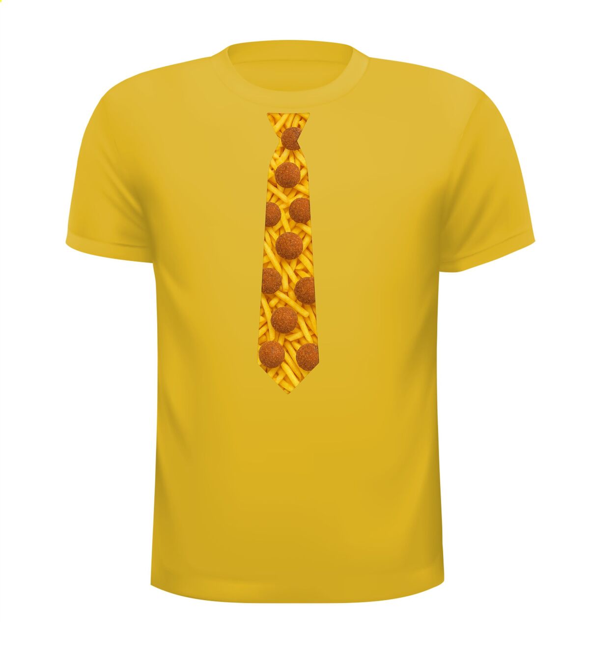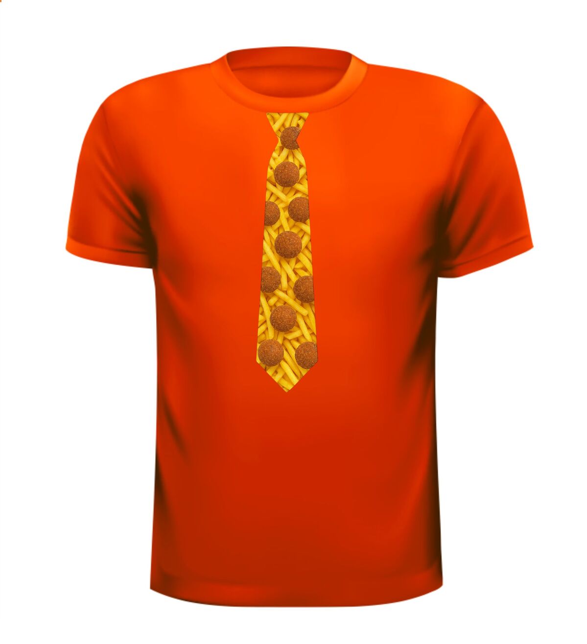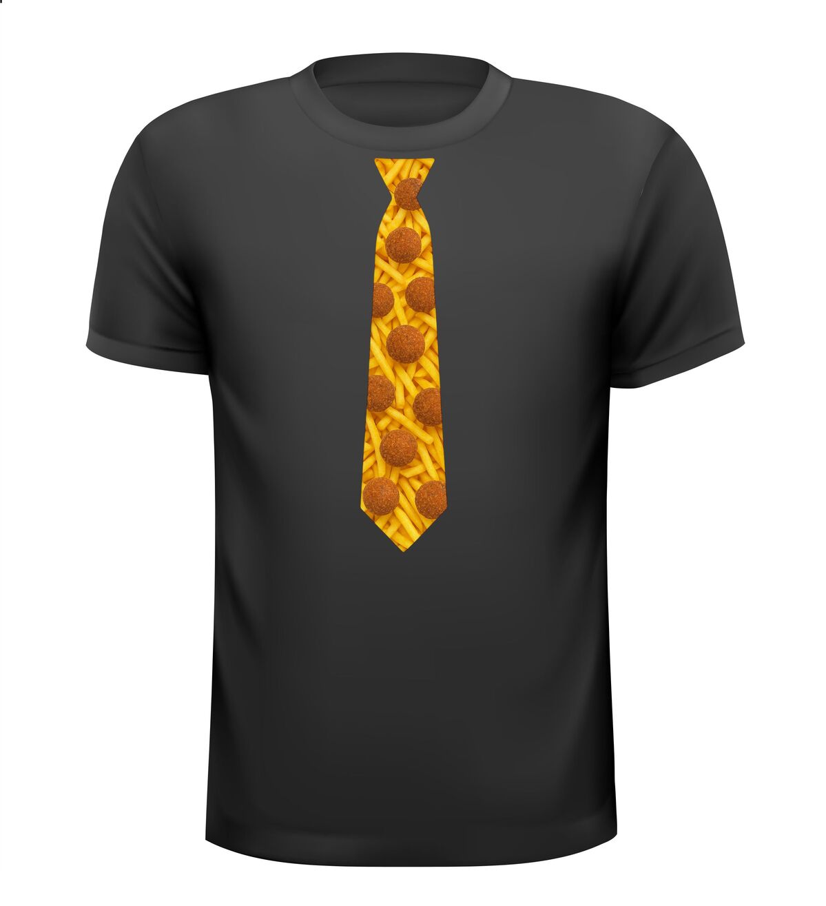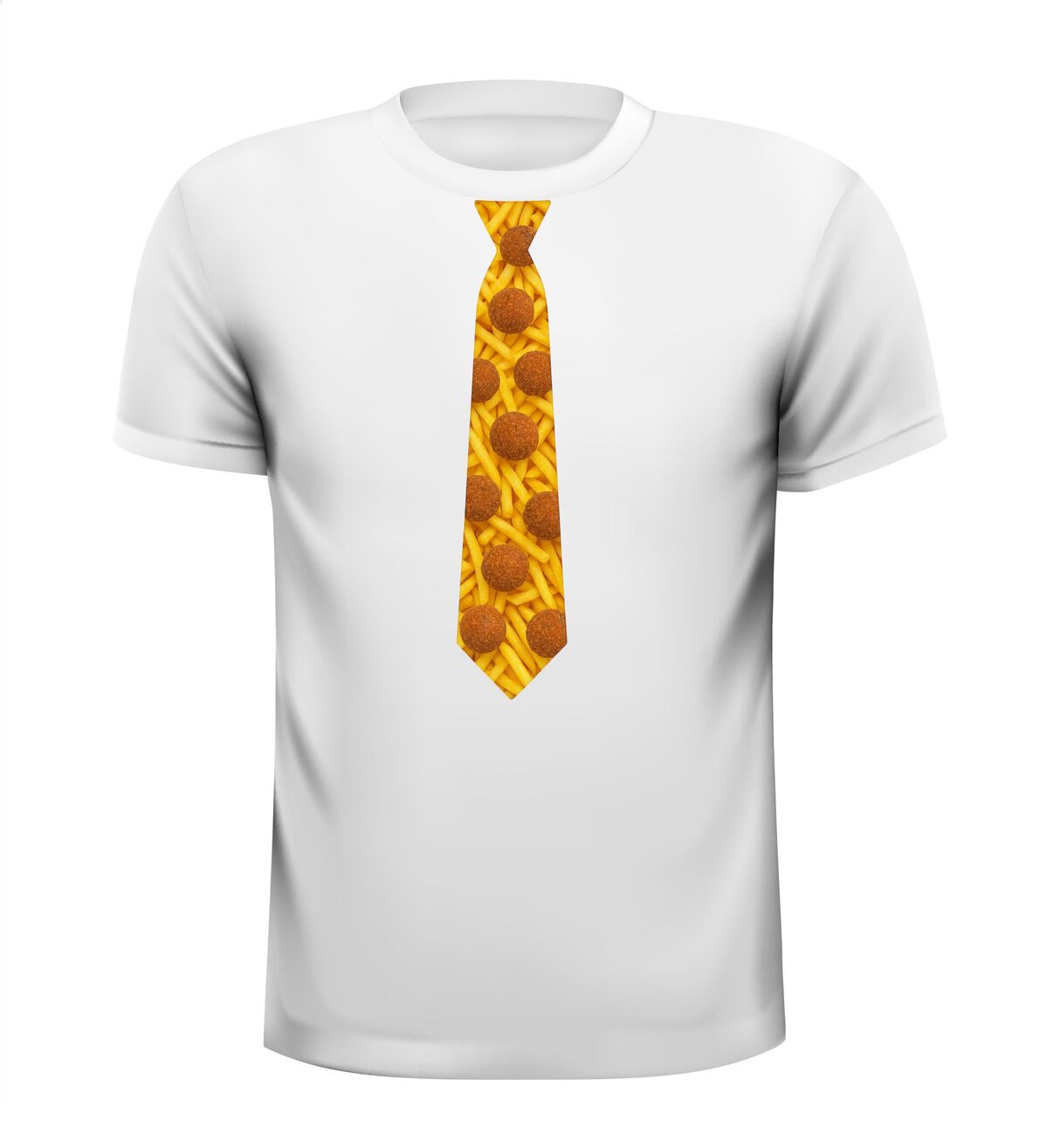 Shirtje Stropdas met bitterballen print! Supergave stropdas print met de opdruk van frietjes op de achtergrond en bitterballen op de voorgrond. Leuk voor elk snack feestje!