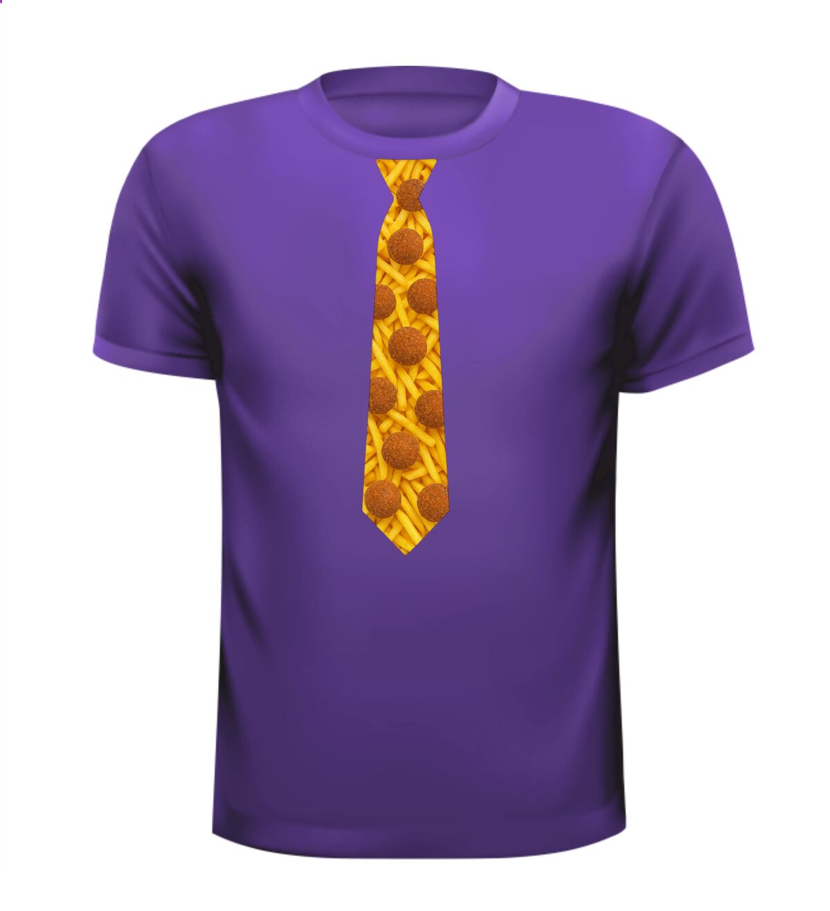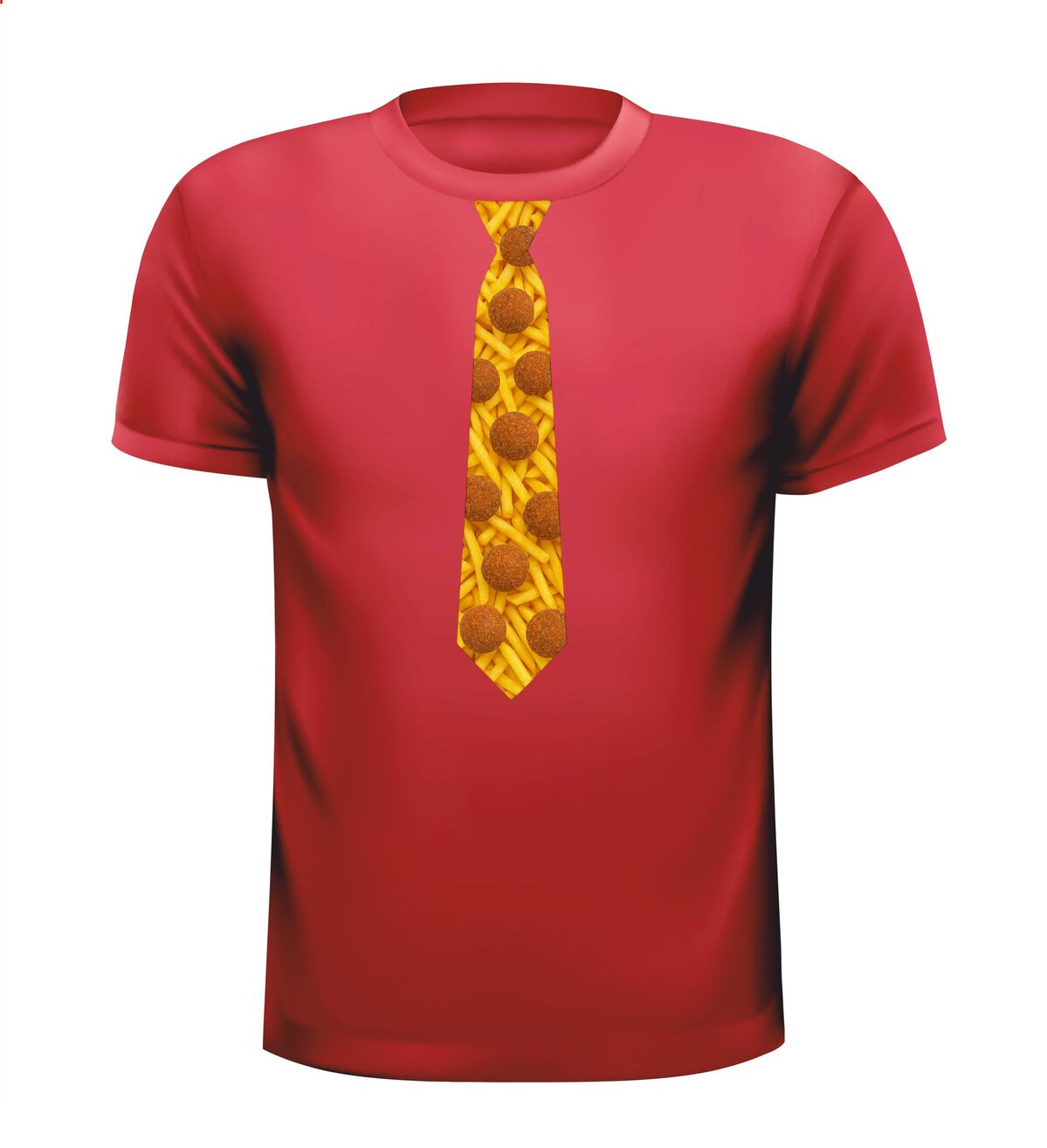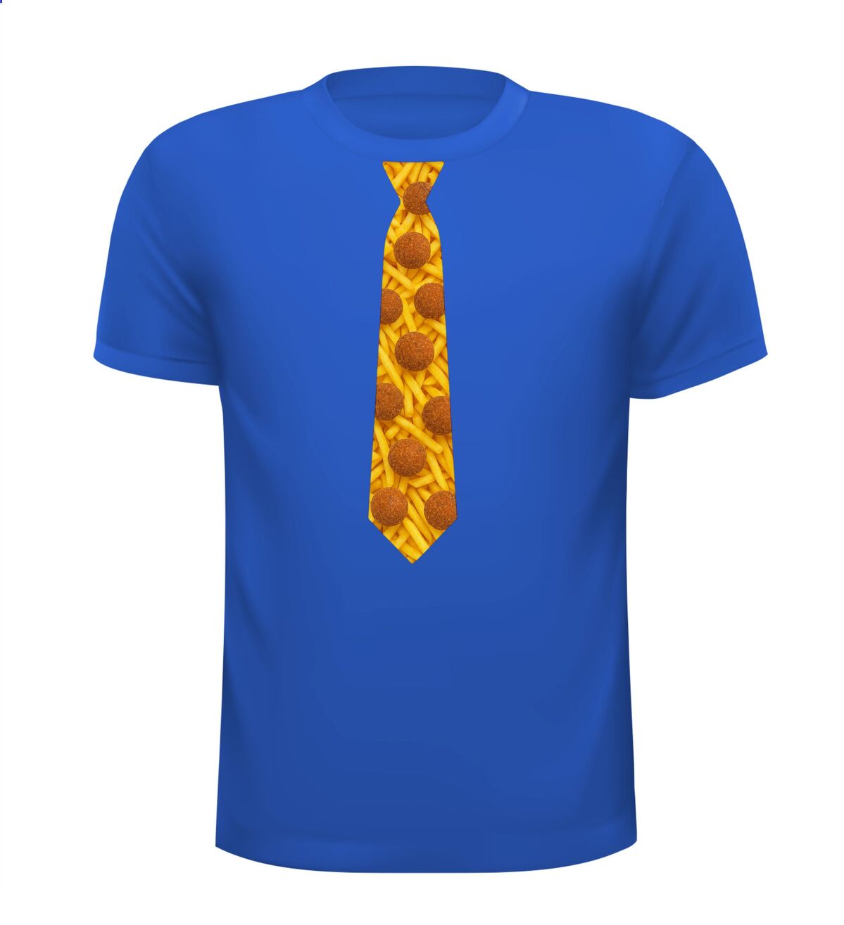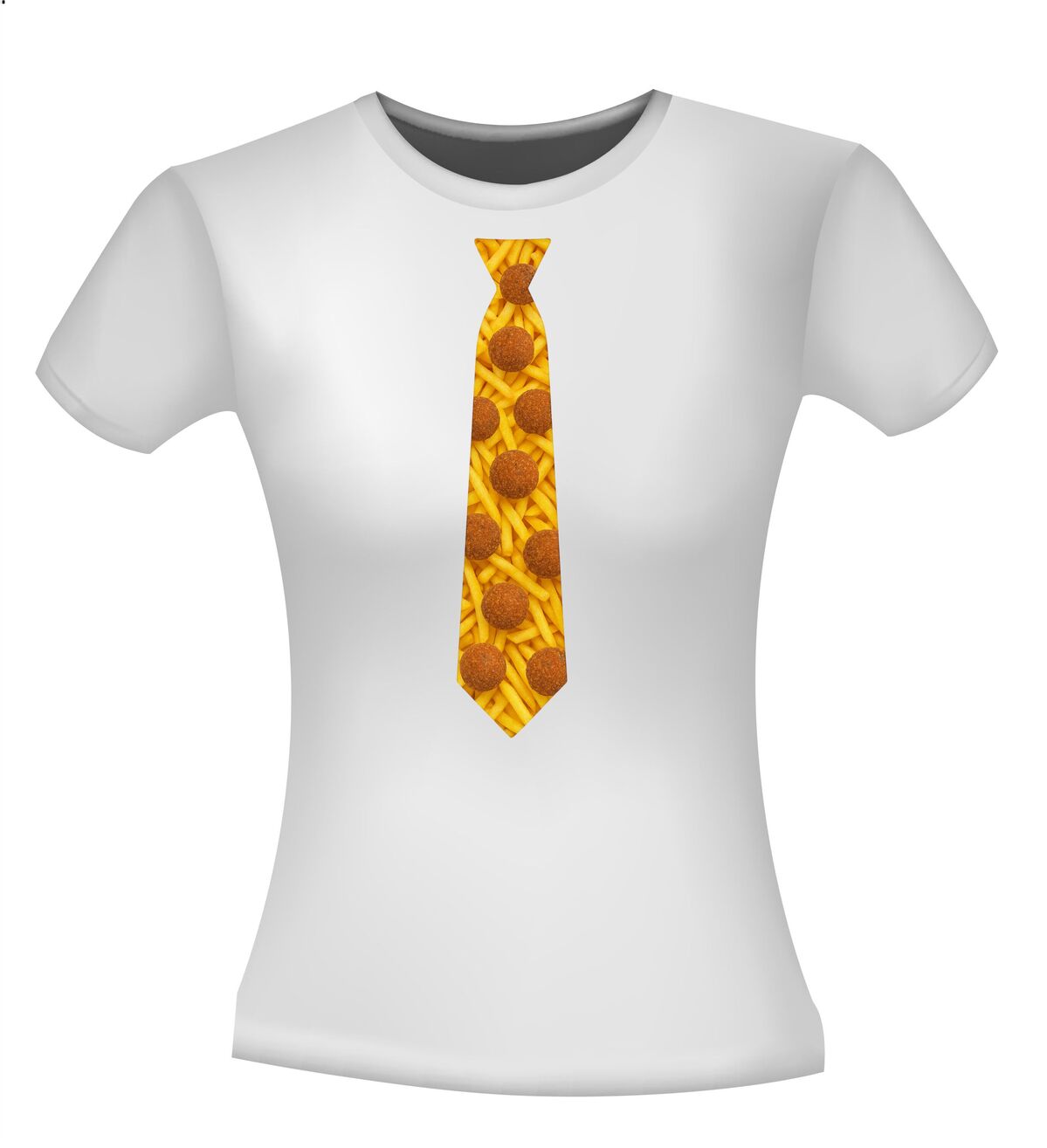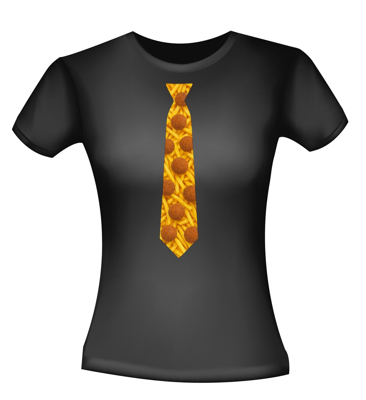 Shirtje Stropdas met bitterballen print! Supergave stropdas print met de opdruk van frietjes op de achtergrond en bitterballen op de voorgrond. Leuk voor elk snack feestje!