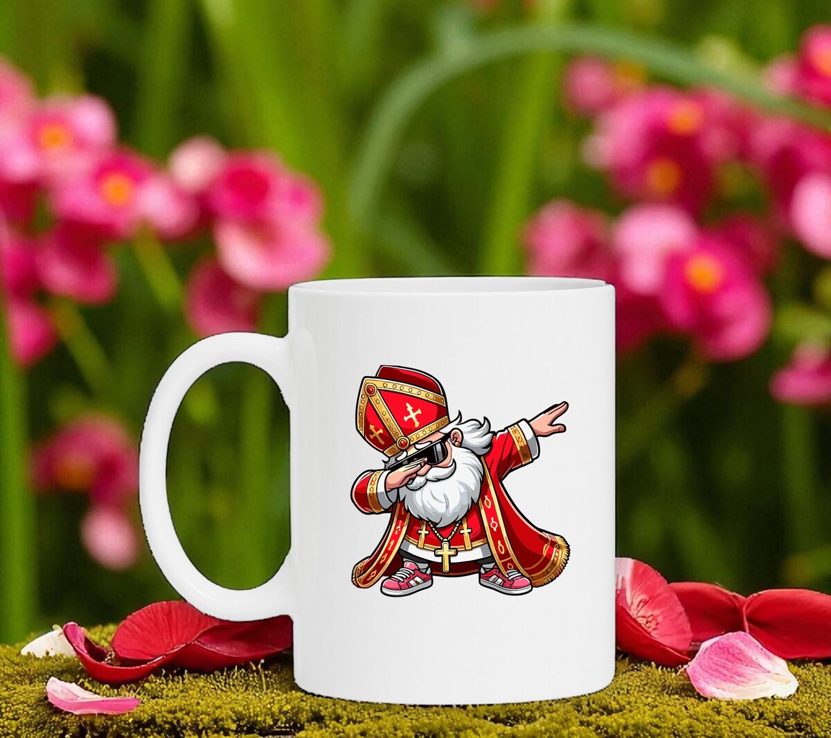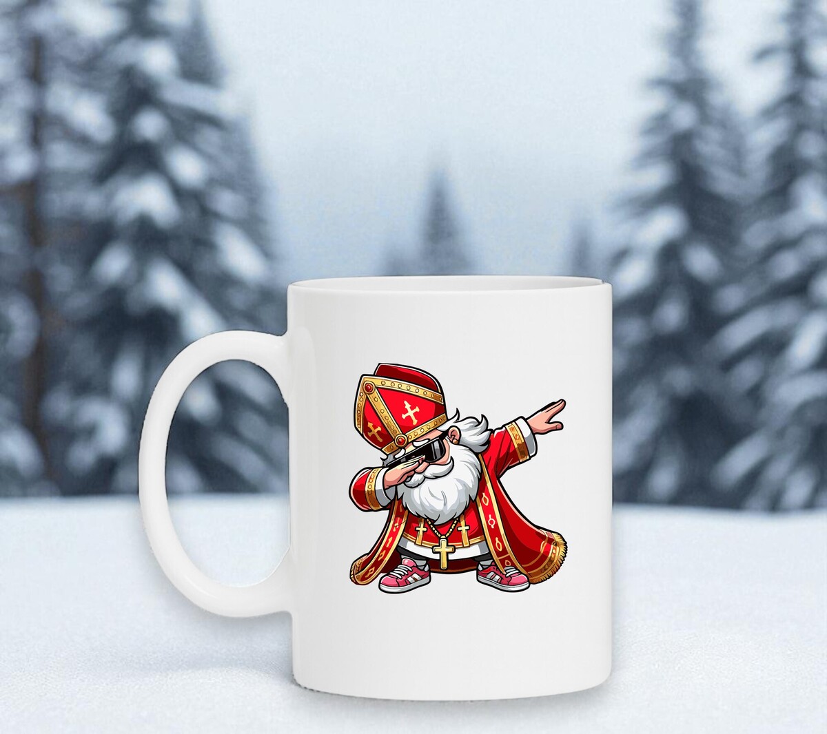 Mok met de opdruk van een morderne Sinterklaas in een dab beweging. De Sinterklaas mok is vaatwasserbestendig en heeft een hoogte van 96mm en een diameter van 80mm.