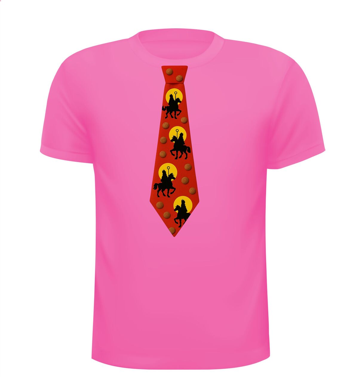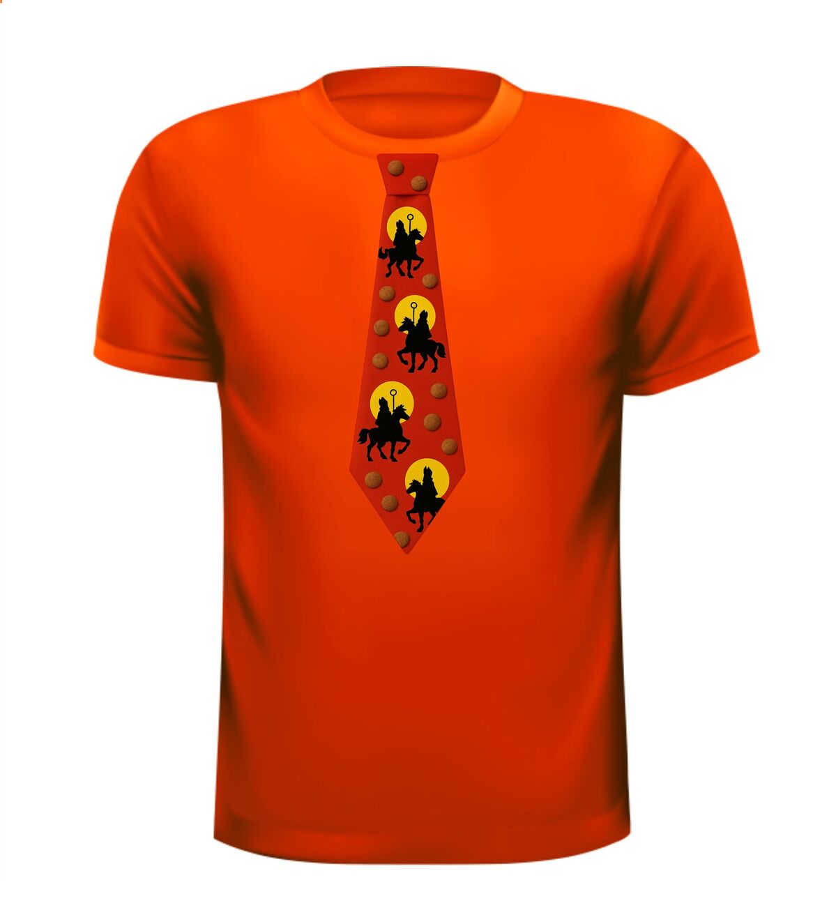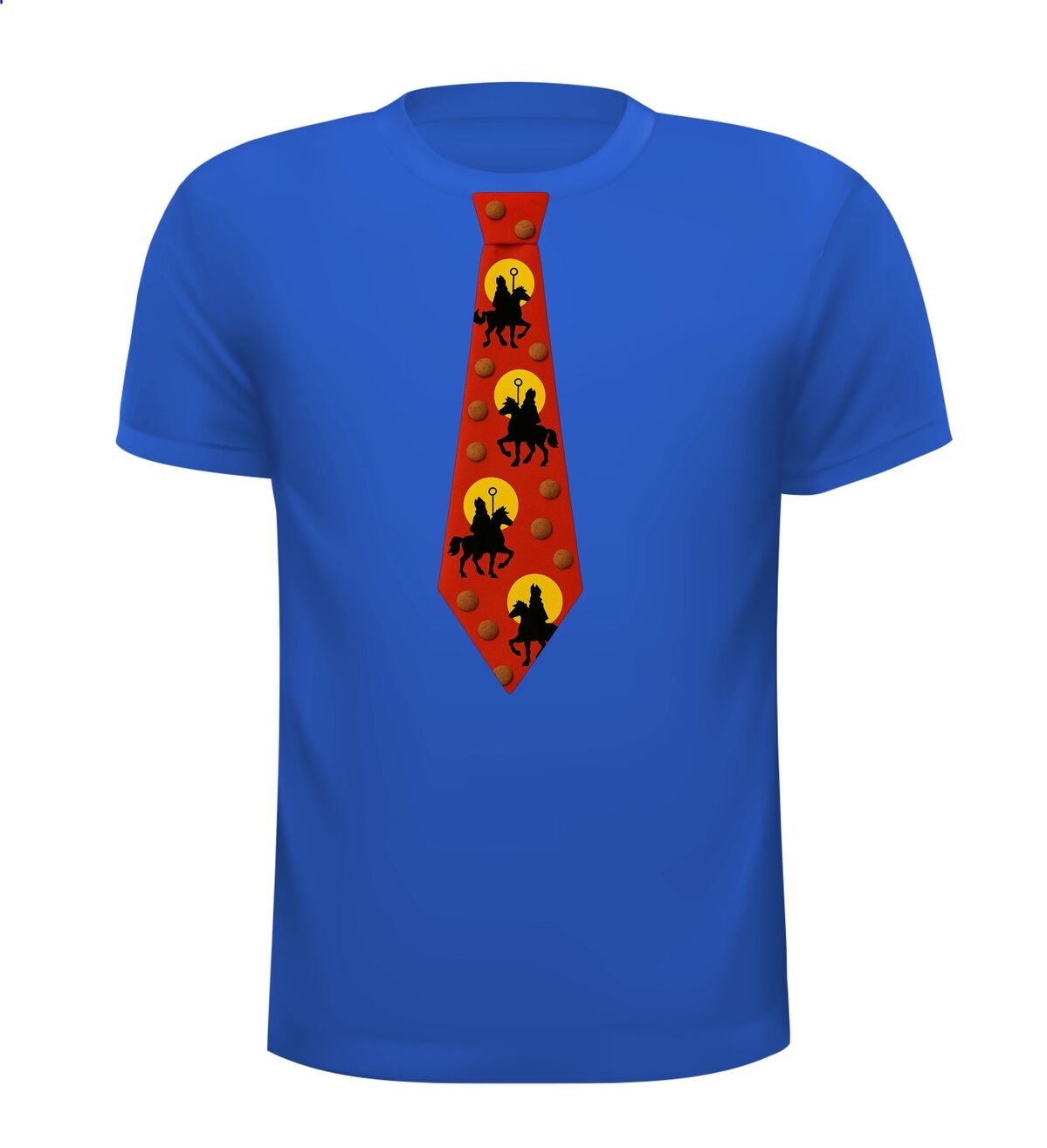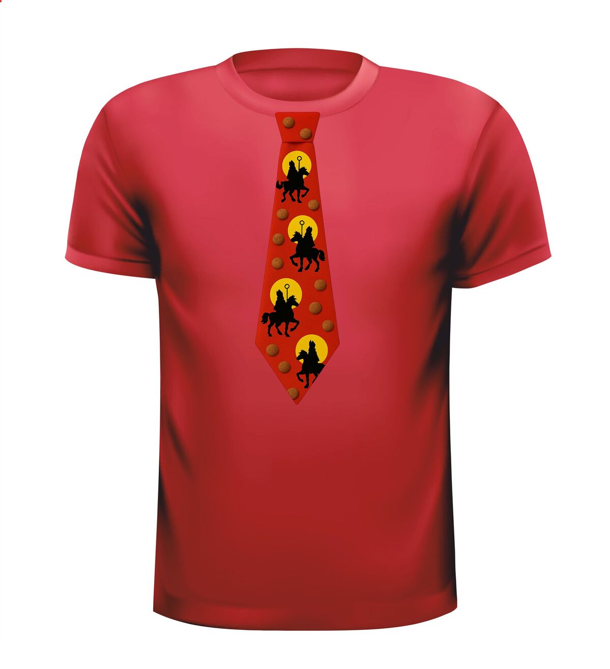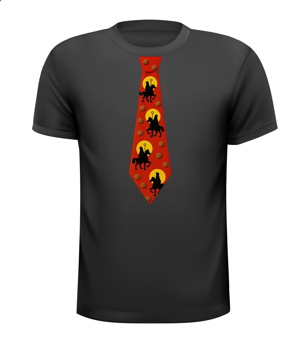 Met dit vrolijke Sinterklaas-stropdas op je T-shirt steel jij gegarandeerd de show bij elk pakjesavond-feest. De klassieke rode achtergrond vol knapperige pepernoten en de trotse silhouetten van Sinterklaas op zijn paard brengen meteen de warme decembermagie tot leven. Perfect voor wie zijn liefde voor het Sinterklaasfeest met een knipoog wil dragen — feestelijk, grappig en helemaal in de sfeer van het heerlijk avondje