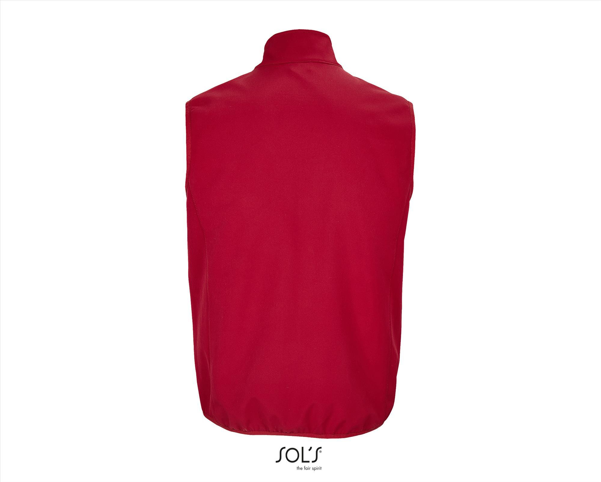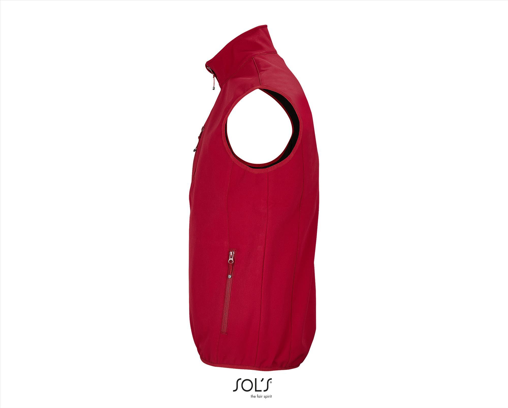 Een 3 laags Softshel Bodywarmer peper rood voor heren met gerecycled polyester. Merk SOL'S Falcon BW Men. Materiaal:94% Recycled Polyester - 6% Elastane. Dikte:270 g/m2. Foto met model erop is een sfeer foto kleur buiten beschouwing houden. Land van herkomst:Bangladesh.