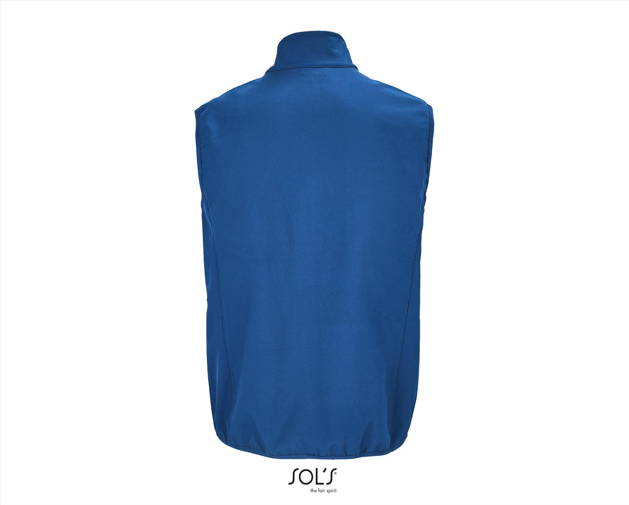 Een 3 laags Softshel Bodywarmer royal blauw voor heren met gerecycled polyester. Merk SOL'S Falcon BW Men. Materiaal:94% Recycled Polyester - 6% Elastane. Dikte:270 g/m2. Foto met model erop is een sfeer foto kleur buiten beschouwing houden. Land van herkomst:Bangladesh.
