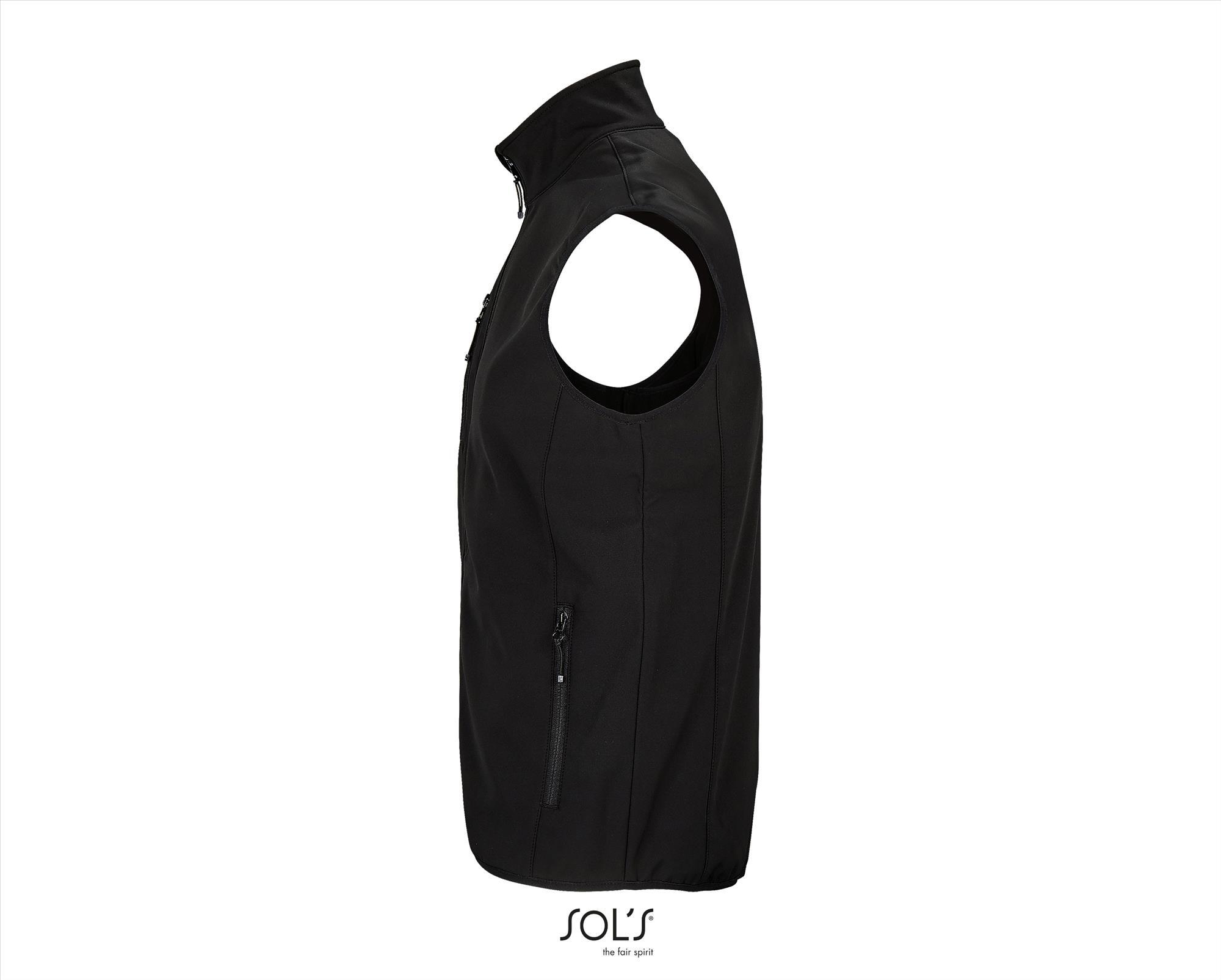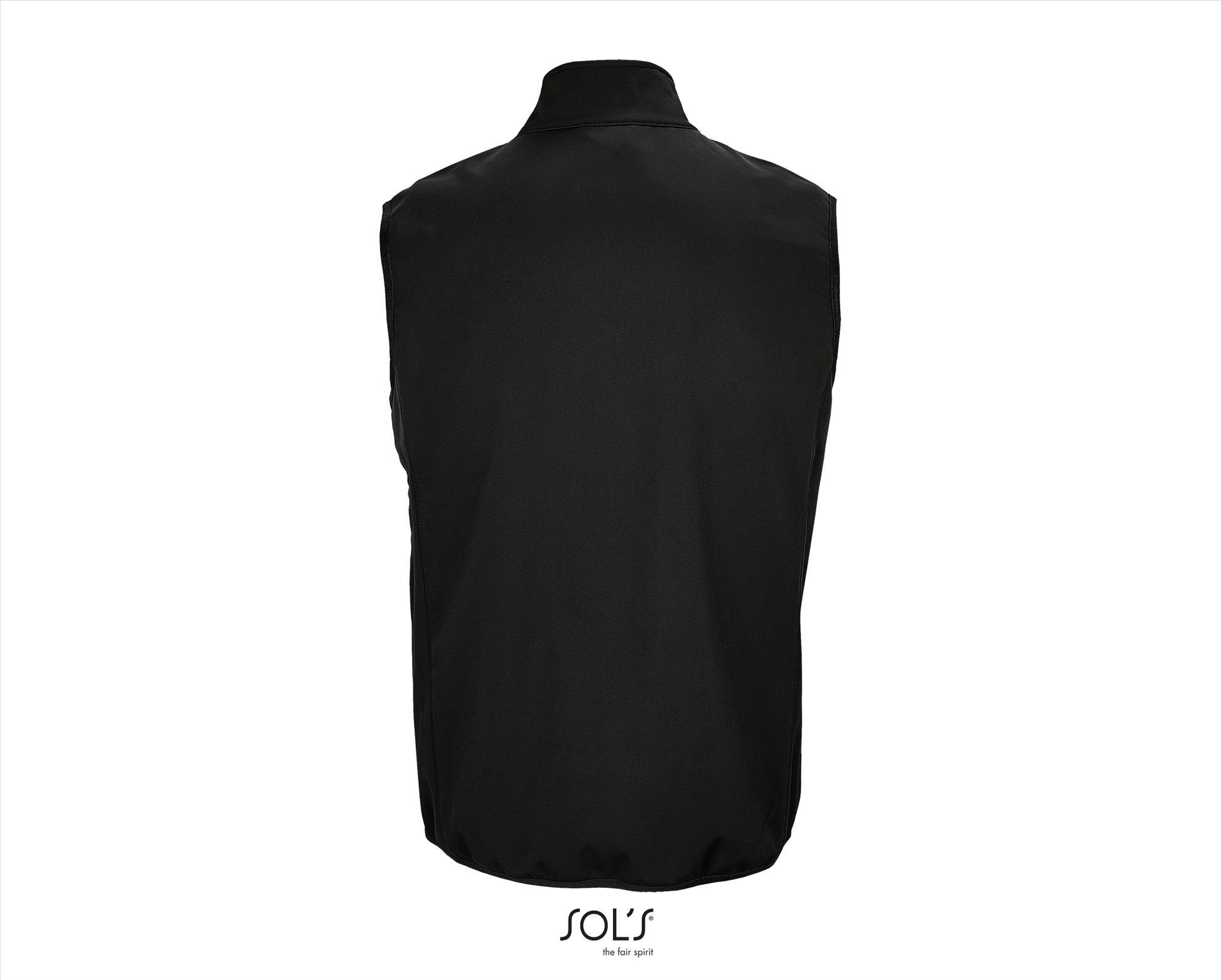 Een 3 laags Softshel Bodywarmer zwart voor heren met gerecycled polyester. Merk SOL'S Falcon BW Men. Materiaal:94% Recycled Polyester - 6% Elastane. Dikte:270 g/m2. Foto met model erop is een sfeer foto kleur buiten beschouwing houden. Land van herkomst:Bangladesh.