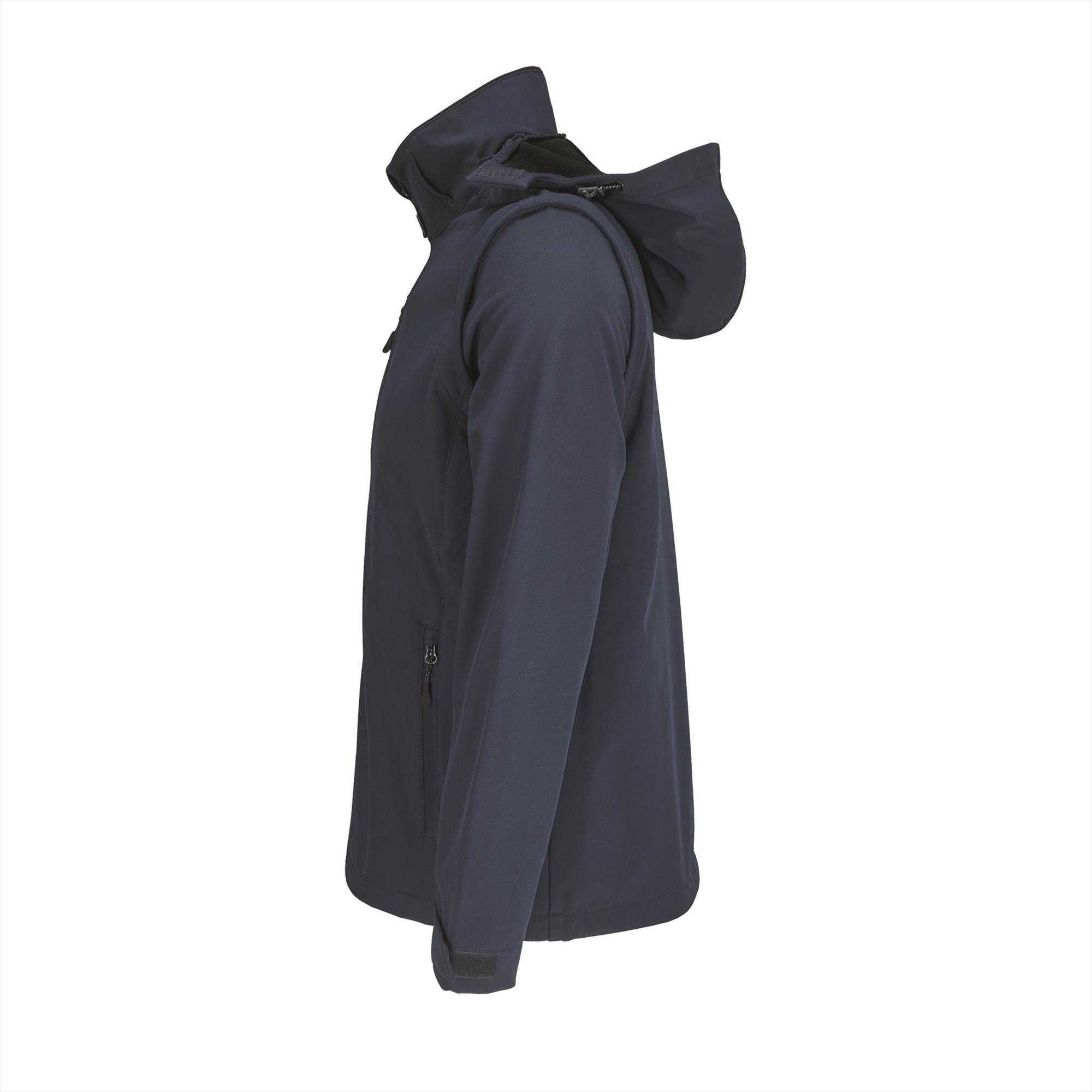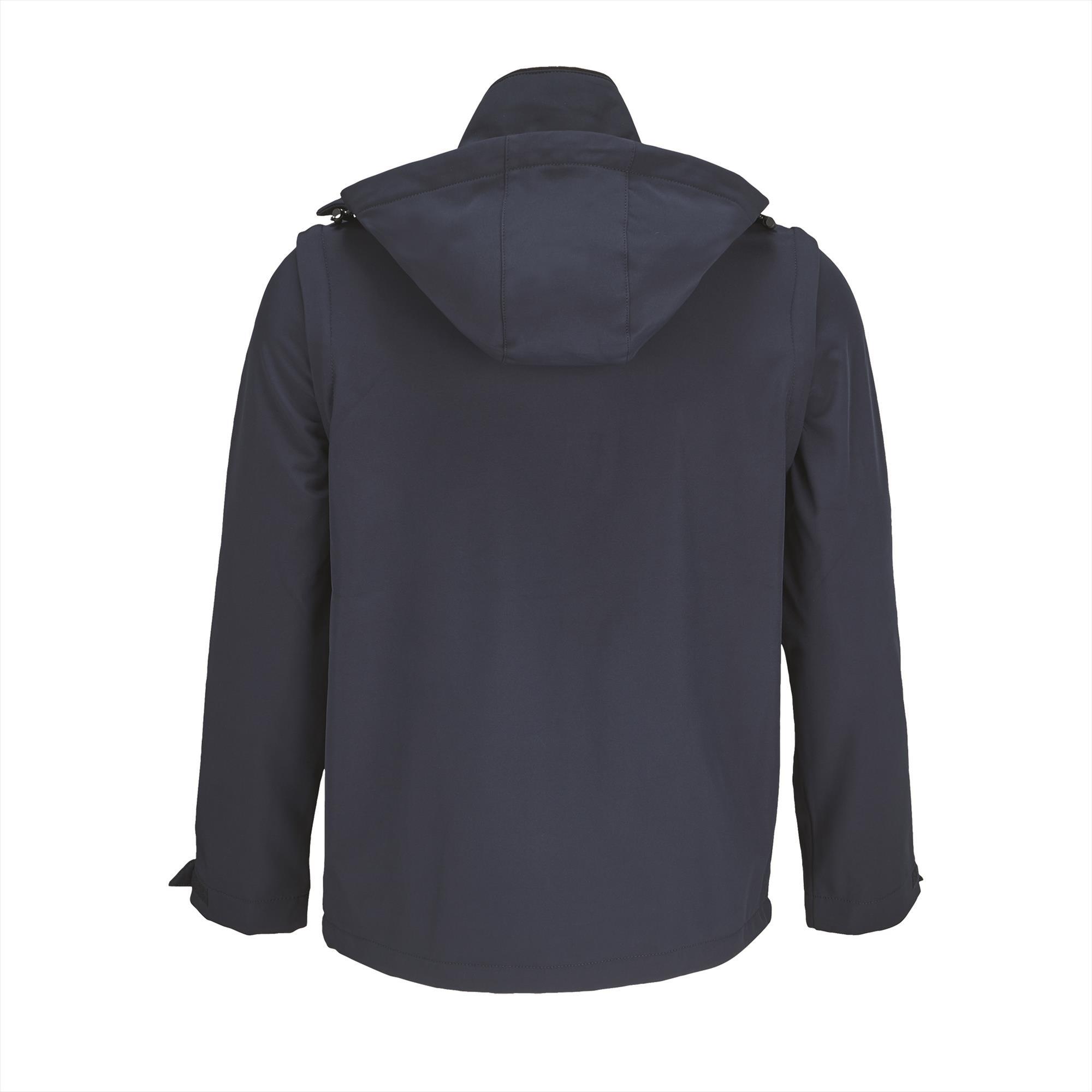 Softshell jacket gemaakt van voornamelijk gerecycled polyester. Heeft verstelbare manchetten met klittenband. Zij- en borstzakken met toon-op-toon omgekeerde nylon ritssluiting. Toon-op-toon metalen treklipje met reflecterend koord. Afneembare mouwen en capuchon. Verstelbare elastische capuchon en onderkant met toggle stopper. merk:SOL'S Falcon 3in1. Materiaal:94% Recycled Polyester - 6% Elastane. Foto met model erop is een sfeer foto kleur buiten beschouwing houden. Land van herkomst:Bangladesh.