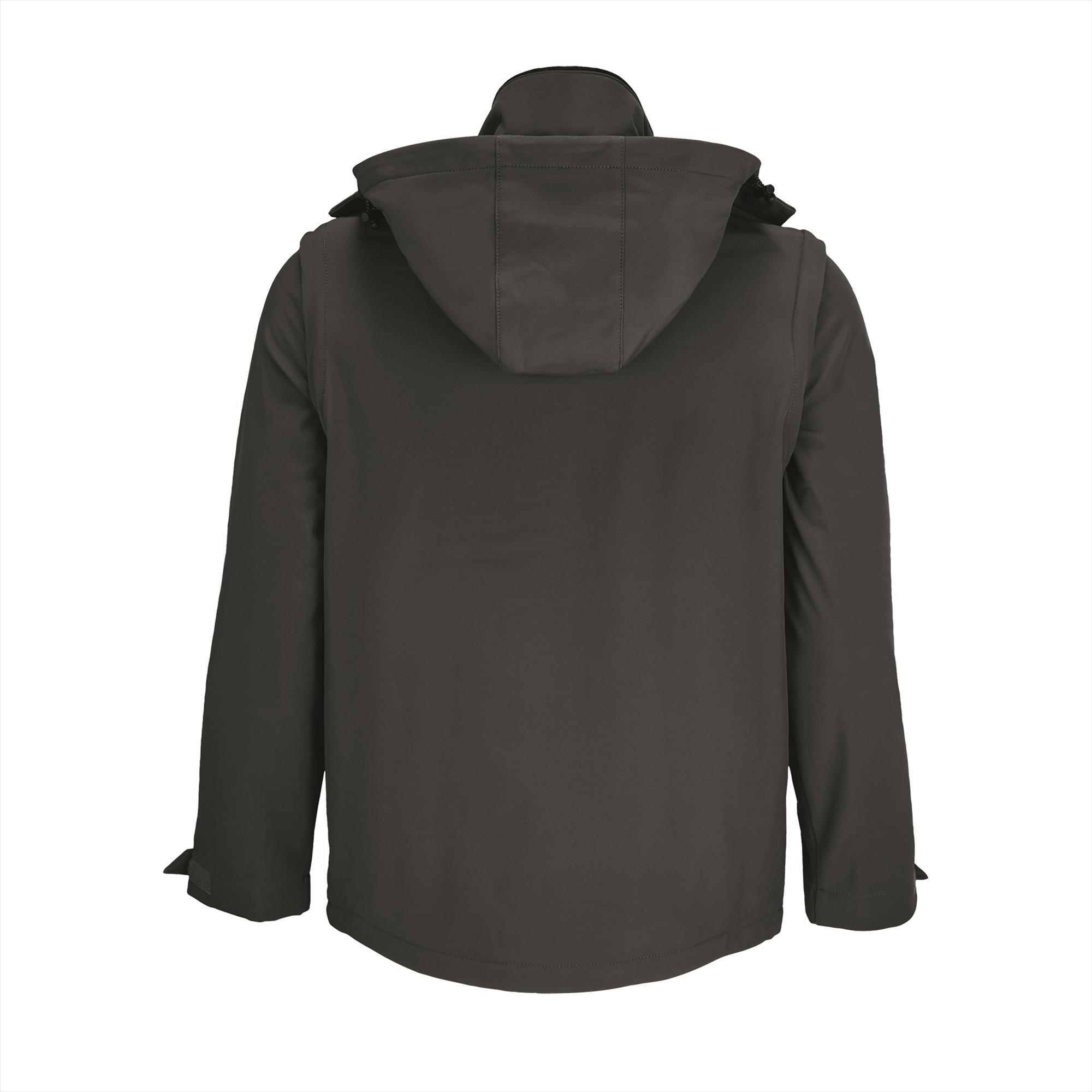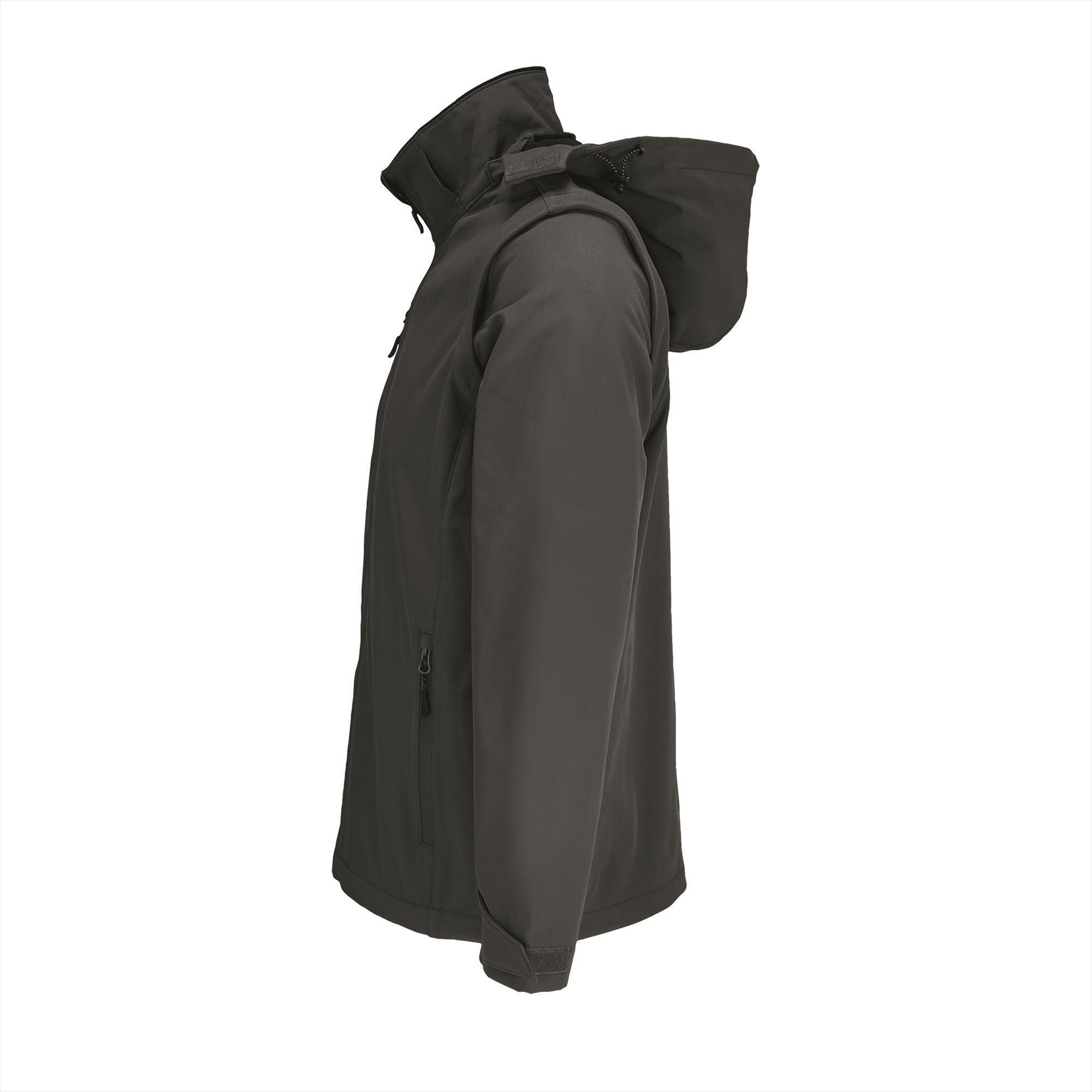 Softshell jacket gemaakt van voornamelijk gerecycled polyester. Heeft verstelbare manchetten met klittenband. Zij- en borstzakken met toon-op-toon omgekeerde nylon ritssluiting. Toon-op-toon metalen treklipje met reflecterend koord. Afneembare mouwen en capuchon. Verstelbare elastische capuchon en onderkant met toggle stopper. merk:SOL'S Falcon 3in1. Materiaal:94% Recycled Polyester - 6% Elastane. Foto met model erop is een sfeer foto kleur buiten beschouwing houden. Land van herkomst:Bangladesh.