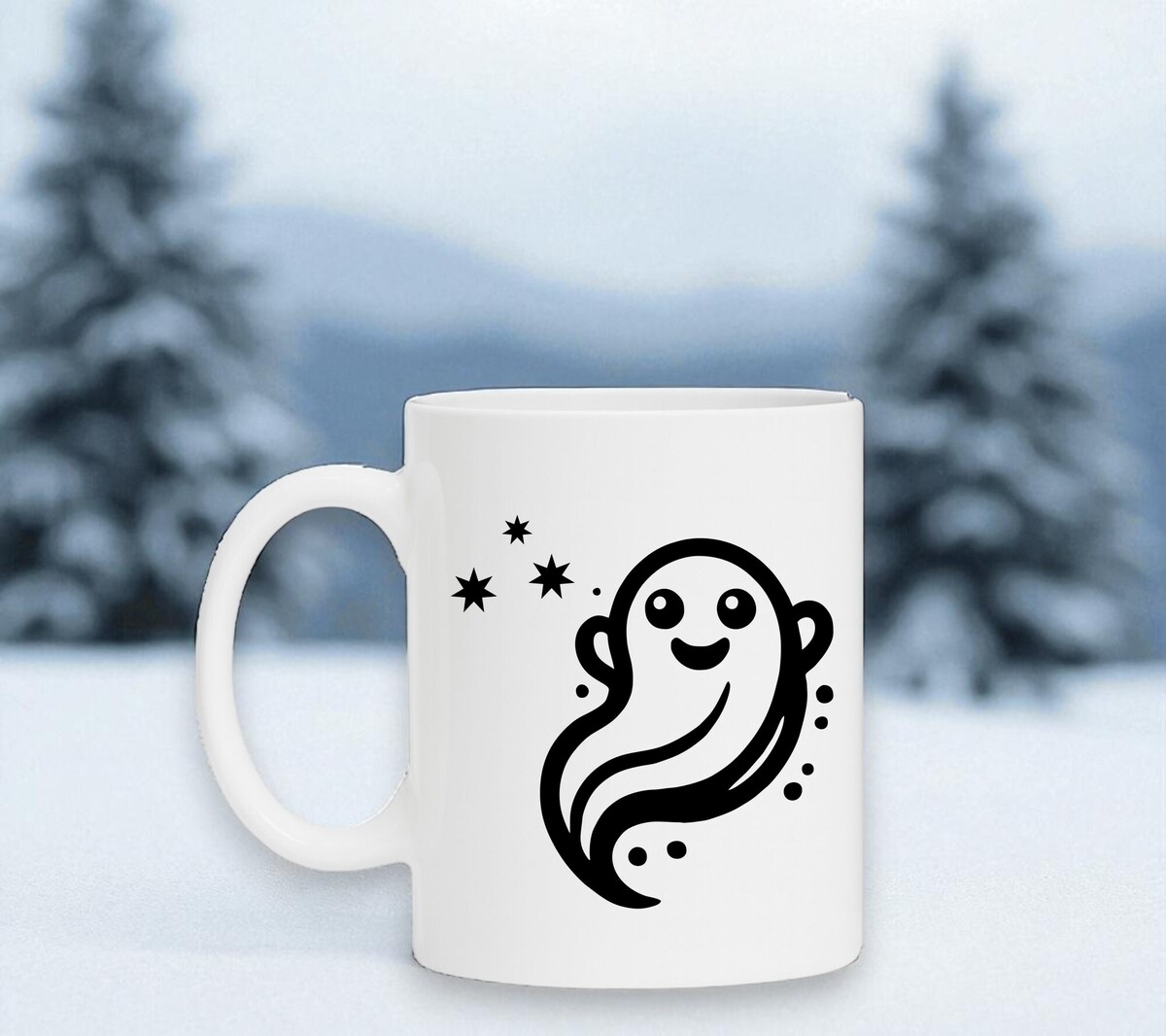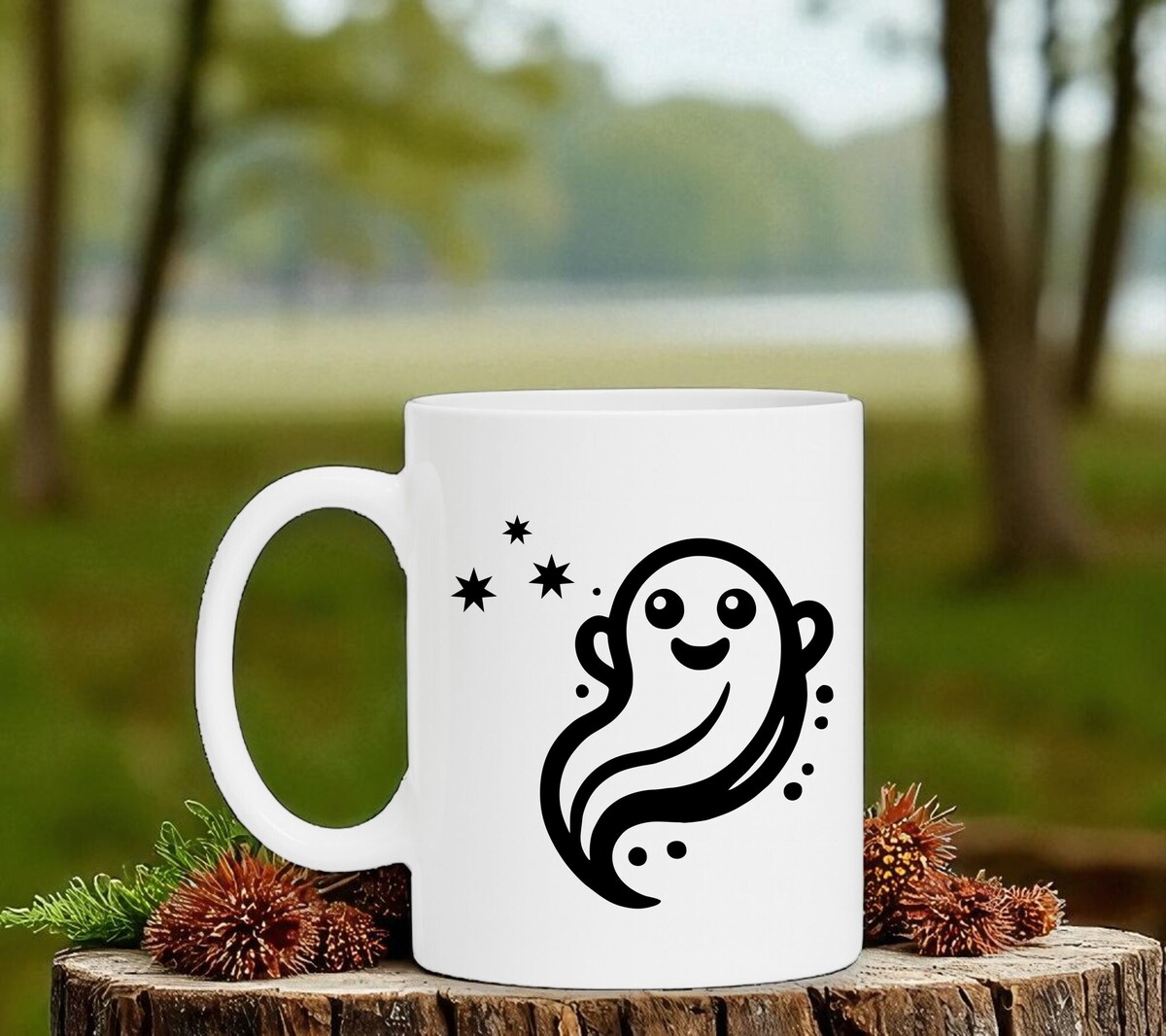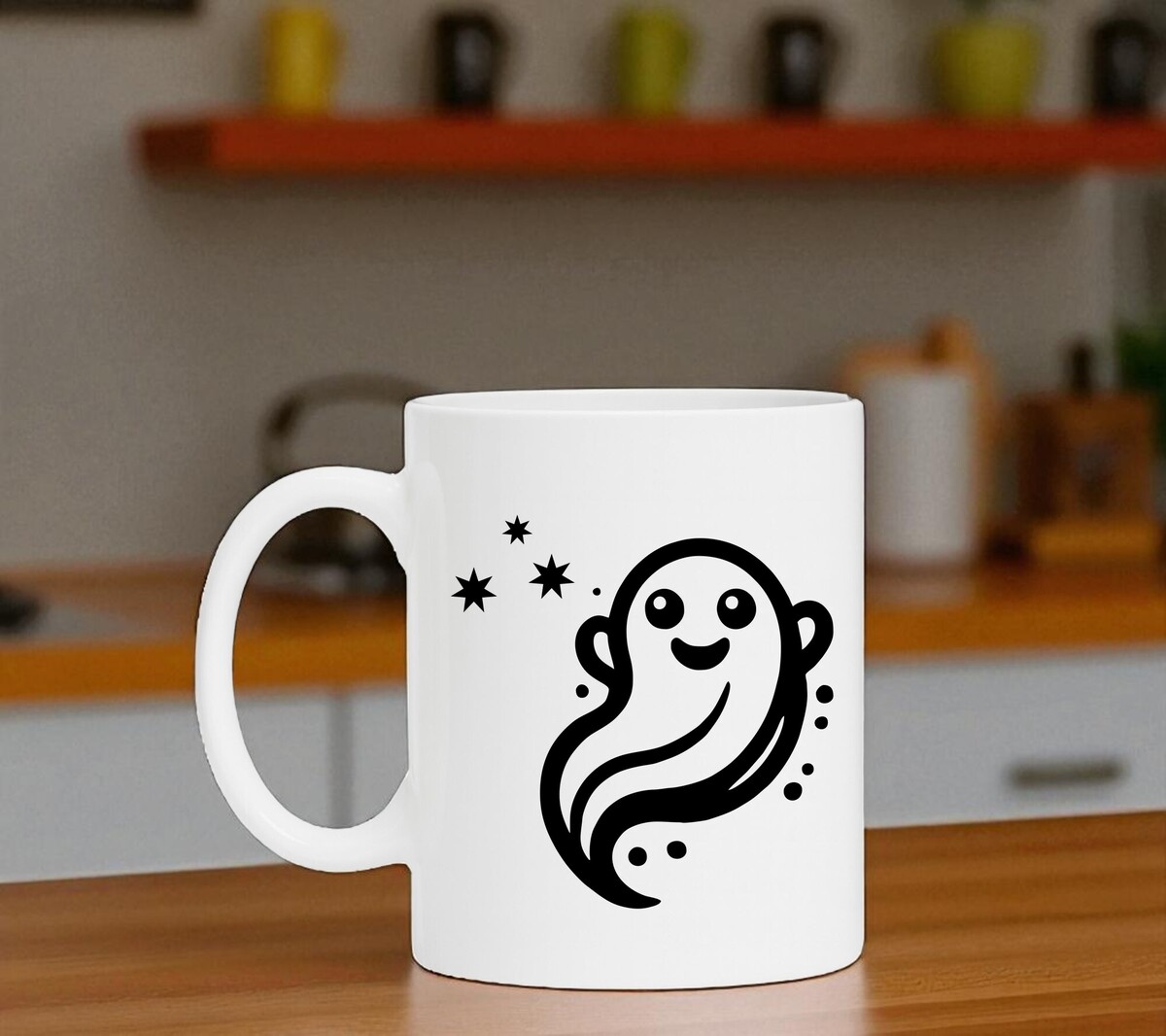 Spook mok voor Halloween. De witte koffie of thee mok is vaatwasserbestendig en magnetronbestendig. De mok heeft een hoogte van 96mm en een diameter van 80mm.