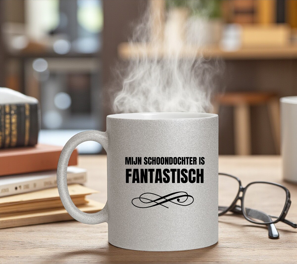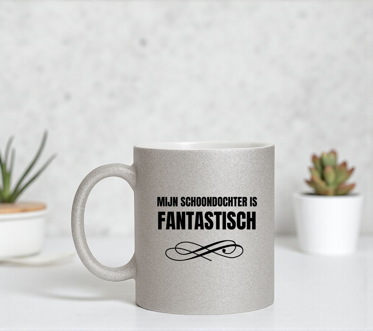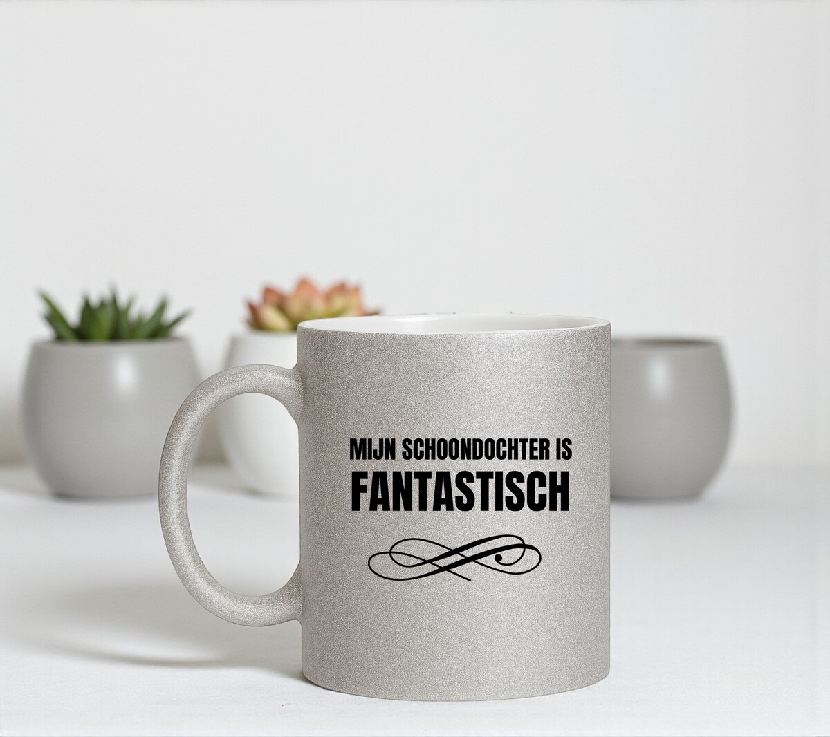 Wil je je schoondochter laten weten hoe blij je met haar bent? Of zoek je een cadeau dat nét wat origineler is dan bloemen of een fles wijn? Dan is deze zilveren glitter mok precies wat je zoekt. Met de tekst “Mijn schoondochter is fantastisch” laat je haar elke dag opnieuw voelen hoe gewaardeerd ze is en dát in de vorm van een stevige, glinsterende mok die niemand kan negeren.