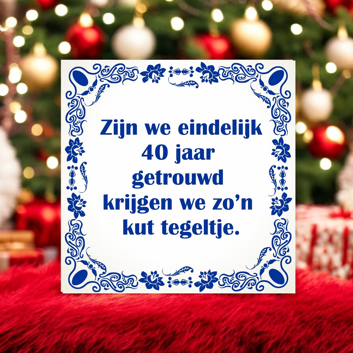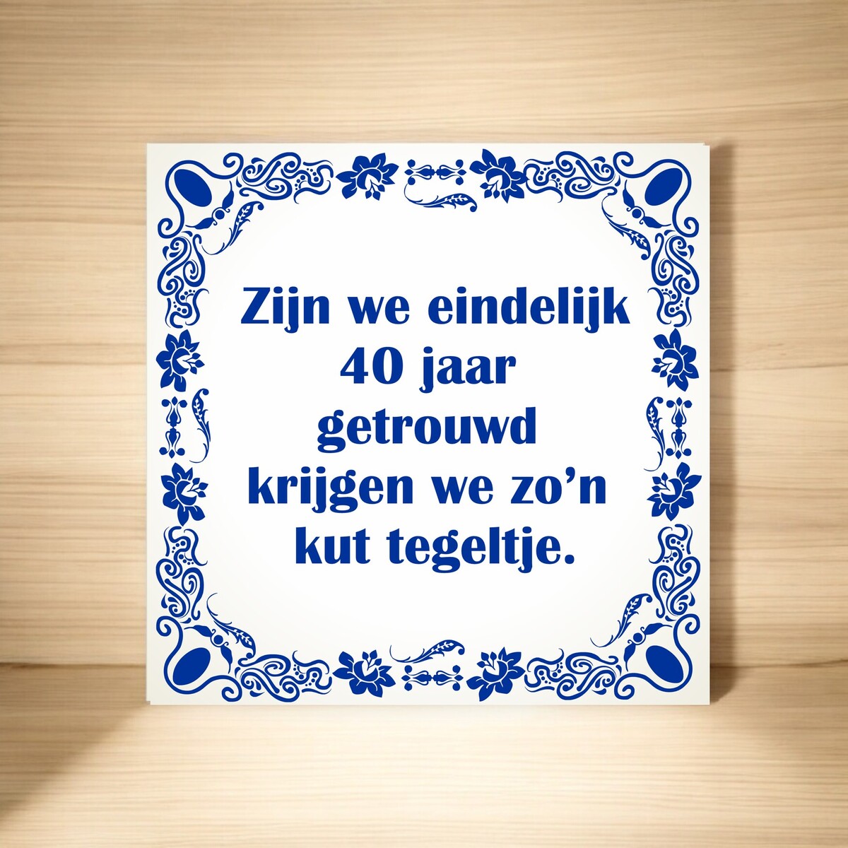Leuke spreukentegel met de tekst: Zijn we eindelijk 40 jaar getrouwd krijgen we zo'n kut tegeltje. Het tegeltje heeft een afmeting van 15cm x 15cm.