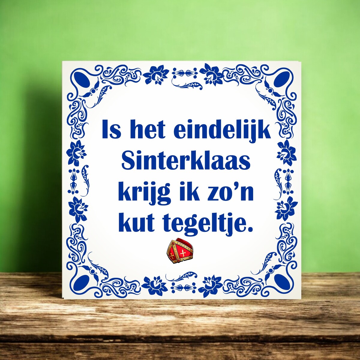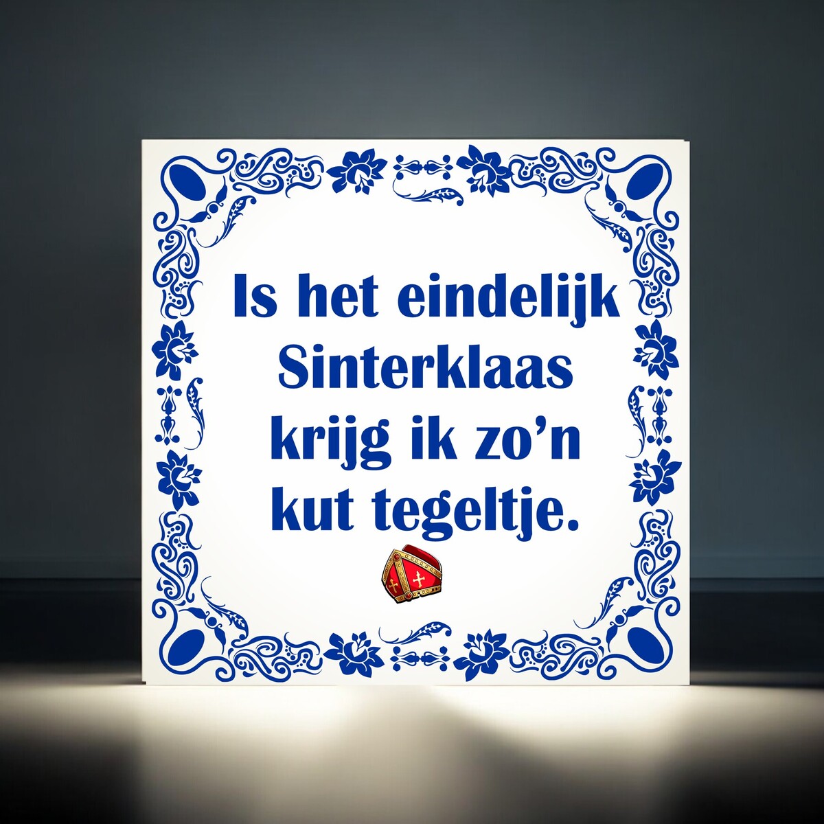Spreukentegel 15x15cm met de spreuk : is het eindelijk Sinterklaas krijg ik zo'n kut tegeltje.