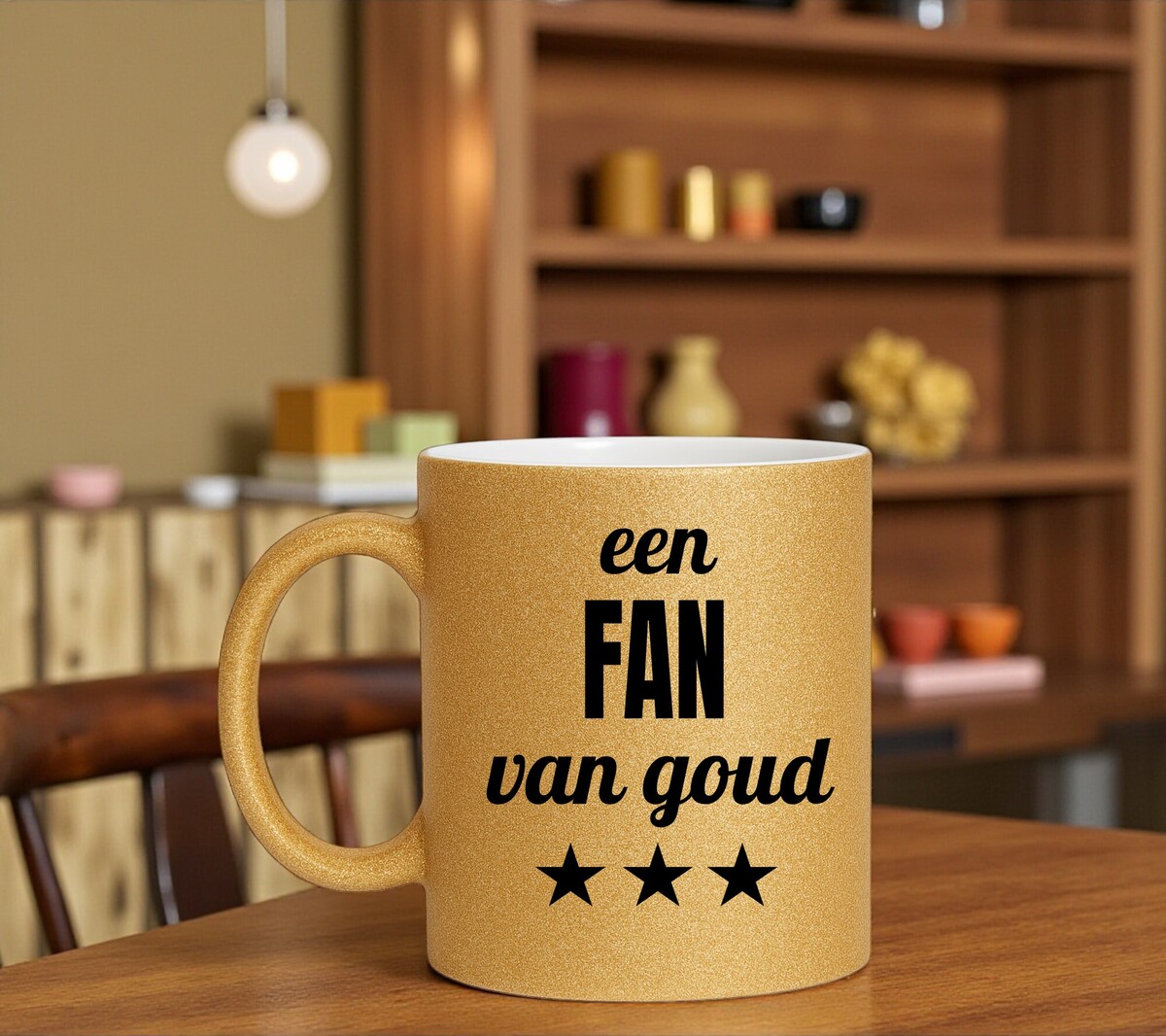 Laat de glans van goud deze fan elke ochtend begroeten met onze sprankelende gouden glittermok, speciaal ontworpen voor de ware fan van goud! Deze betoverende mok voegt een vleugje luxe toe aan zijn of haar dagelijkse routine en laat haar elke slok koesteren in stijl. Met zijn oogverblindende gouden glitterafwerking en op maat gemaakte bedrukking is deze mok niet alleen een drankgerei, maar een schitterend statement van haar liefde voor alles wat glanst. Of het nu gaat om haar ochtendkoffie, middagthee of avondchocolademelk, elke sip wordt omhuld door een stralende gloed van glamour. Breng wat glans in zijn of haar leven en verras haar met onze gouden glittermok. Bestel vandaag nog en geef haar een cadeau dat net zo schitterend is als zijzelf!