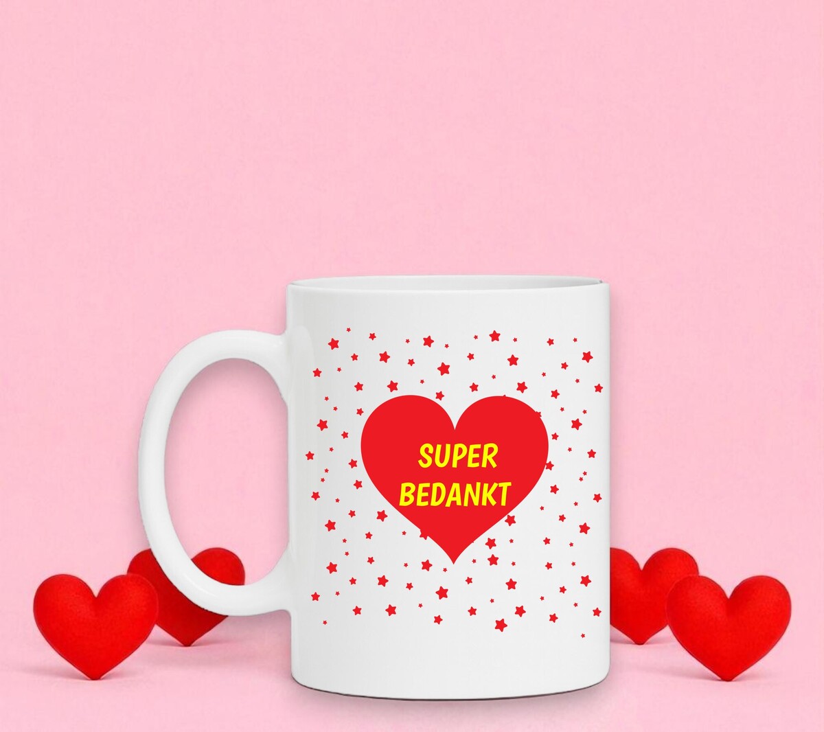 Een superleuke koffiemok met de tekst 'super bedankt'. Leuk om cadeau te geven aan hem of haar die jouw geholpen heeft.