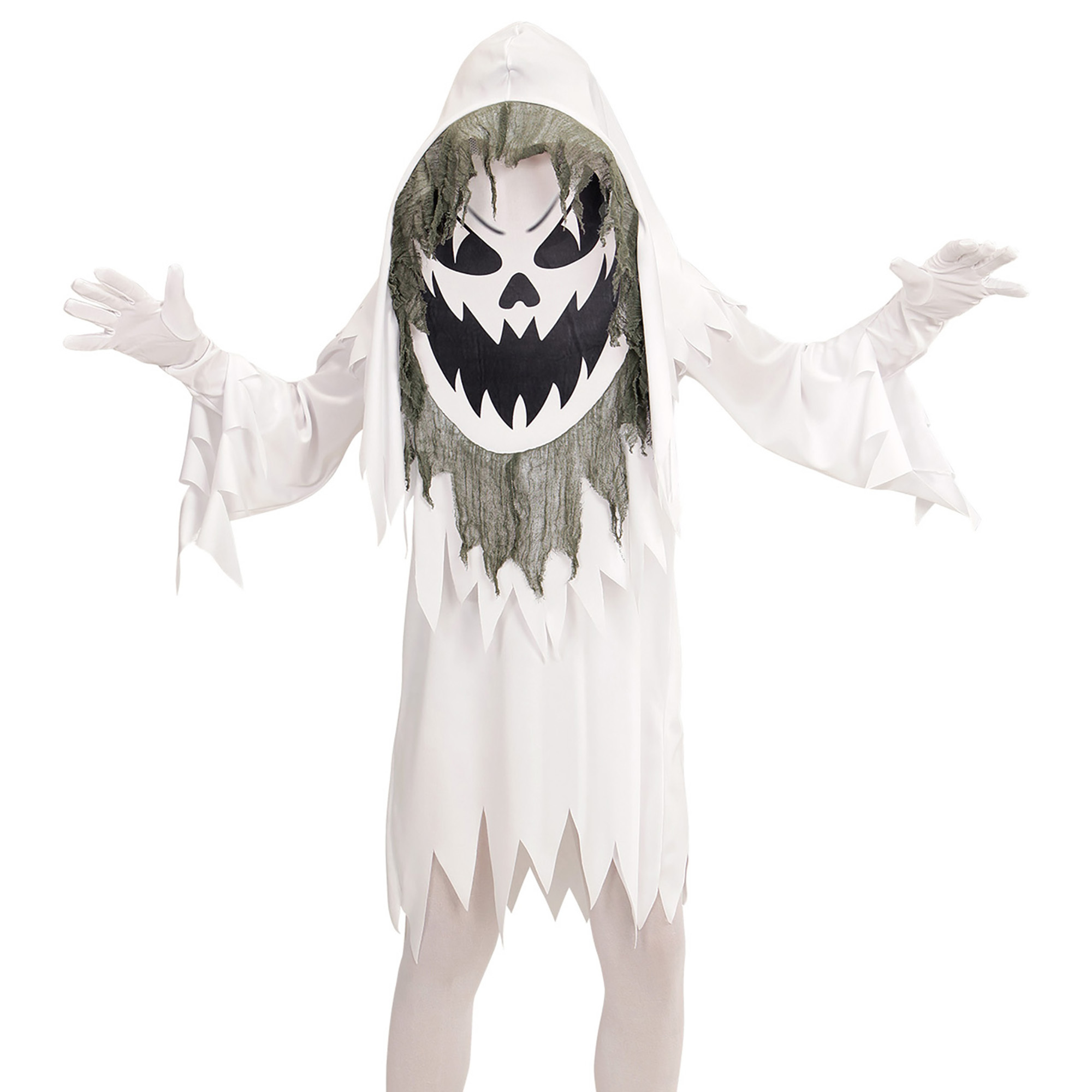De meeste halloween spoken kostuums zijn angstaanjagend. Deze spook outfit is erg grappig. Het masker is extra groot. Dit spokenpak voor kinderen wordt in 1 maat geleverd maat 158.