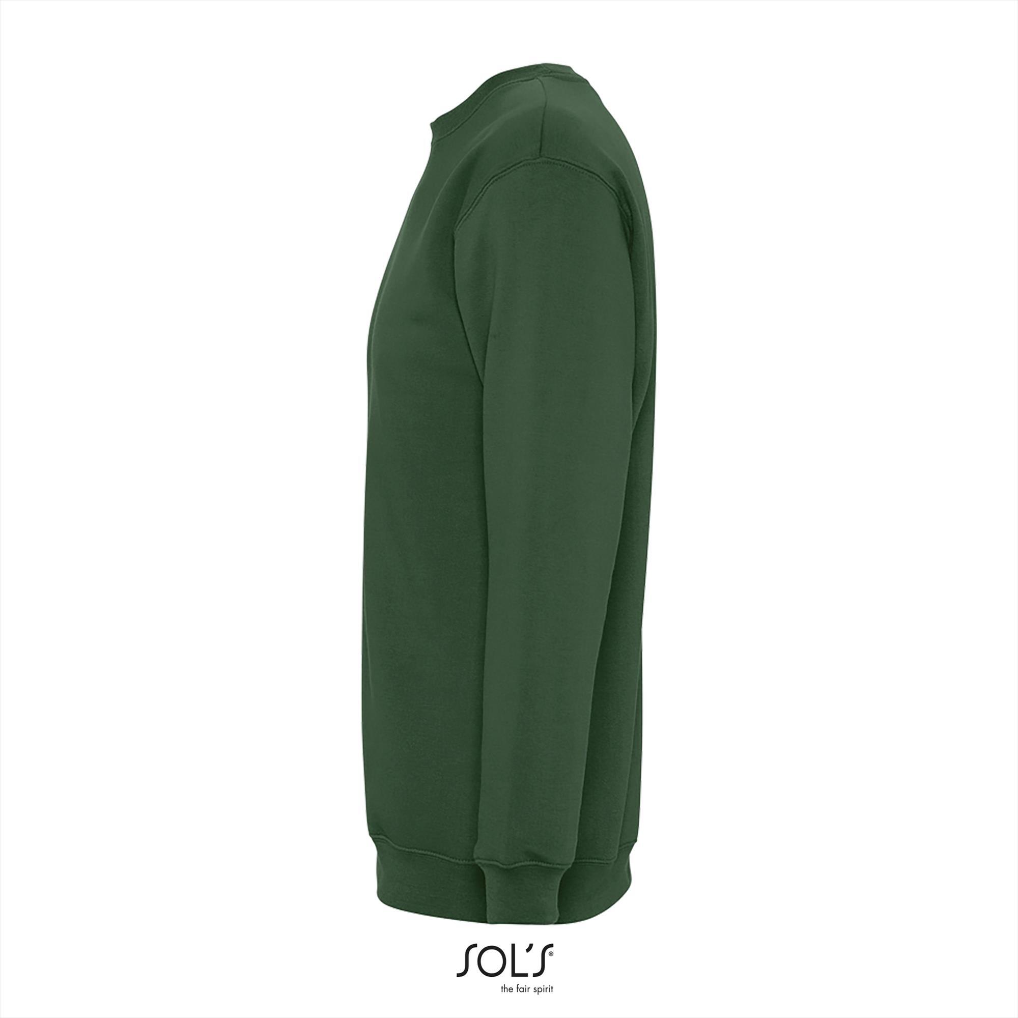 Donker groene sweatshirt mannen met polyester bedrukbaar Unisex Verstevigingsband in de nek. Manchetten- kraag en onderkant ribboord met elastaan. Brushed inside. Geruwd molton. Opgetrokken mouwen. Materiaal: 50% Cotton - 50% Polyester Merk: SOL'S New Supreme herkomst:Pakistan.