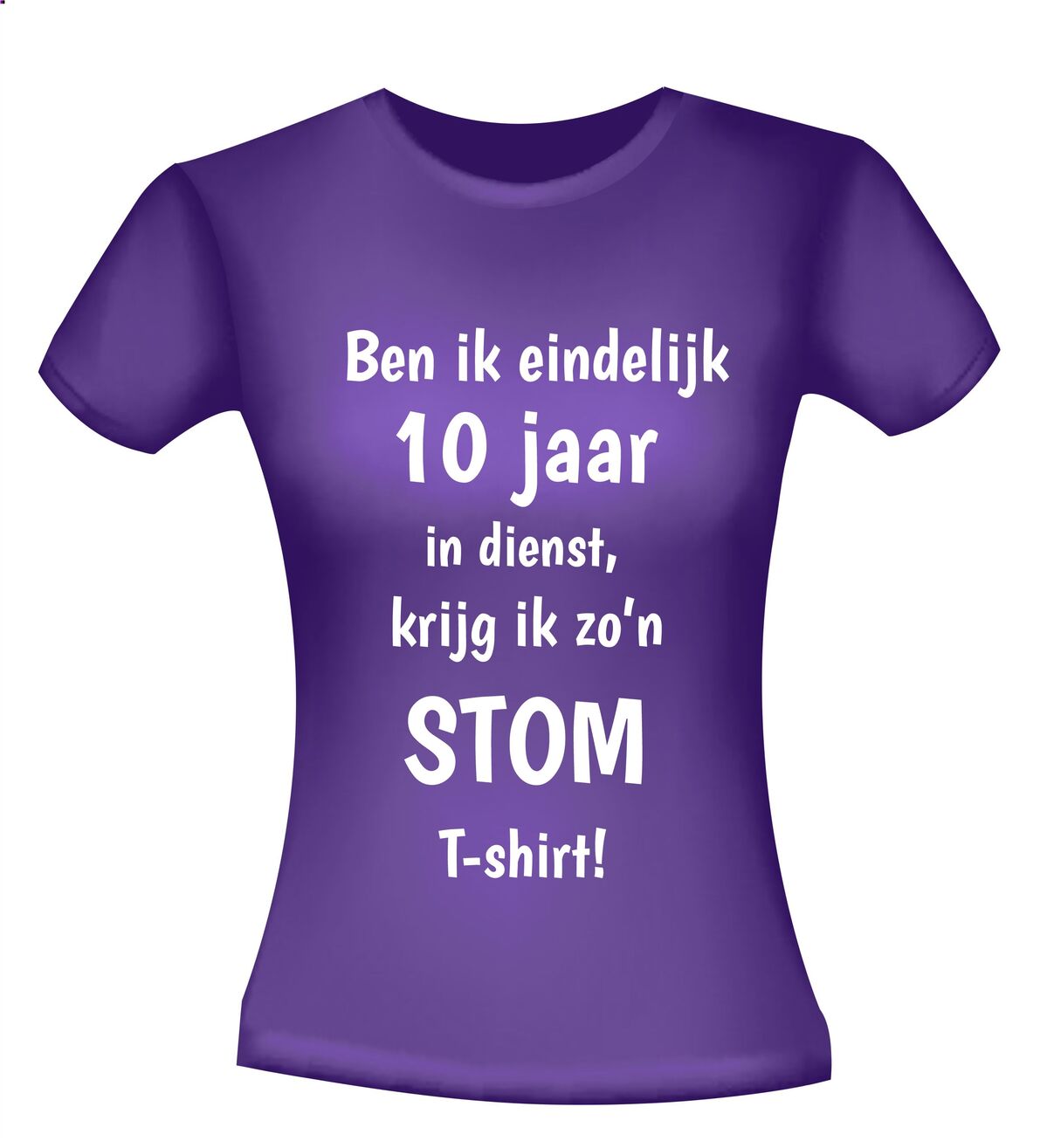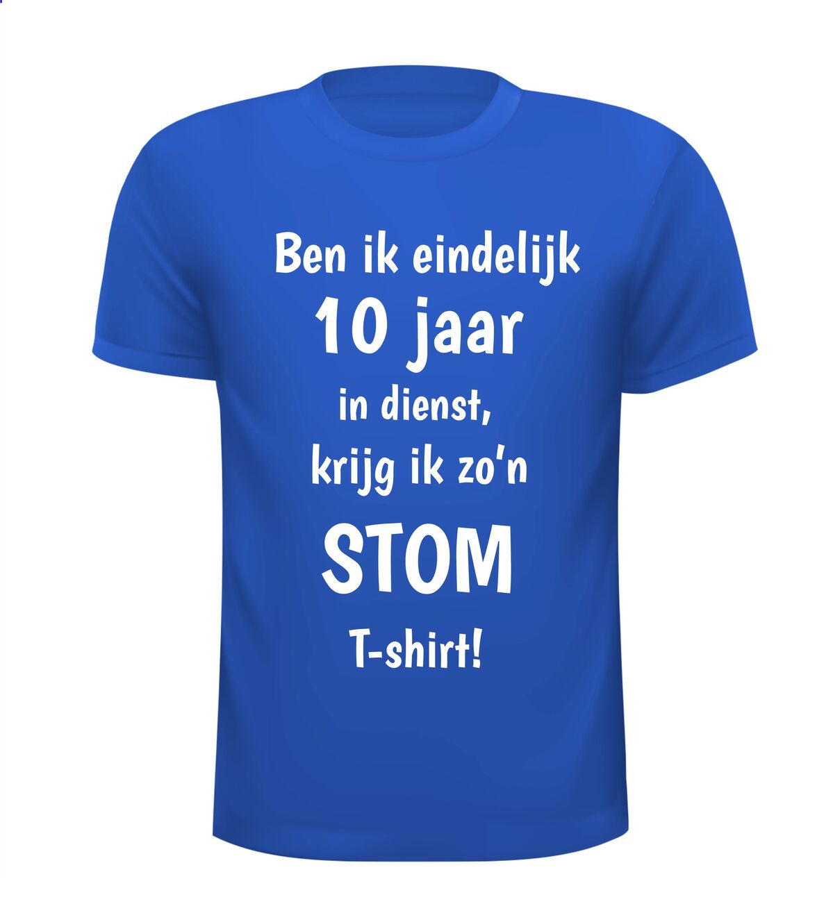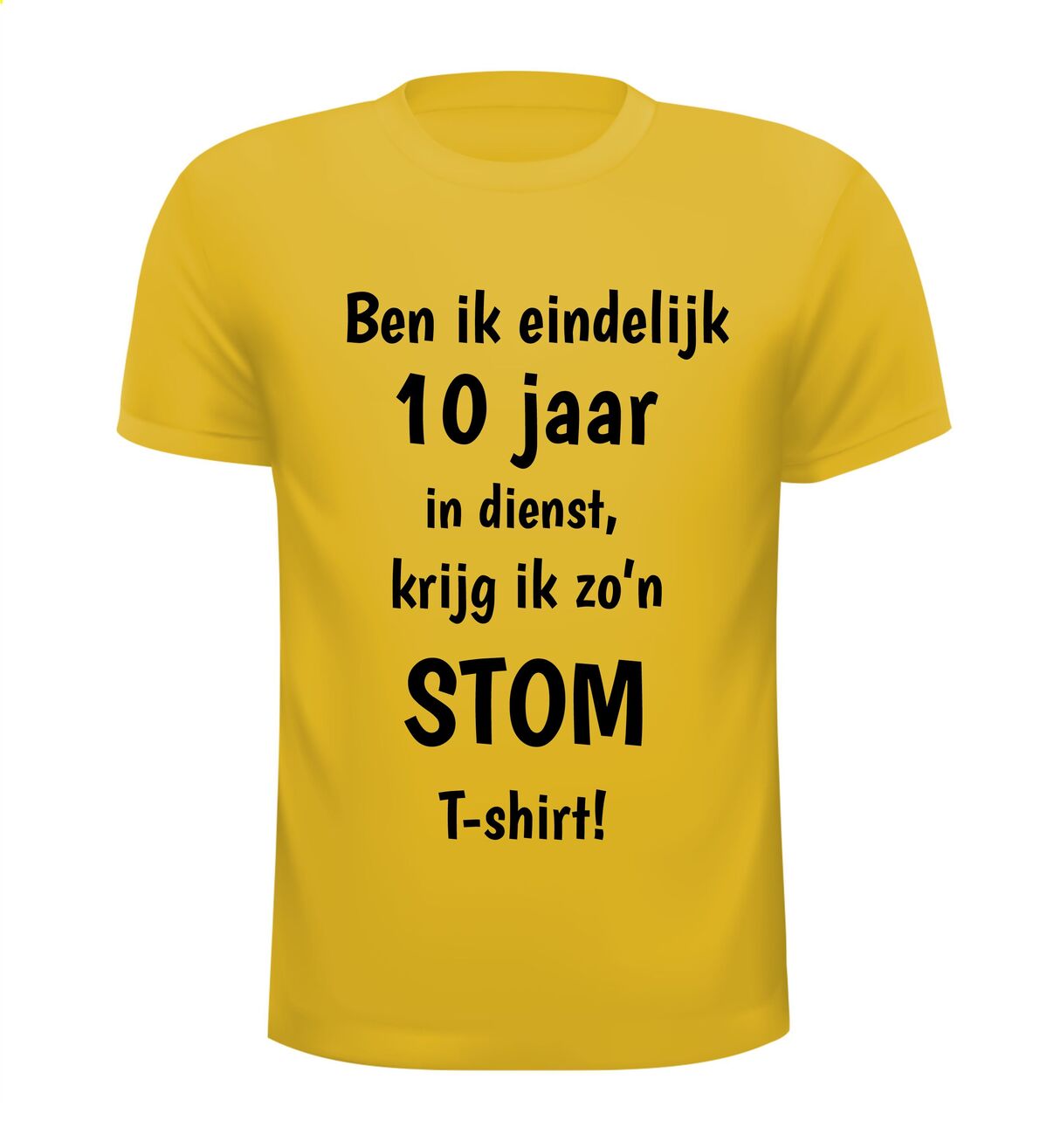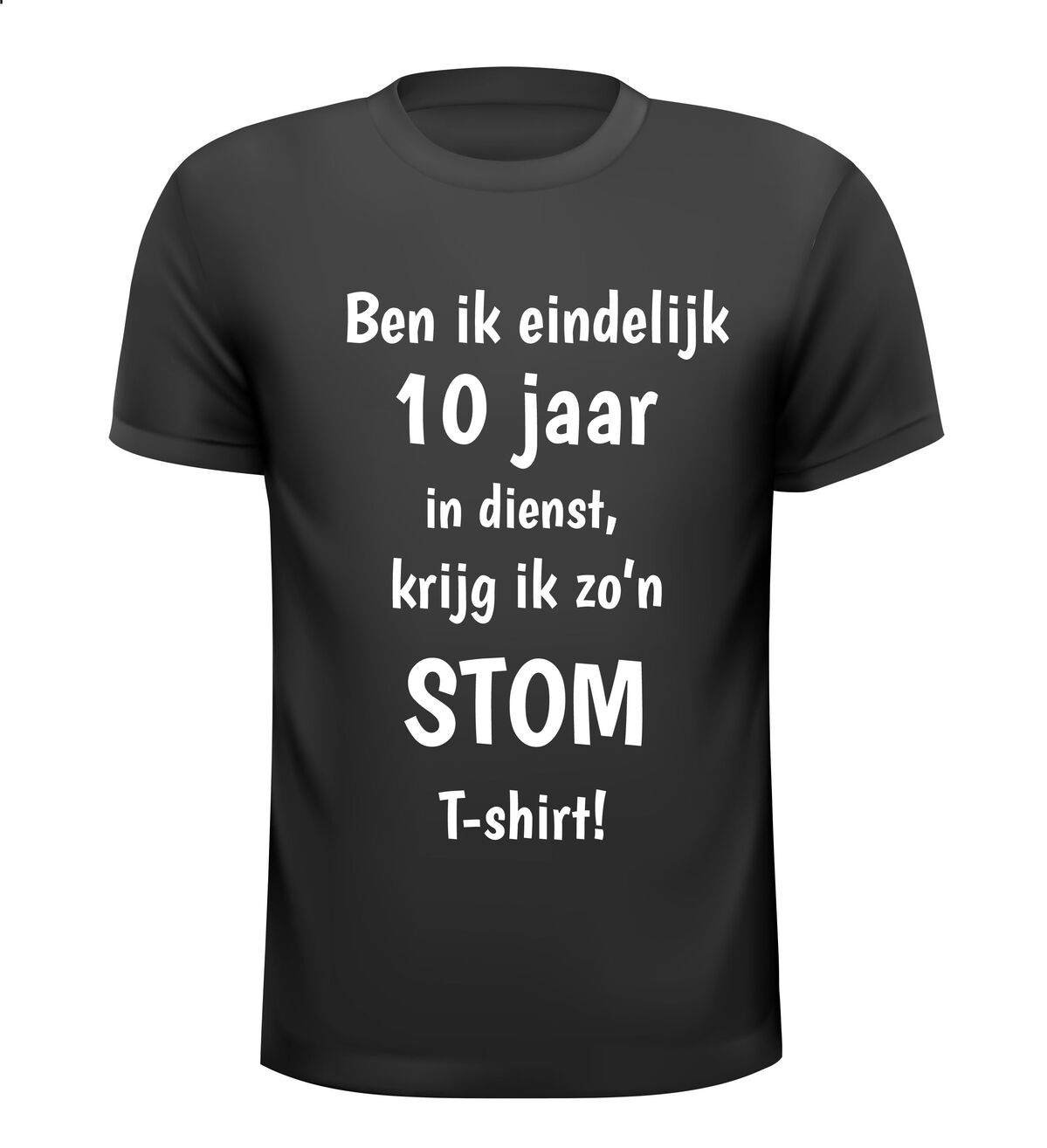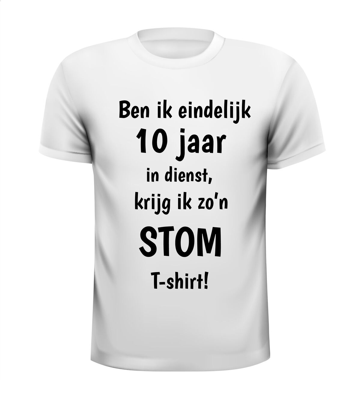 Een grappig T-shirt voor hem of haar die 10 jaar bij hetzelfde bedrijf werkt. T-shirt ben ik eindelijk 10 jaar in dienst krijg ik zo'n stom T-shirt!