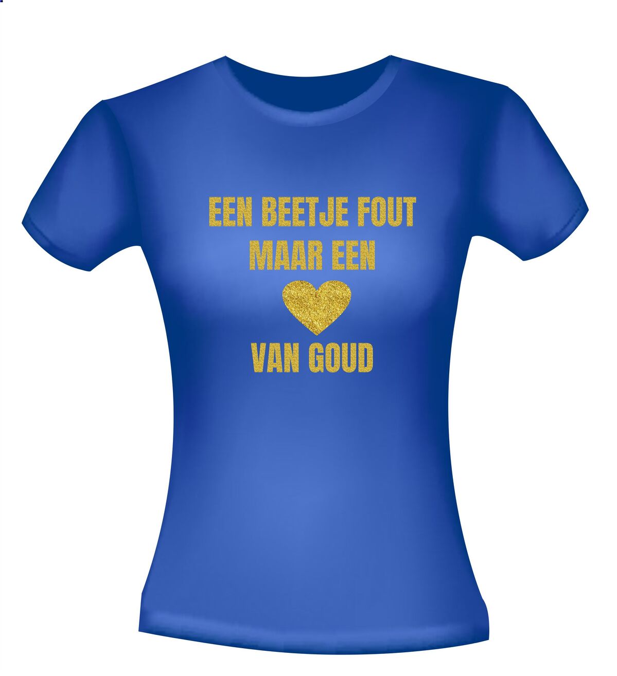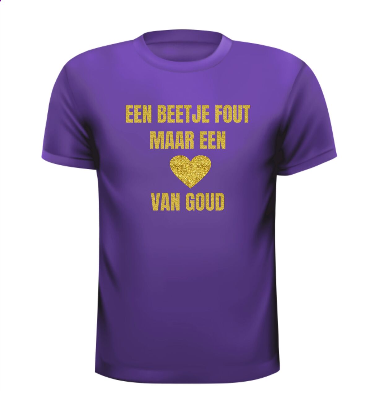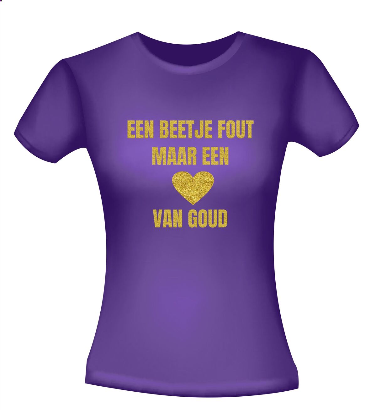 Een mooi t-shirt voorzien van een gouden glitter opdruk met de tekst : Een beetje fout maar een hart van goud! Een super leuk verjaardags kado!