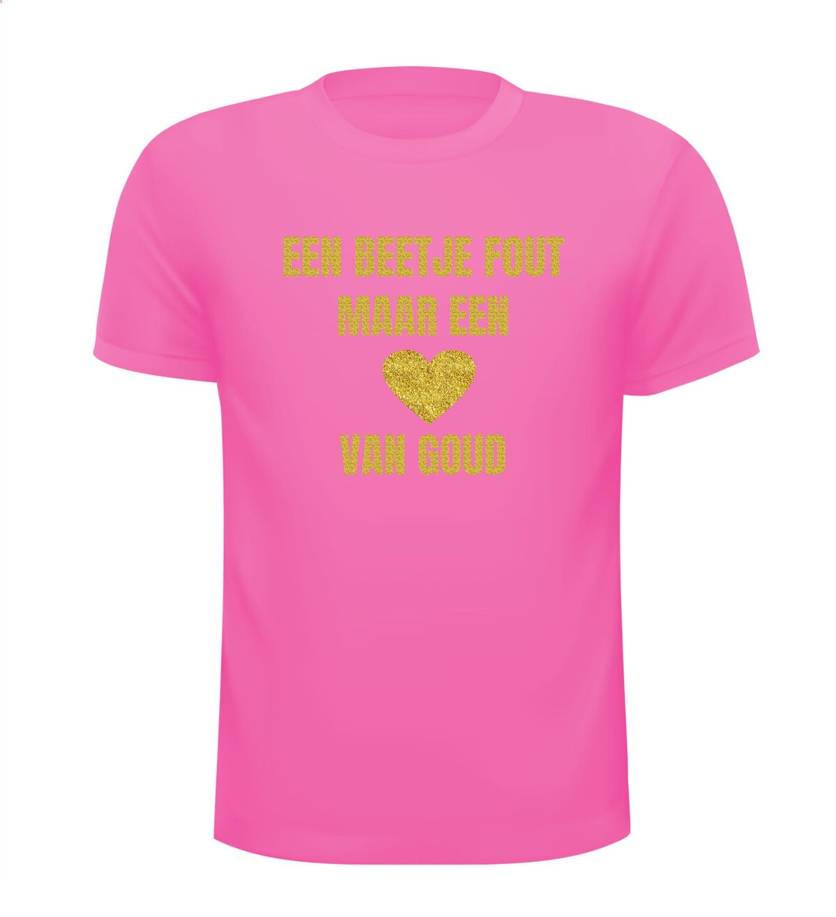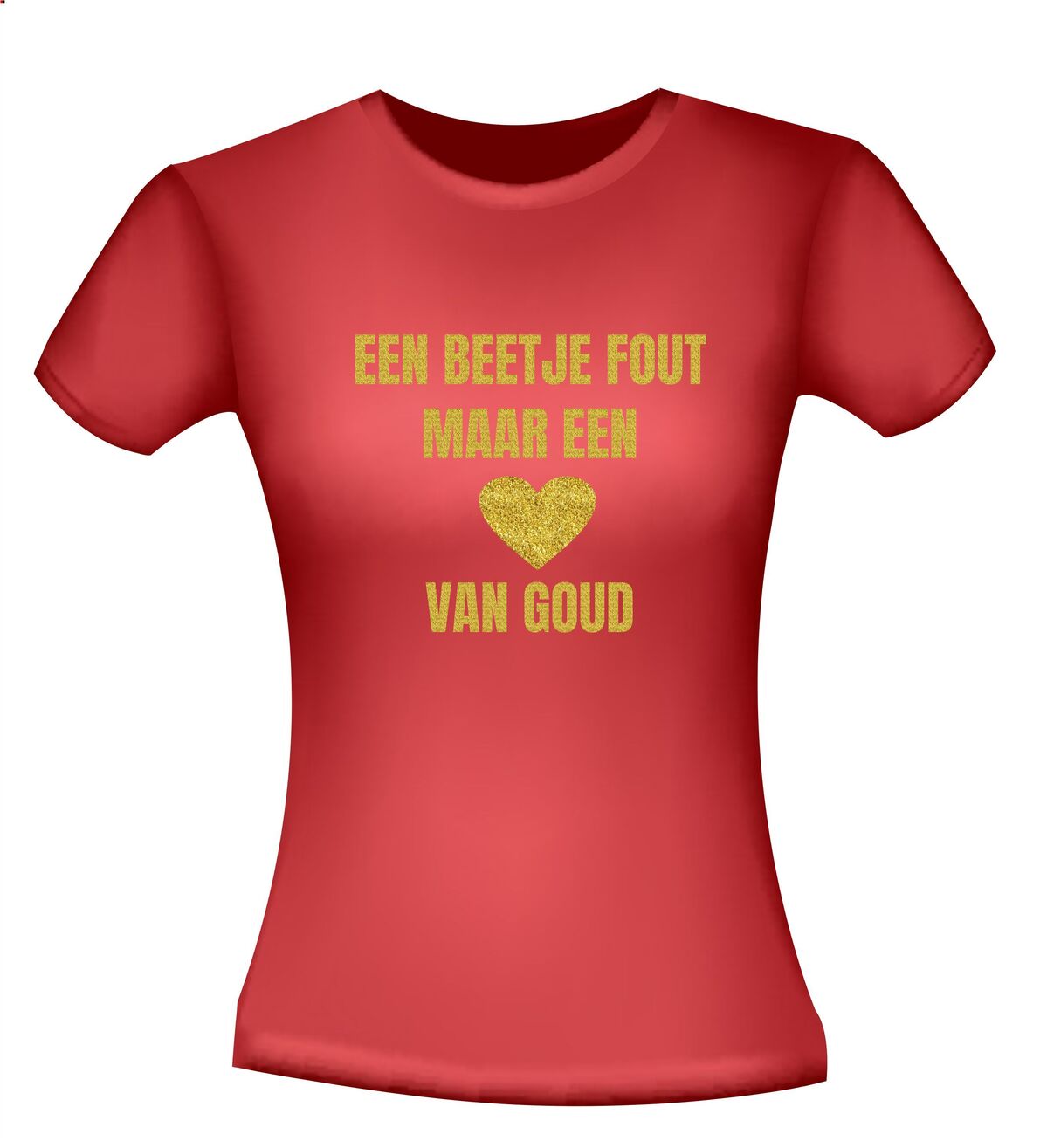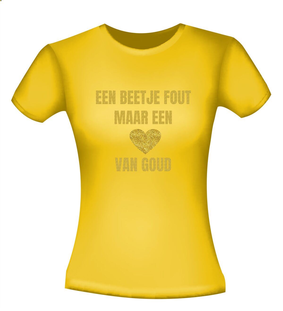 Een mooi t-shirt voorzien van een gouden glitter opdruk met de tekst : Een beetje fout maar een hart van goud! Een super leuk verjaardags kado!