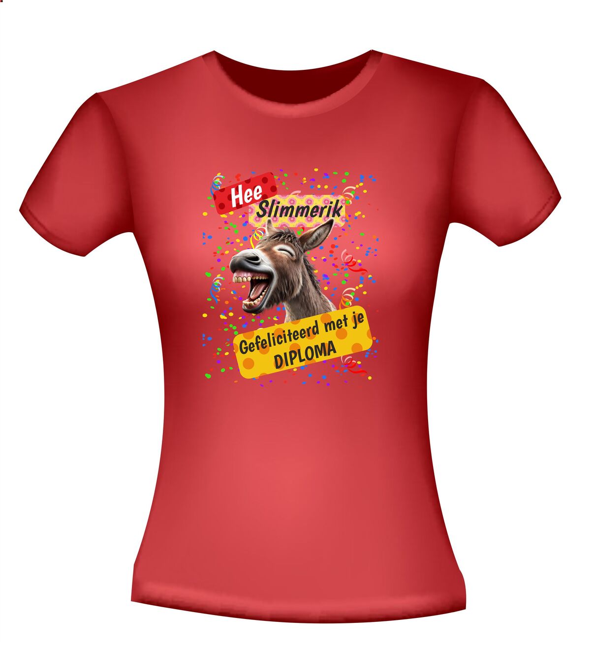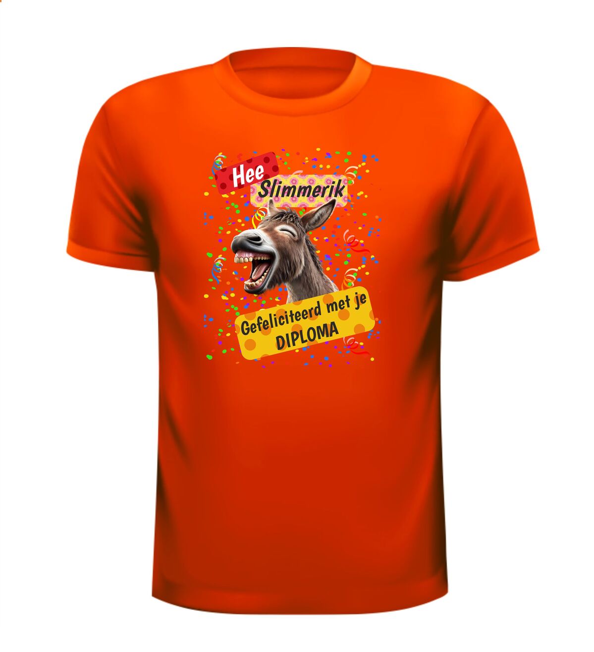 Een supervet cadeau om hem of haar te feliciteren met zijn of haar diploma. Op het T-shirt staat een ezel afgebeeld die uit de mok met zijn kop steekt afgebeeld en de tekst: “Hee slimmerik gefeliciteerd met je diploma.”