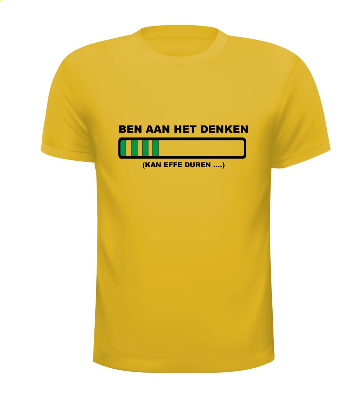 Met dit grappige T-shirt met de tekst ik ben aan het denken en daaronder subtiel kan even duren laat je op een humoristische manier zien dat niet alles altijd razendsnel hoeft te gaan. De combinatie van de grote, duidelijke hoofdtekst en de kleine toevoeging eronder zorgt voor een verrassend en komisch effect dat gegarandeerd een glimlach oplevert.