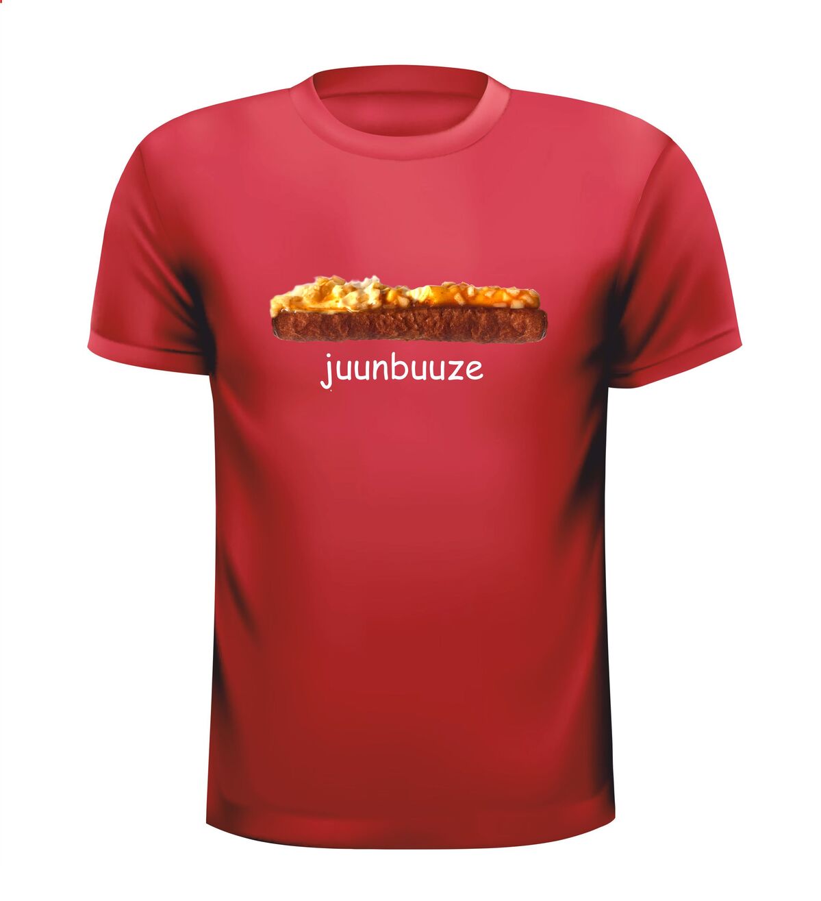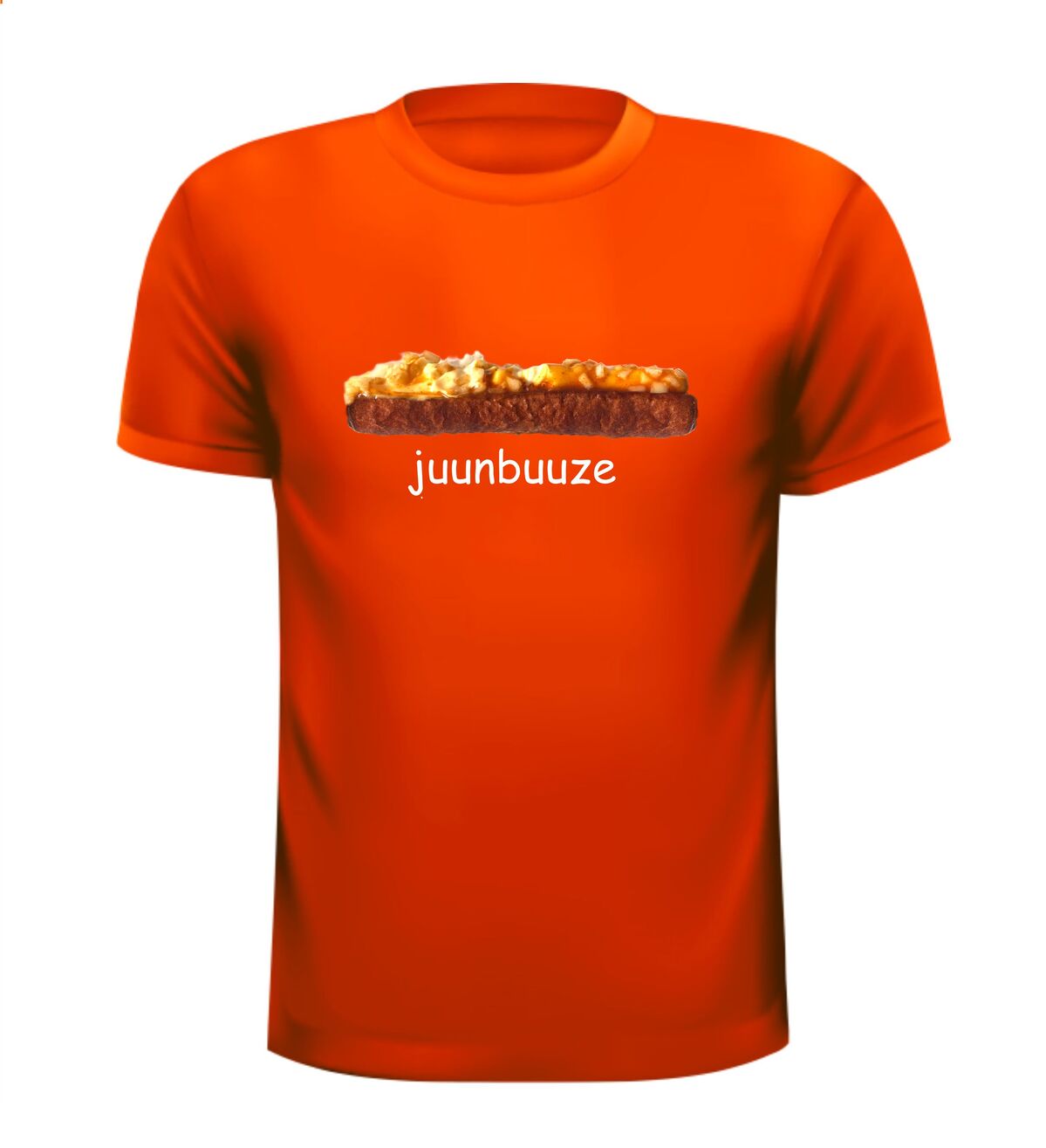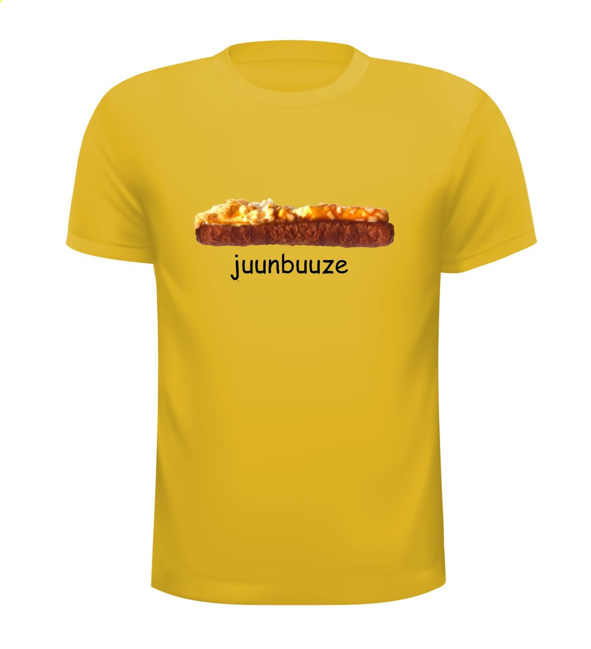 Enig idee wat een juunbuuze is? Dit is het Zeeuwse woord voor frikandel speciaal! Dit grappige T-shirt is voorzien van een juunbuuze!