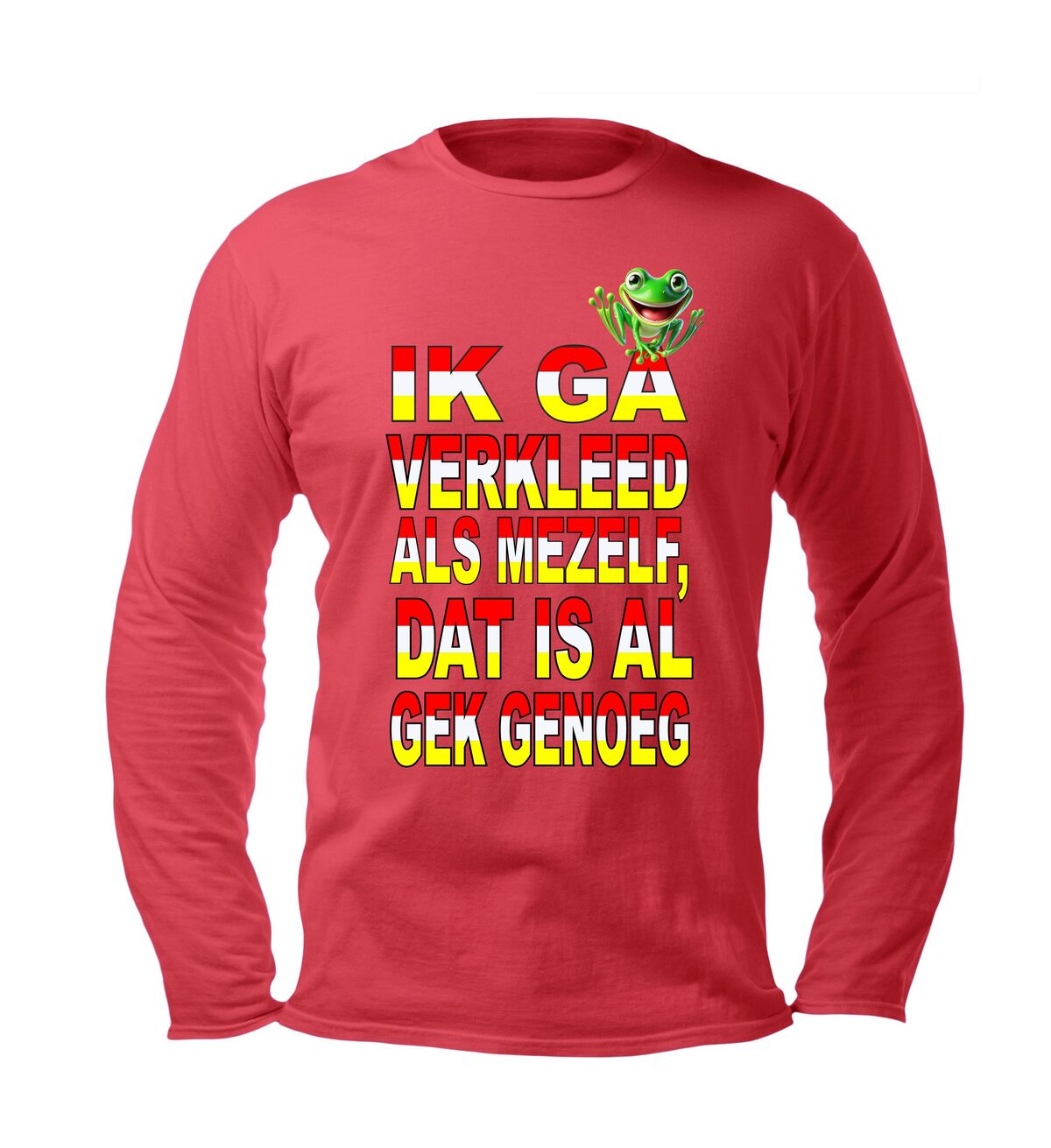 T-shirt lange mouw met de tekst Ik ga verkleed als mezelf, dat is al gek genoeg in de kleuren van Oeteldonk.