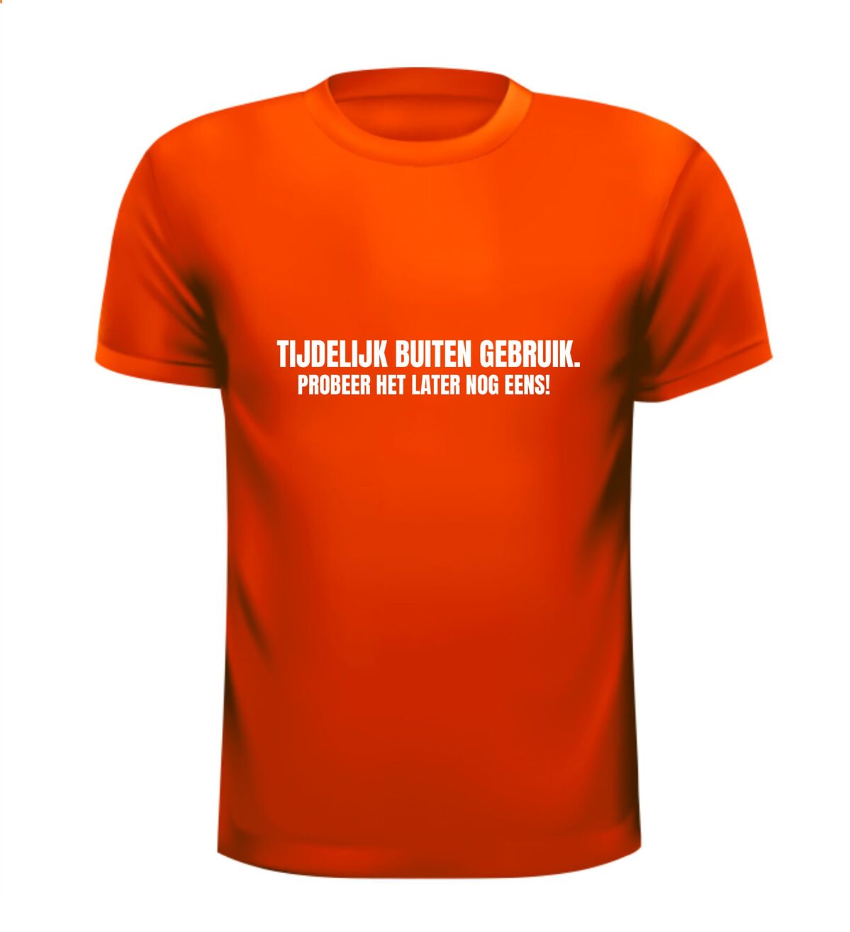 Een superleuk tekst T-shirt voor bijvoorbeeld Moederdag of Vaderdag. Op het T-shirt staat de tekst ‘Tijdelijk buiten gebruik. Probeer het later nog eens!’