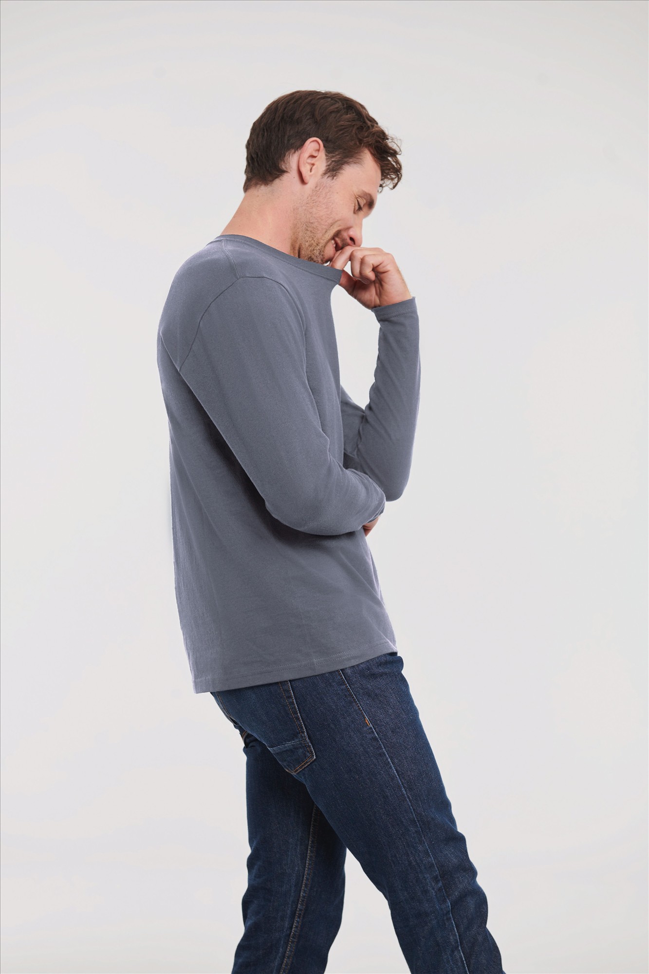 De Classic Long Sleeve T is de versie met lange mouwen van ons best verkochte Russell T-shirt, de Classic T. De tijdloze klassieke pasvorm, de hoogwaardige stof en productiekwaliteit zorgen voor een superieur draagcomfort en de beste printresultaten. Merk: Russell Classic Long Sleeve T. Materiaal:100% Ringspun katoen. Dike: 180 g/m2. Land van herkomst: Morocco. De foto met het model is bedoeld om de sfeer weer te geven. Let alstublieft niet op de kleur.