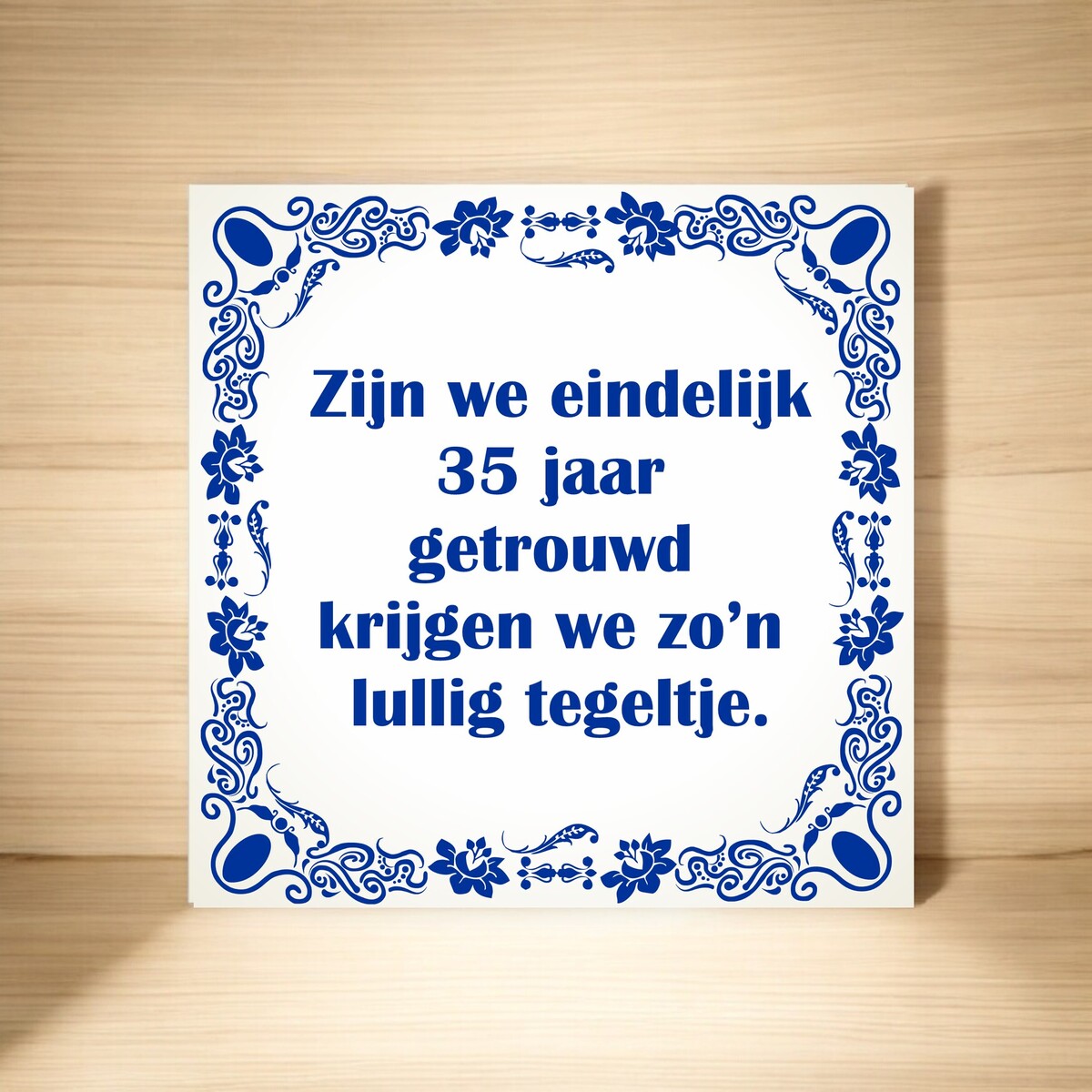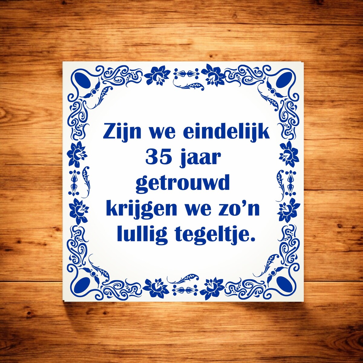 Op deze spreukentegel staat de grappige en orginele tekst: Zijn we eindelijk 35 jaar getrouwd krijgen we zo'n lullige tegel. Het tegeltje heeft een afmeting van 15cm x 15cm.