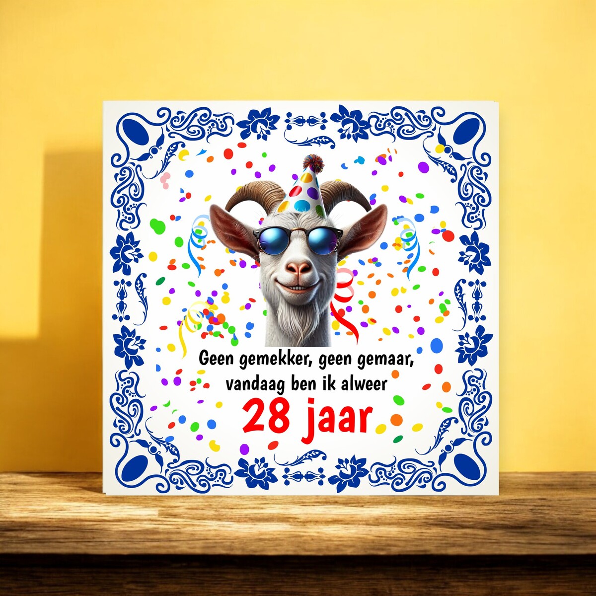 Het is mogelijk om dit artikel volledig uniek en persoonlijk te maken! Je kan volledig creatief aan de slag gaan en alles naar jouw smaak maken. Of je nu van een strakke simplistische designs houdt, gekke kleuren of van drukke prints, het is allemaal aan jou. Natuurlijk ook leuk om online te ontwerpen en weg te geven als cadeau. Of voor groepsactiviteiten waar je als één groep een eenheid wilt uitstralen. Met onze simpele ontwerptool en uitstekende service heb jij je unieke produkt snel in huis. personaliseer Tegel verjaardag 28 jaar met geit en leuke tekst Gepersonaliseerd zijn de leukste cadeaus om te krijgen!